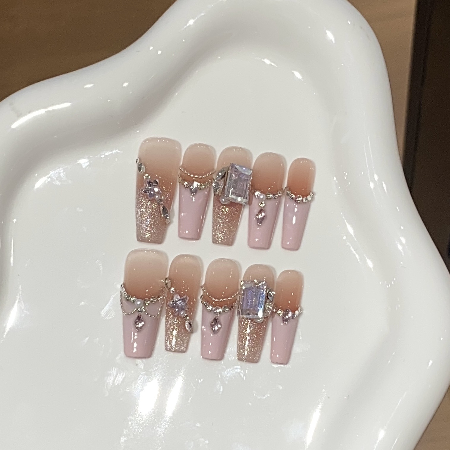 一只顾美甲 纯欲甜美款冰透粉色法式侧光猫眼珍珠链条碎钻娇滴滴