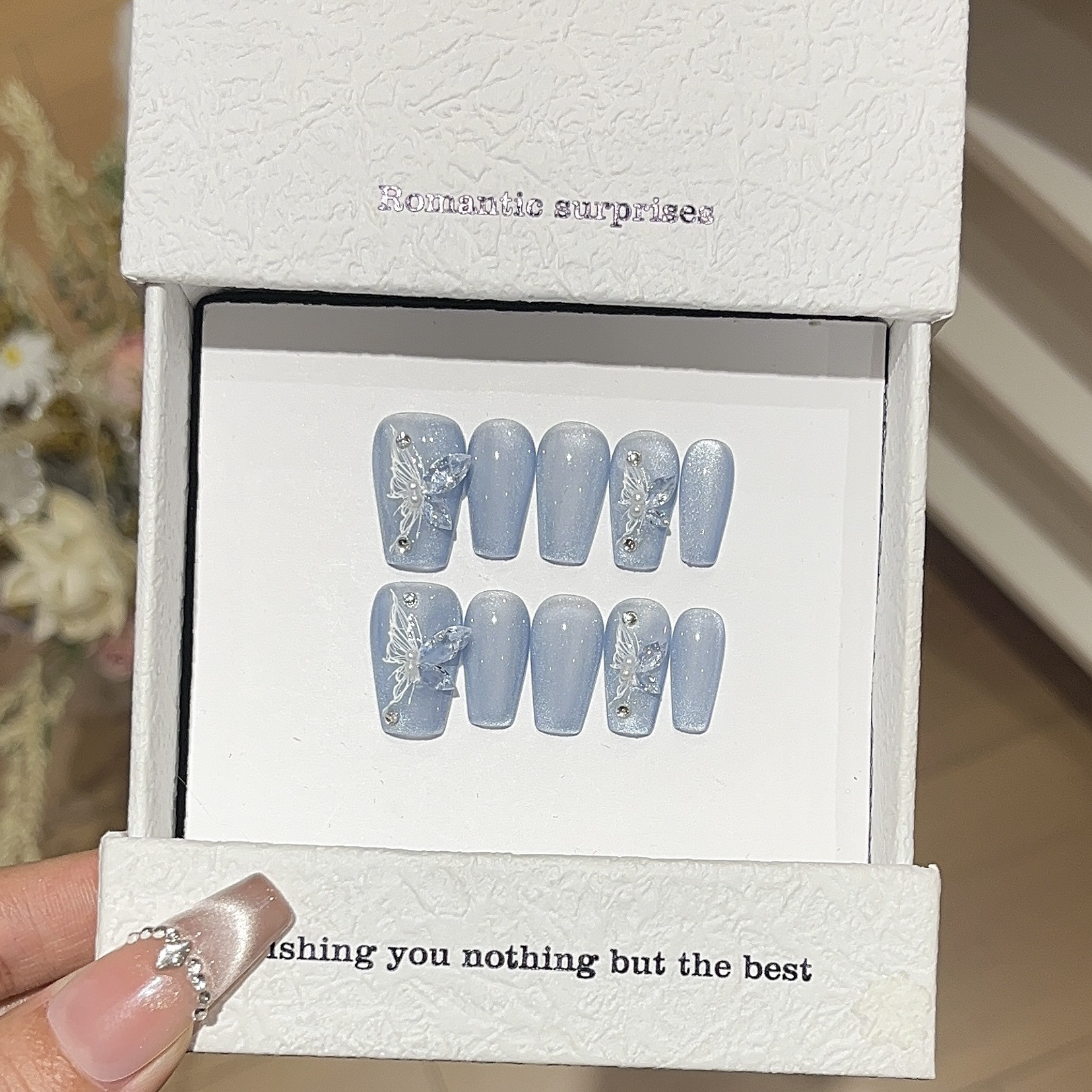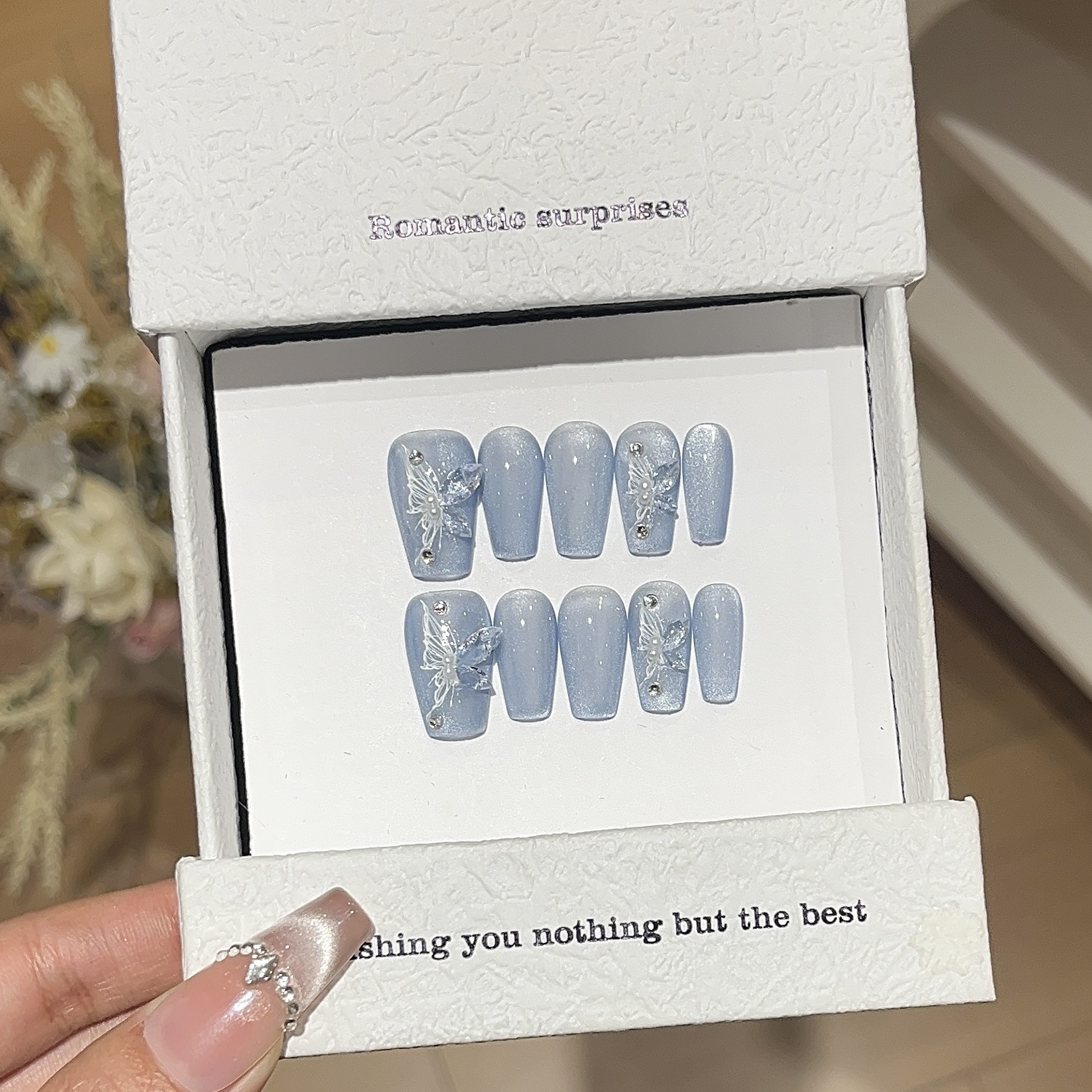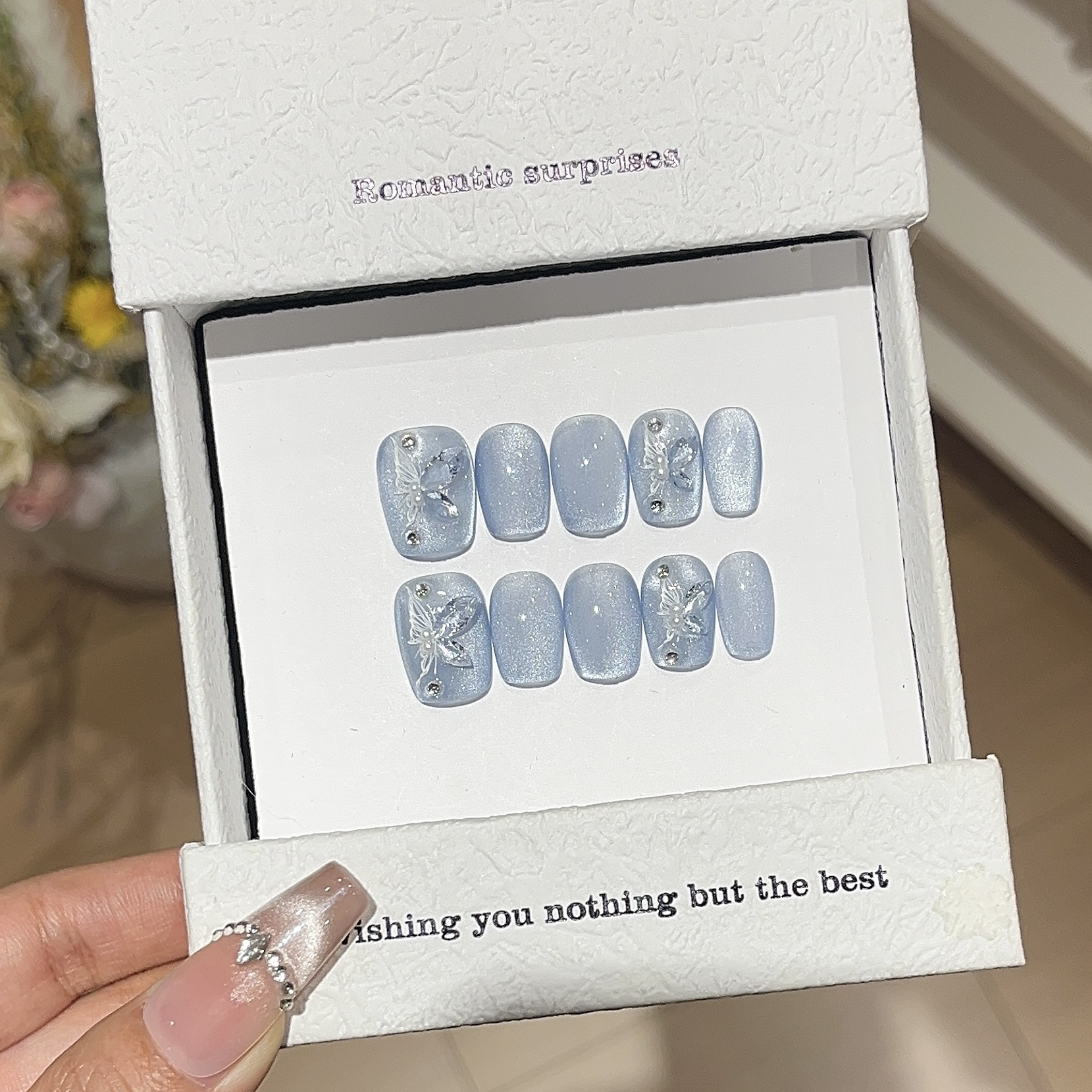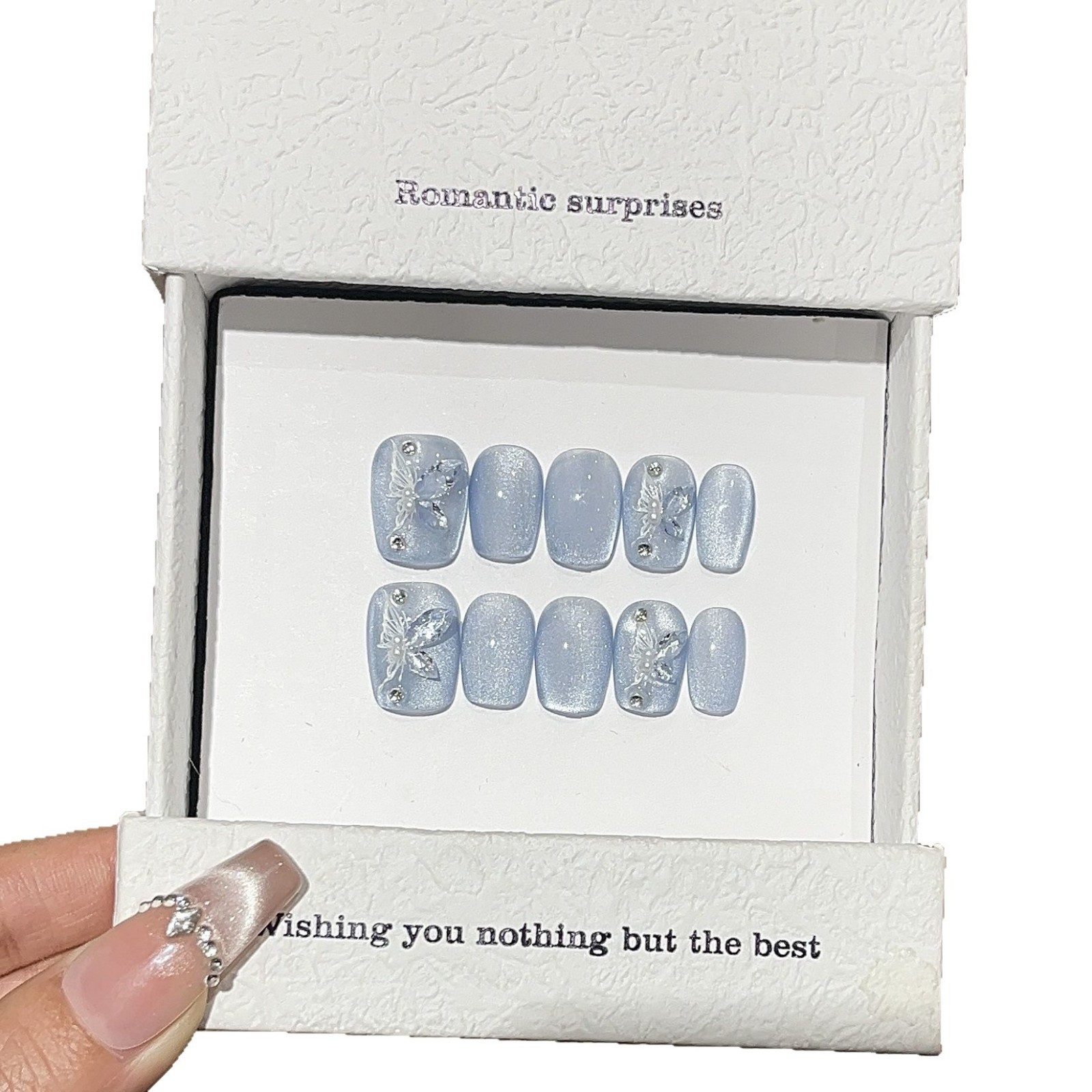 一只顾美甲 夏日清爽冰川蓝猫眼浮雕立体碎钻蝴蝶莱茵河指甲贴片
