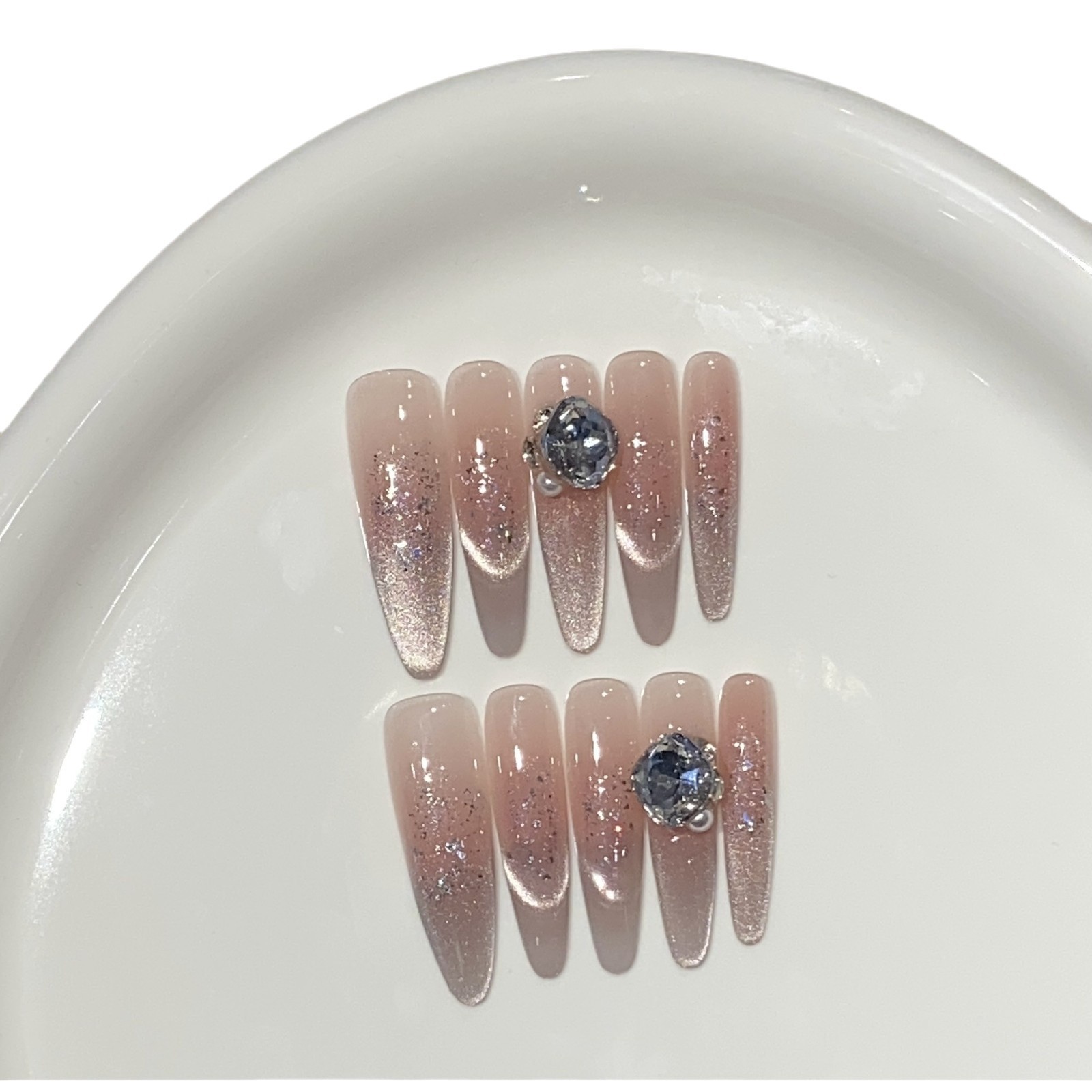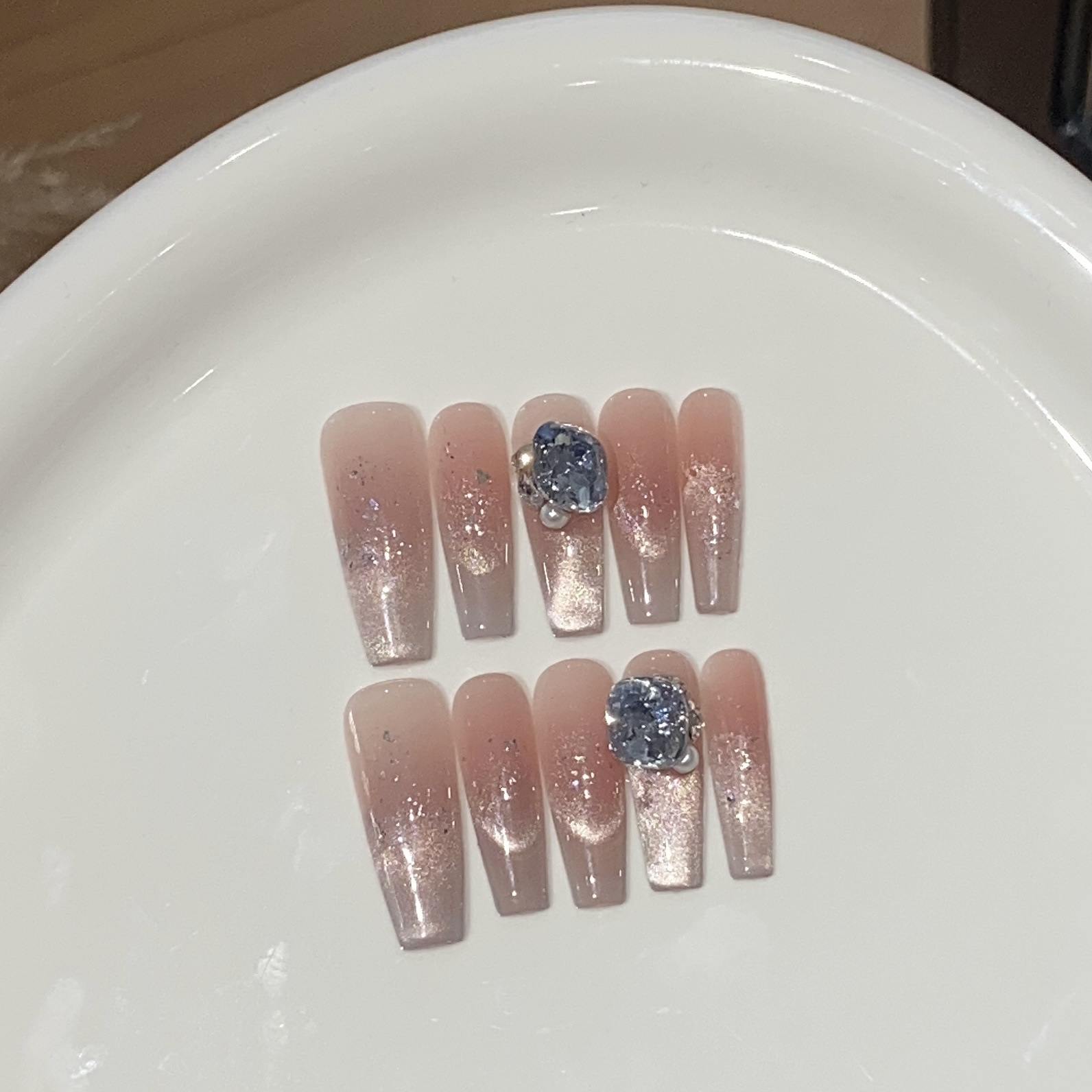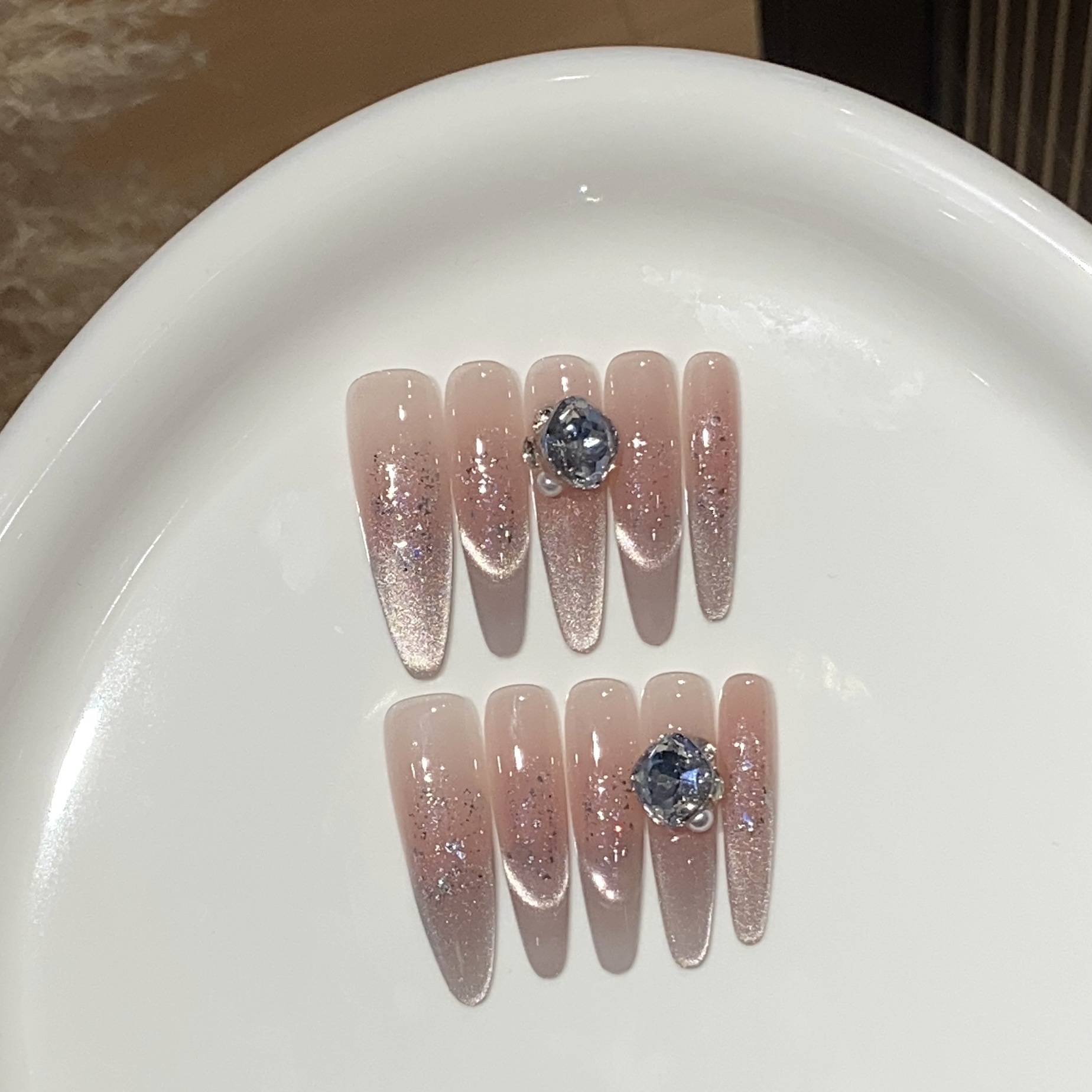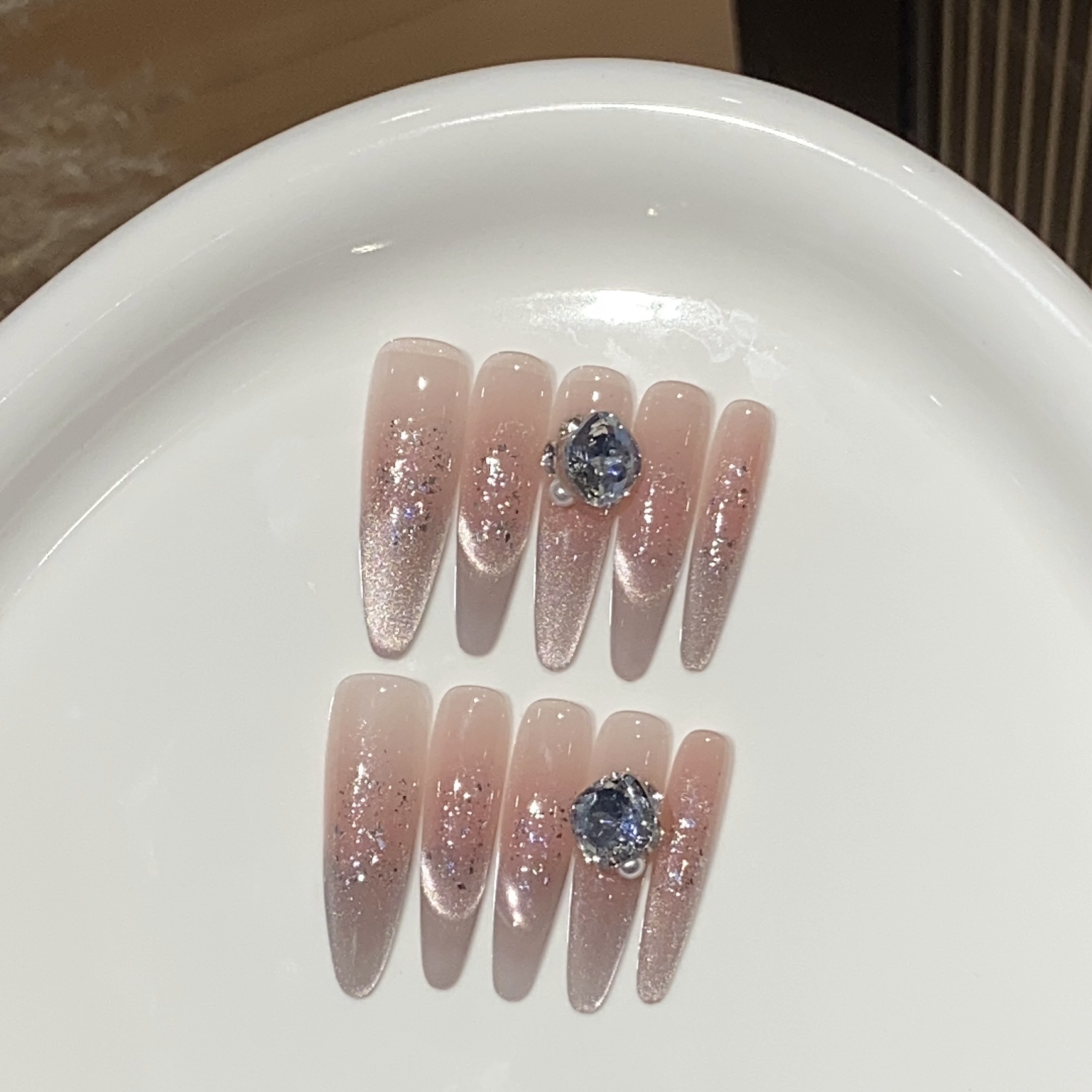 一只顾美甲 纯欲冰透粉微笑猫眼亮片珍珠堆堆方钻暧昧贴片穿戴甲