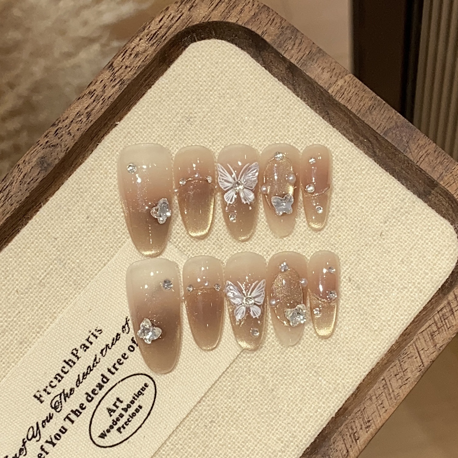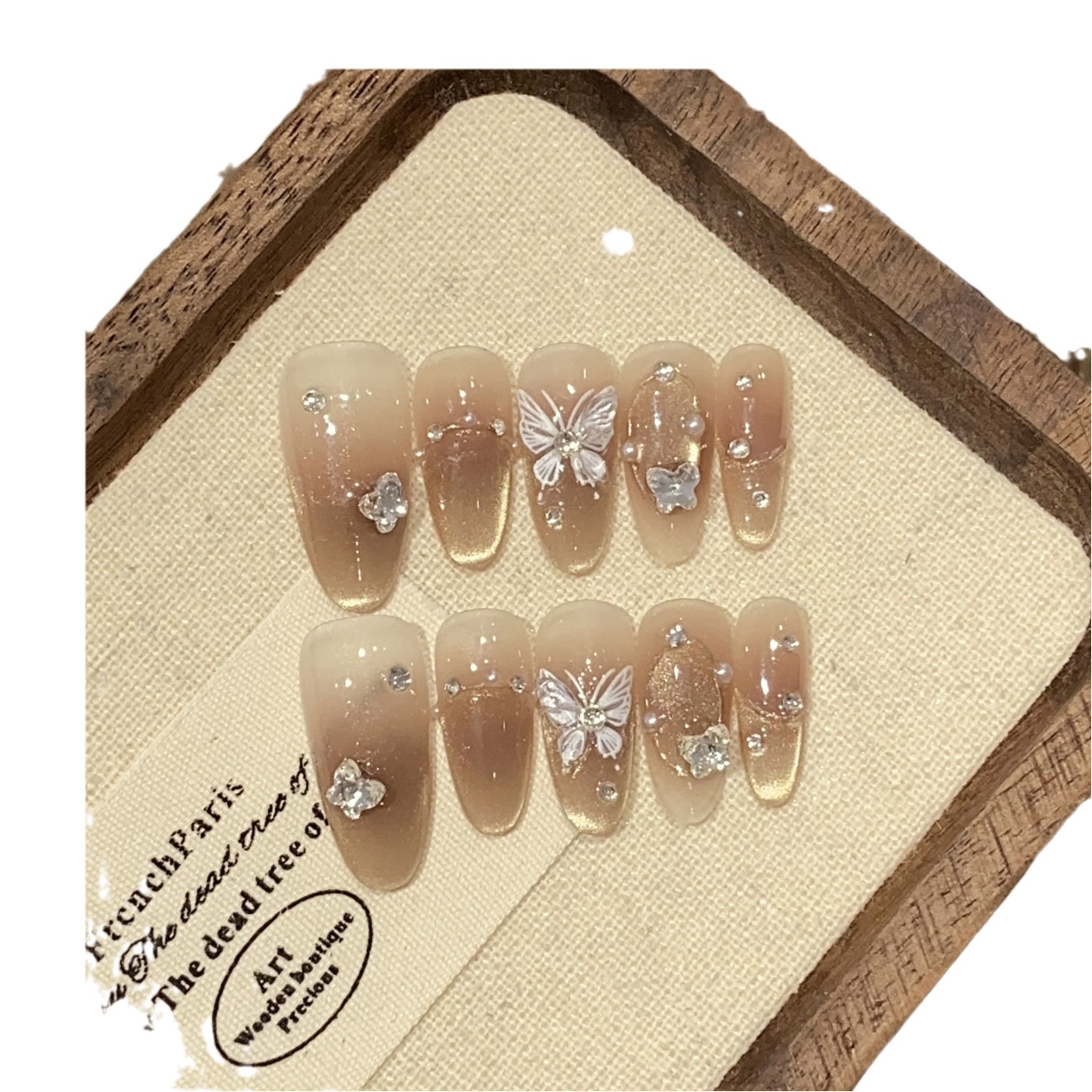 一只顾美甲 手工冰透金色侧光猫眼蝴蝶贴纸小碎钻蝴蝶猫眼穿戴甲