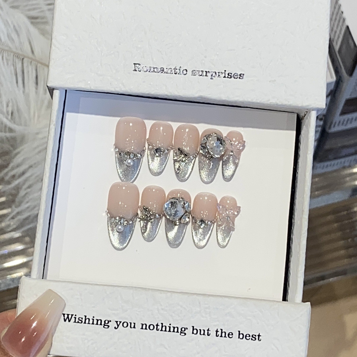 一只顾美甲 冰透蓝色侧光法式猫眼碎钻蝴蝶蓝极星可拆卸穿戴甲片