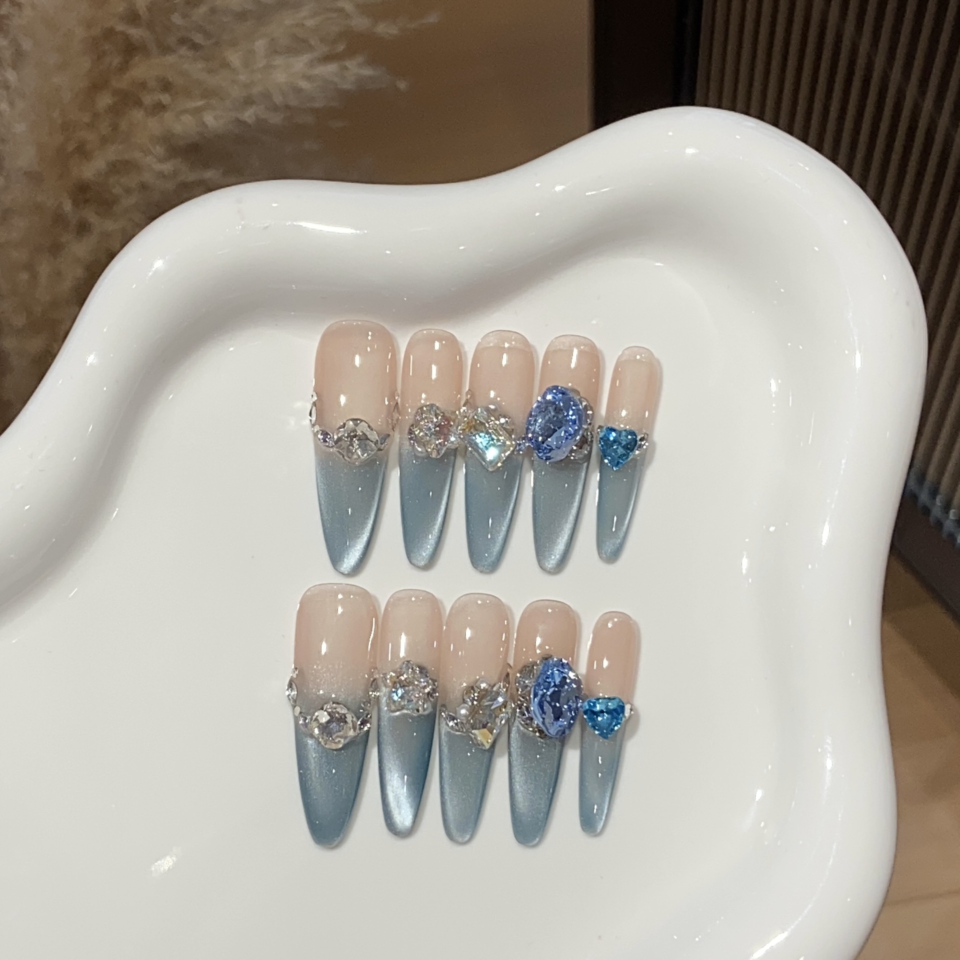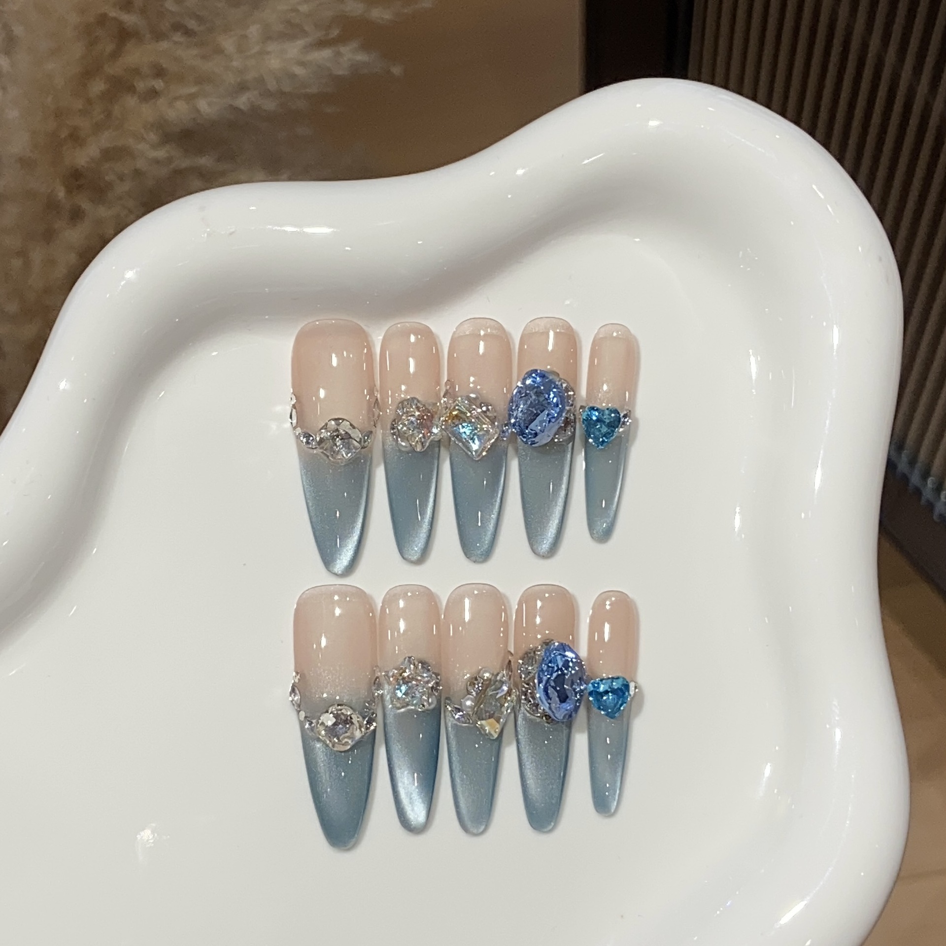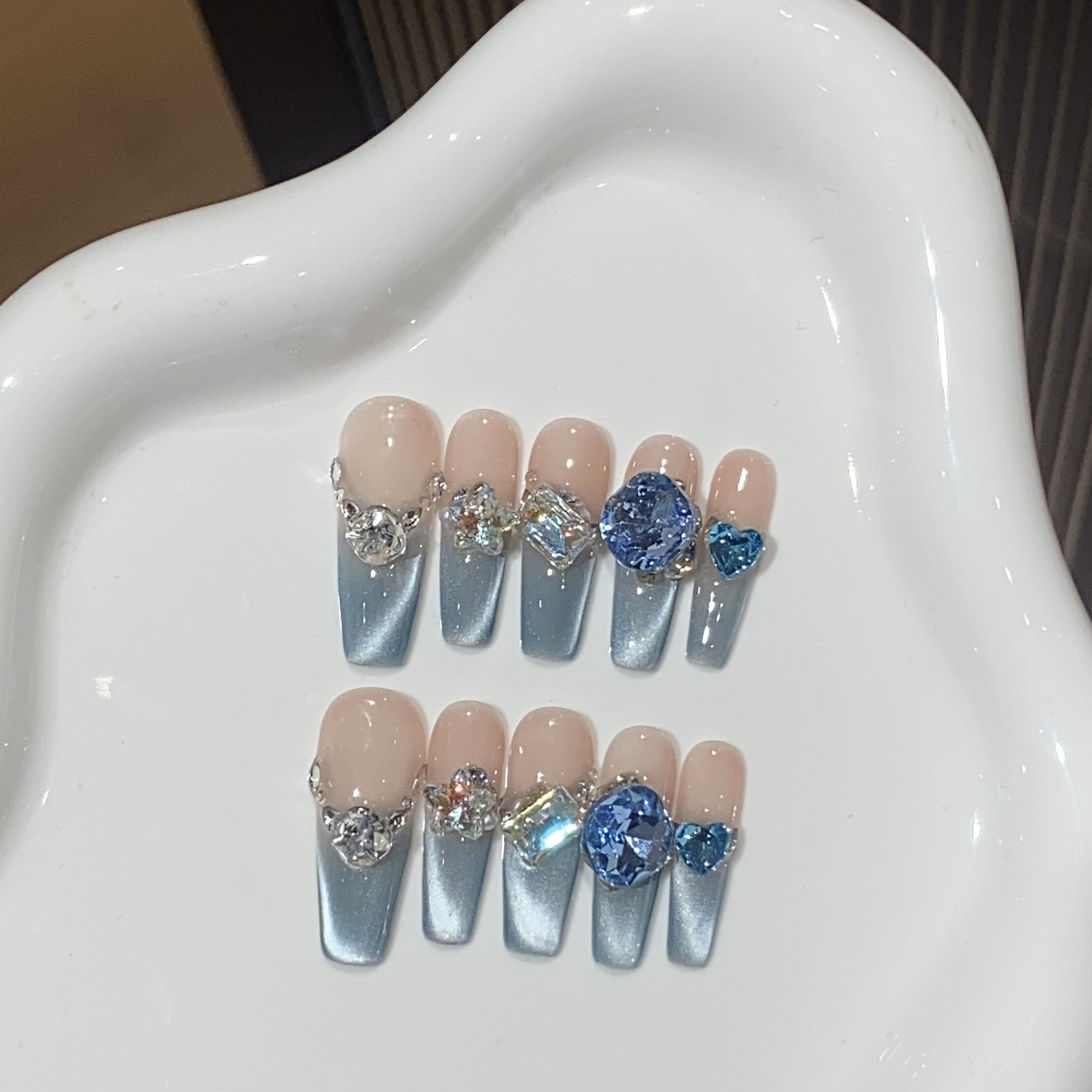 一只顾美甲 纯手工蓝色渐变侧光猫眼法式堆钻天鹅蓝钻蓝色多瑙河
