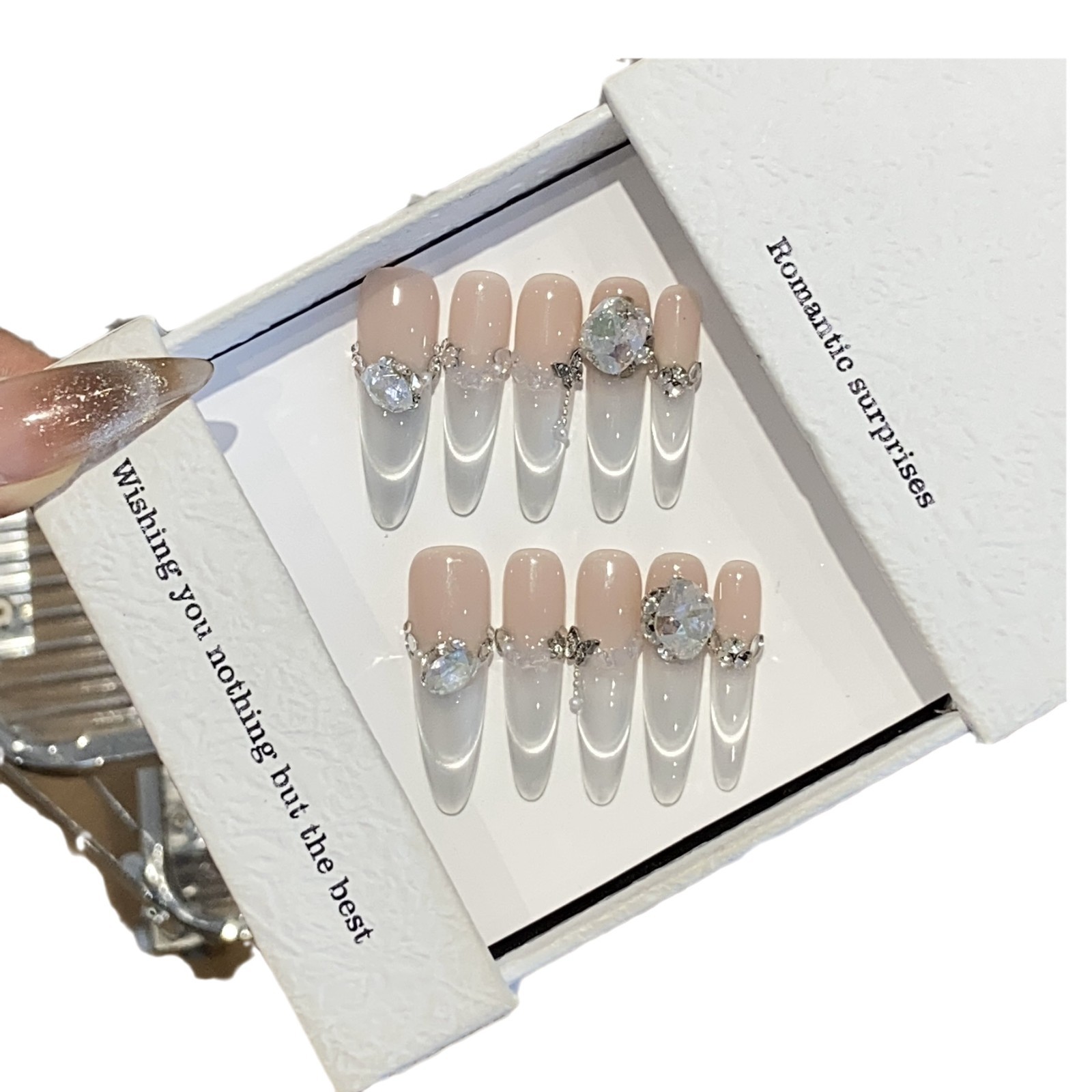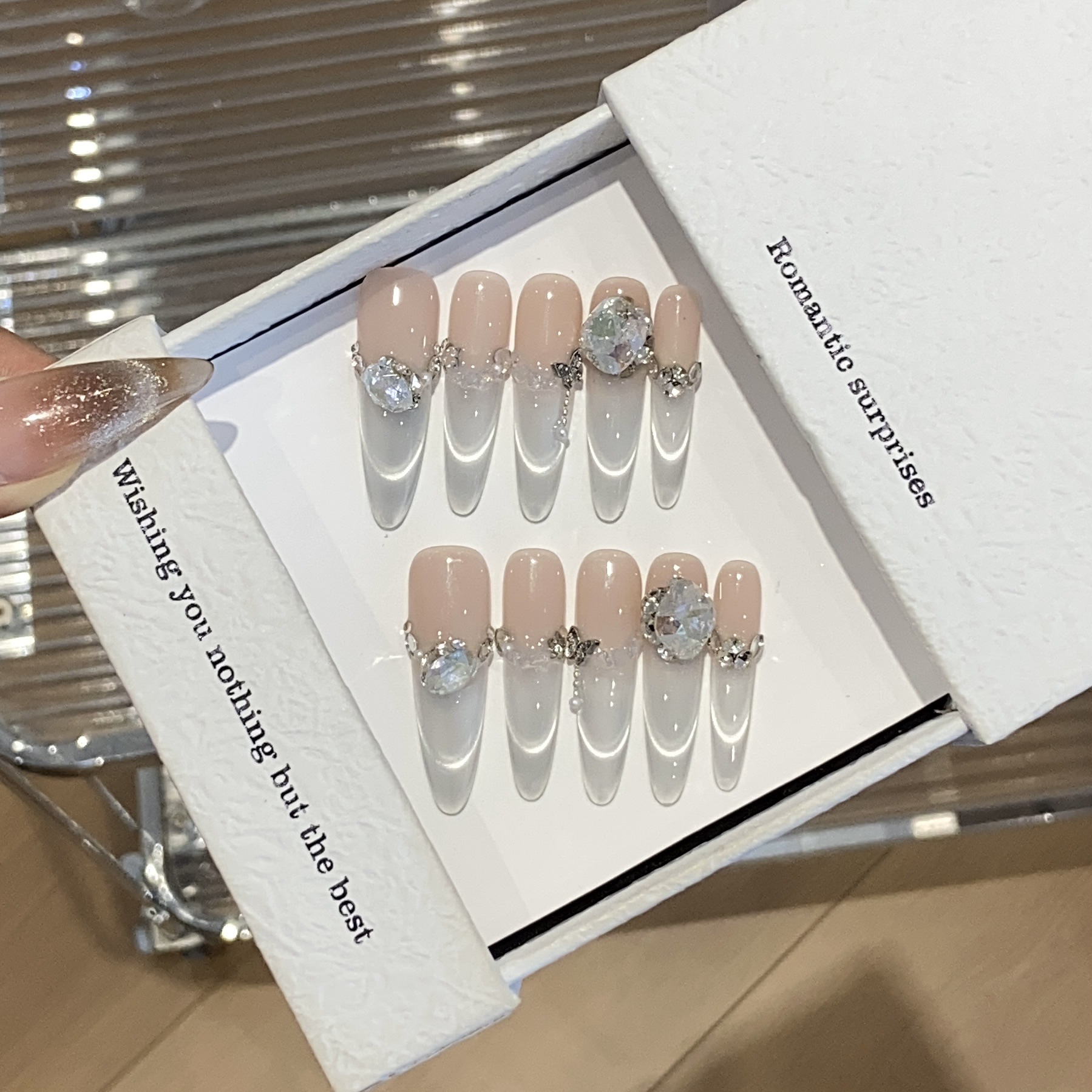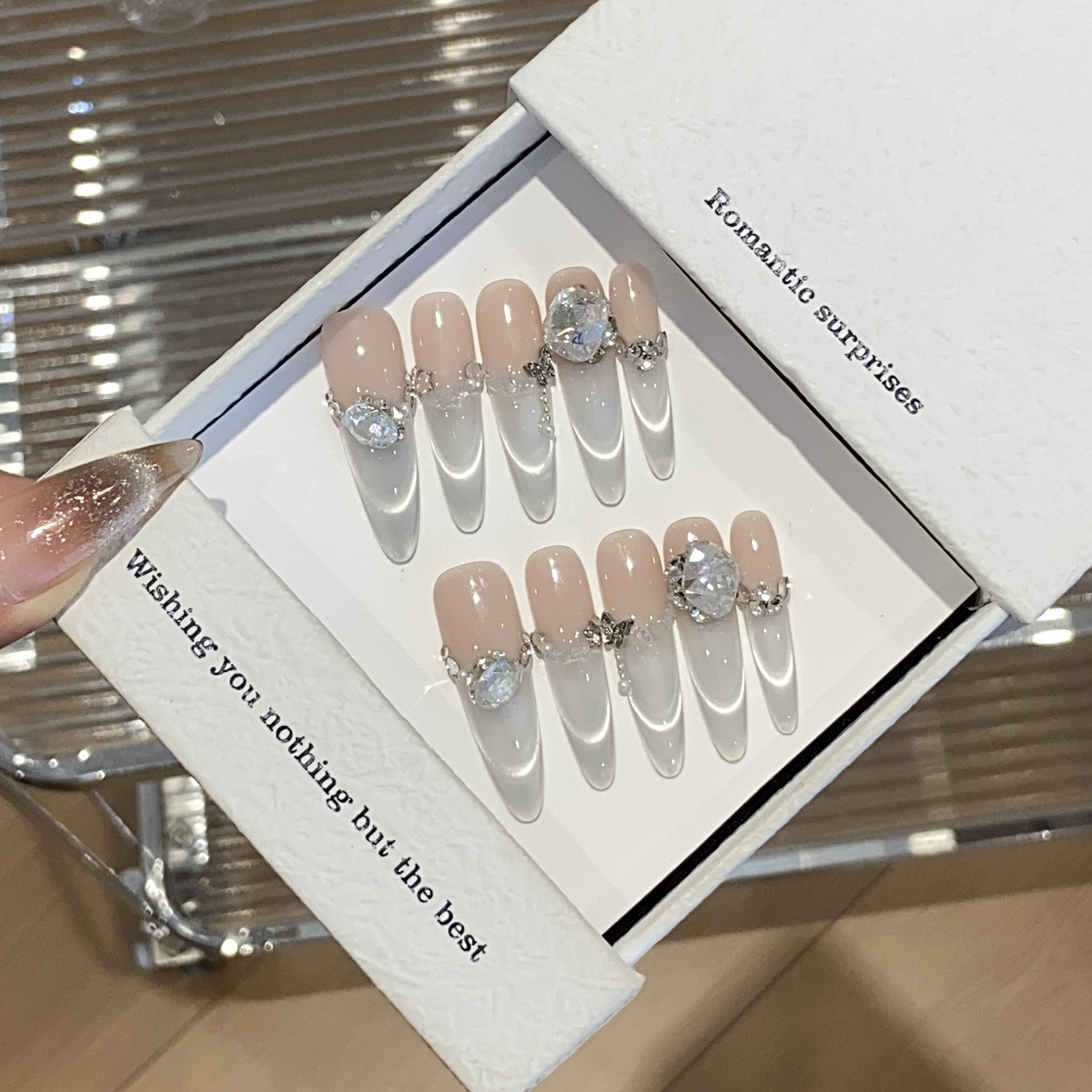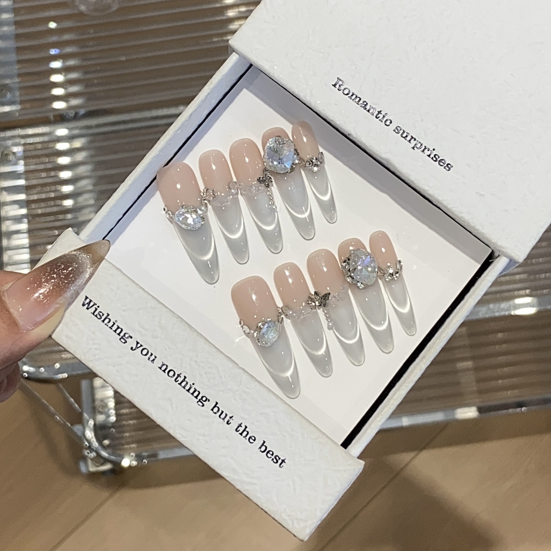 一只顾美甲 显白冰透蓝渐变微笑法式猫眼精品K9钻融雪之时穿戴甲