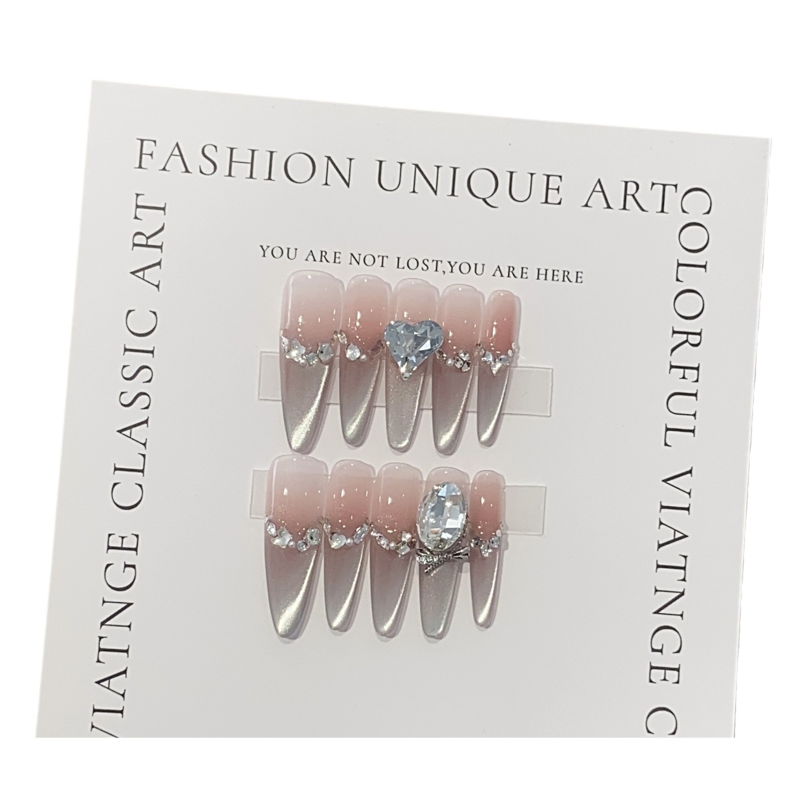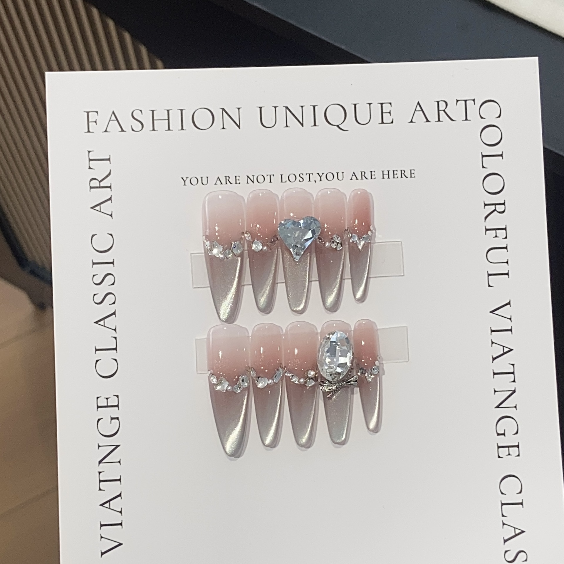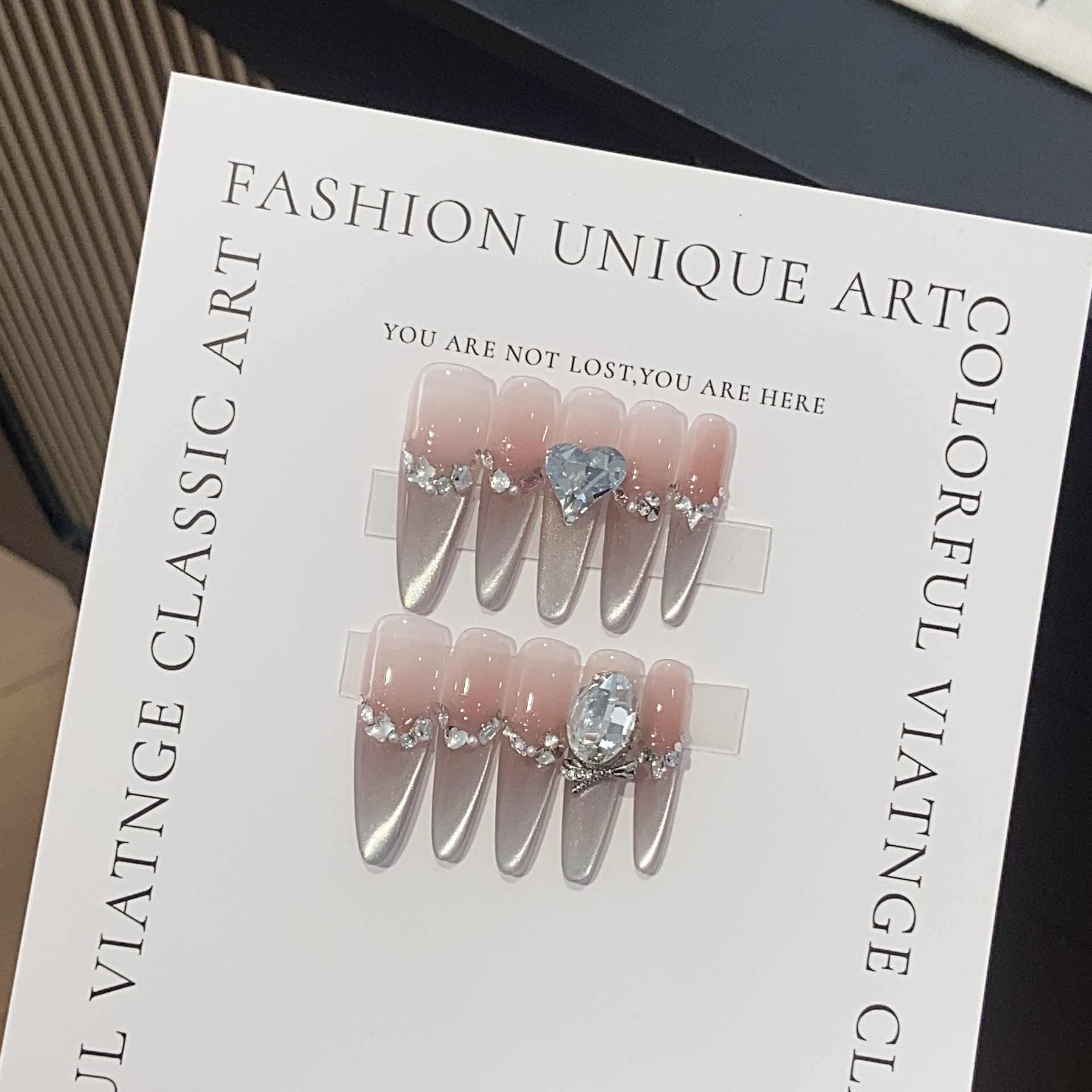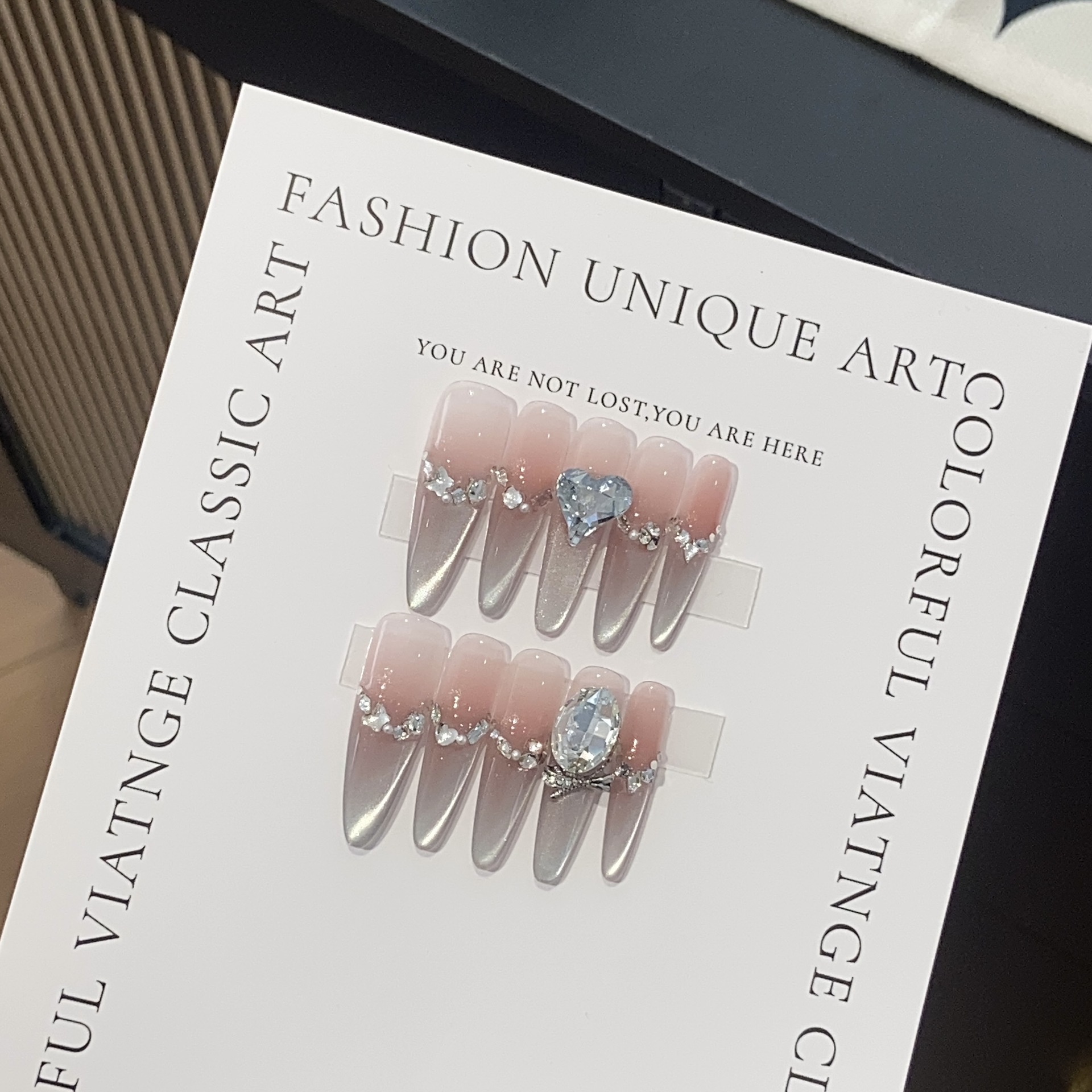 一只顾美甲 冰透蜜桃粉渐变侧光猫眼珍珠小碎钻啵冰白桃指甲贴片