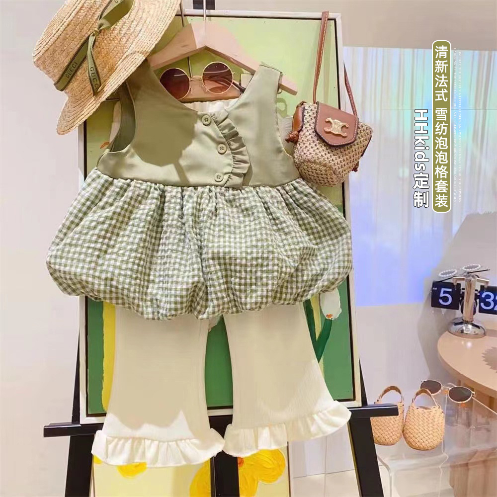 新品女童套装不规则格子花苞娃娃背心喇叭长裤两件套2025夏装