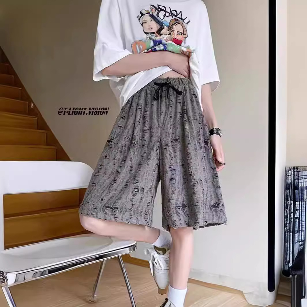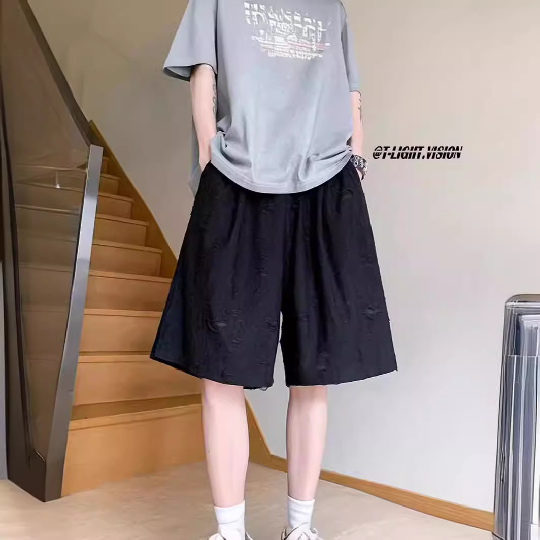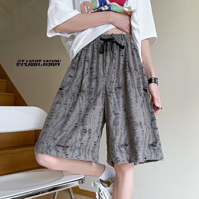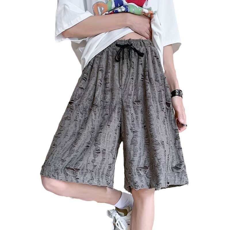 ins高街破洞休闲裤男士夏季冰丝外穿沙滩裤复古oversize宽松百搭