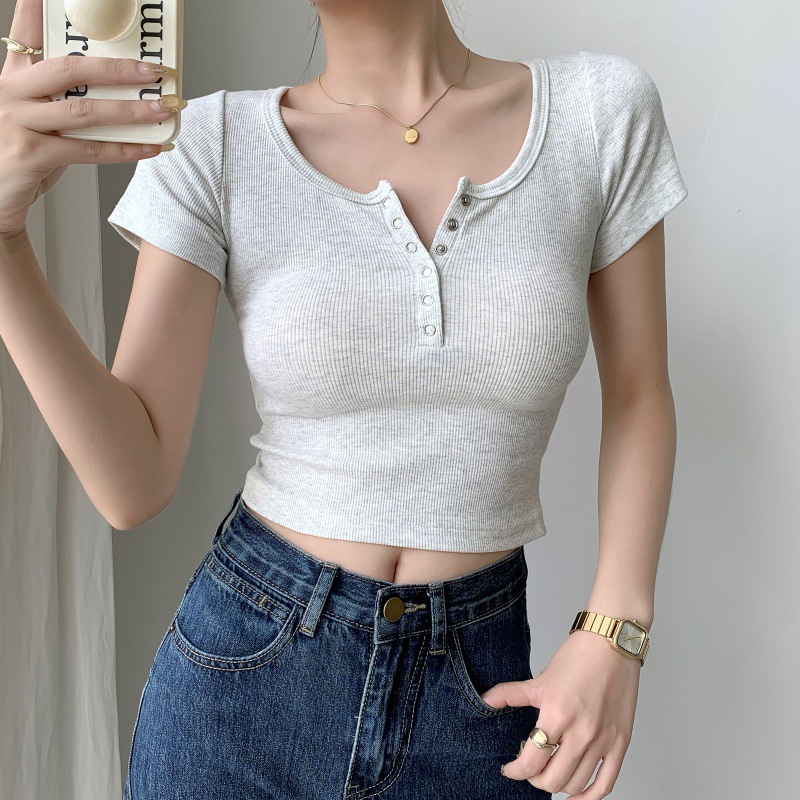 辣妹U领纽扣T恤女夏季修身显瘦正肩短袖螺纹小个子短款上衣潮