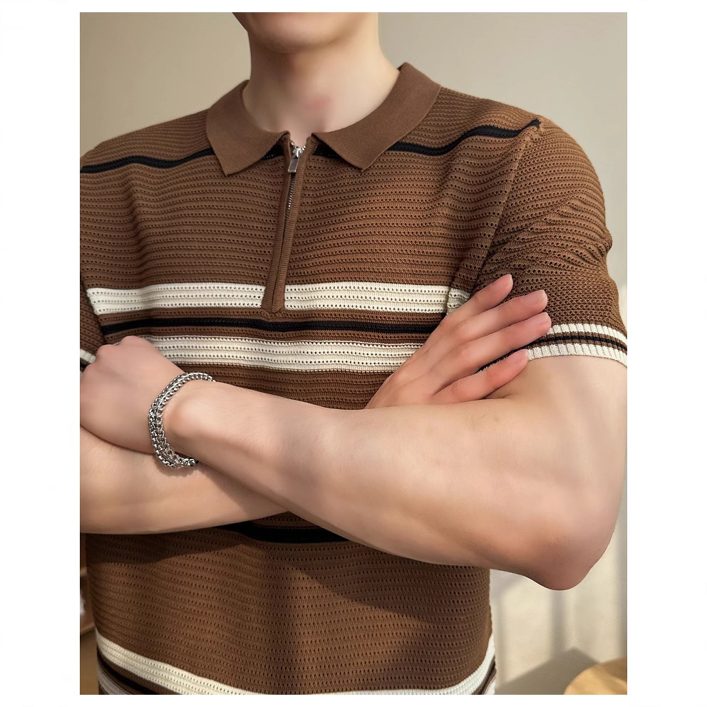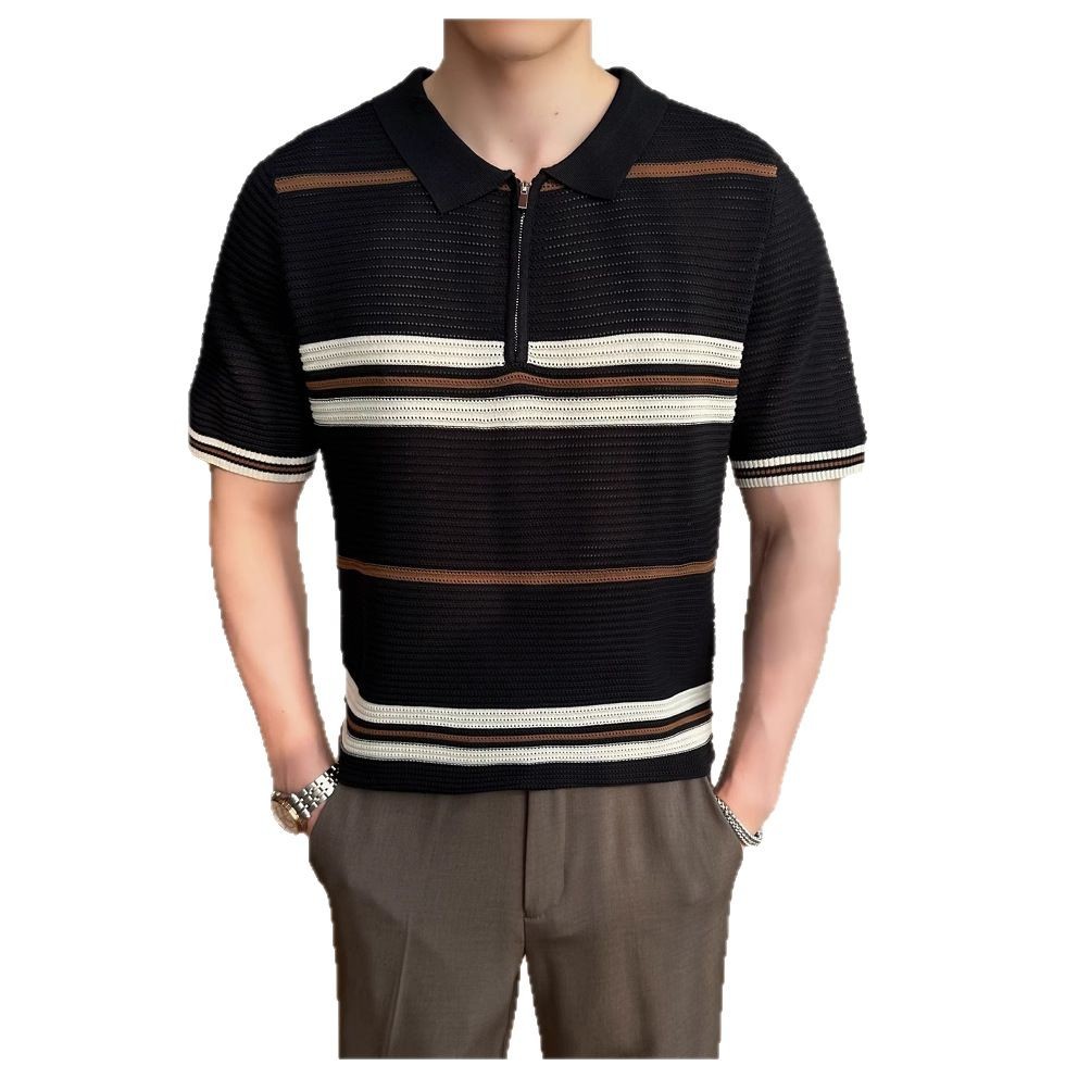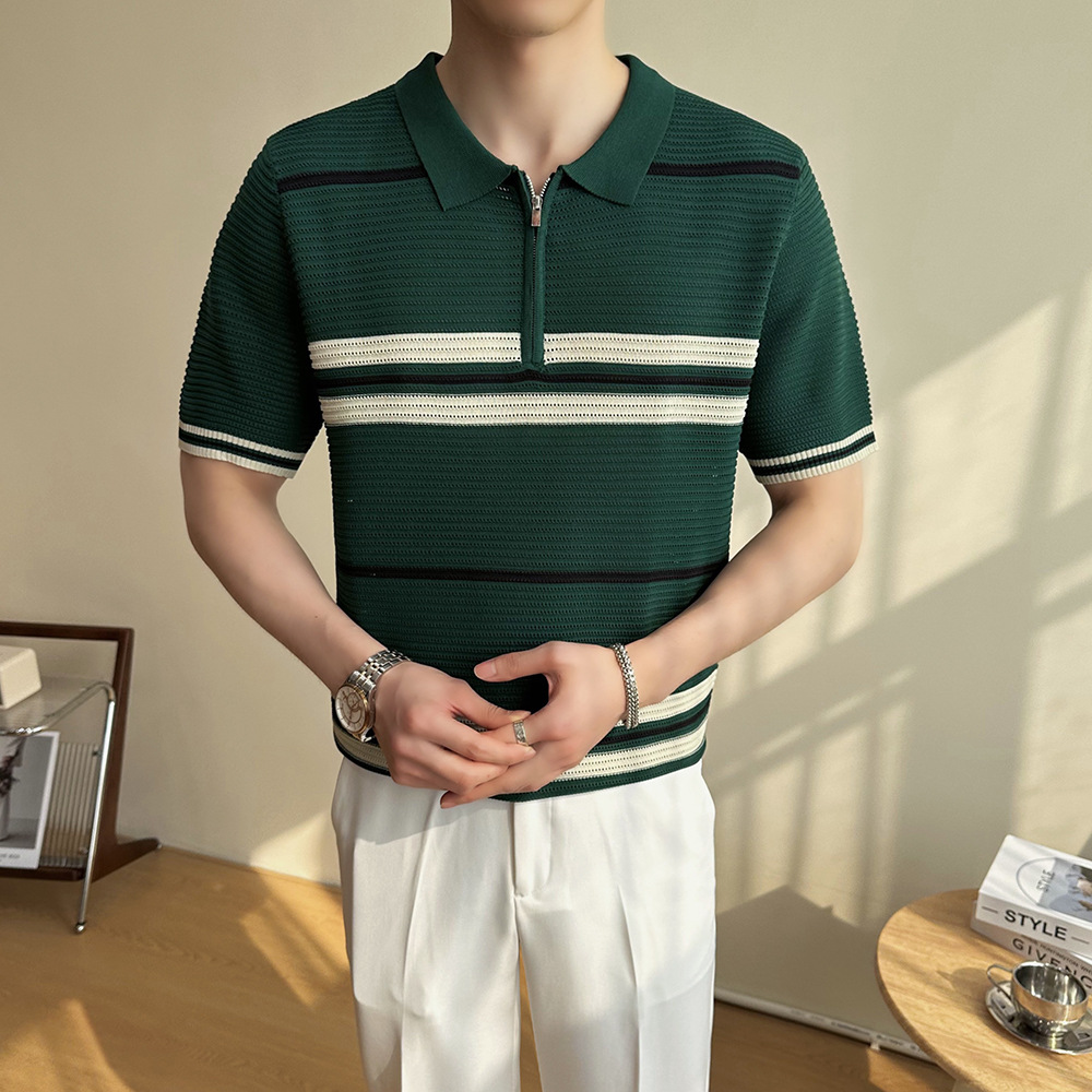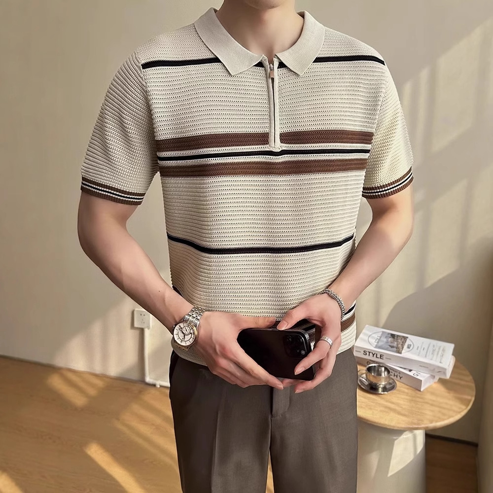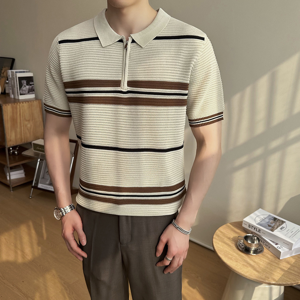冰丝条纹针织短袖POLO衫男士2025夏季透气休闲宽松翻领T恤保罗衫