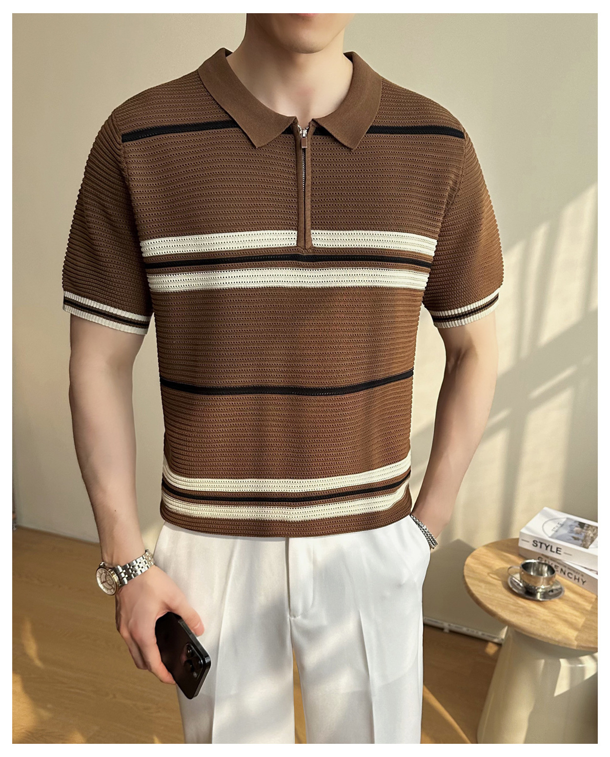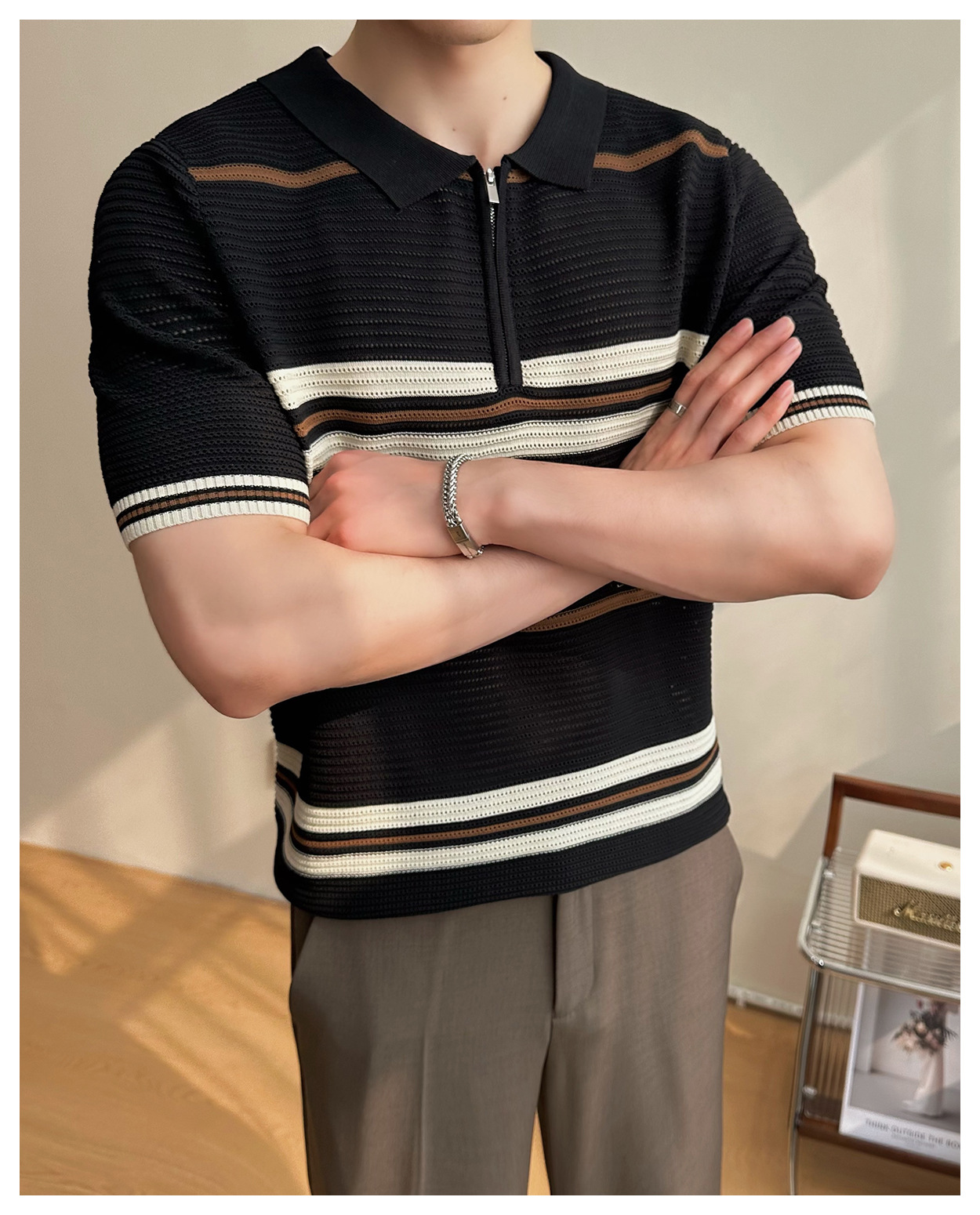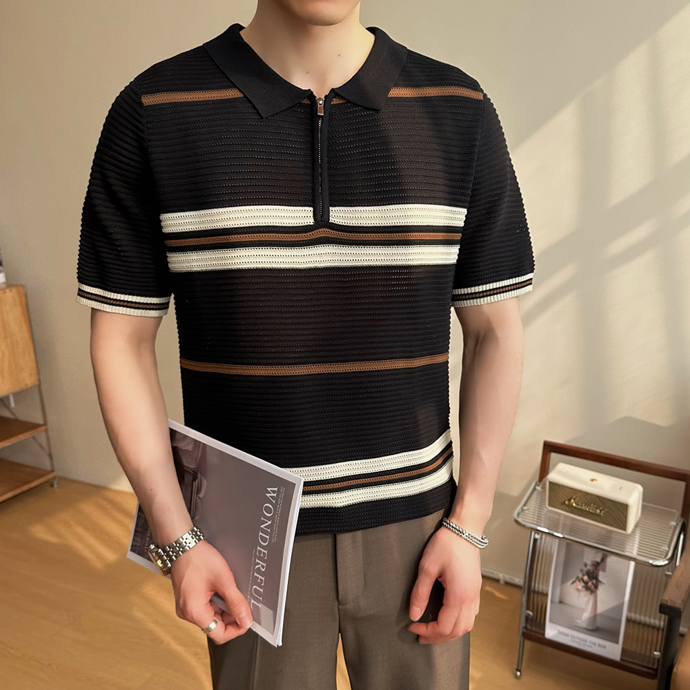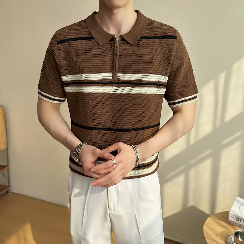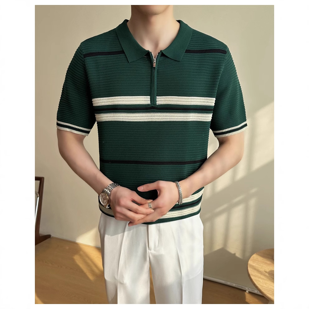 冰丝条纹针织短袖POLO衫男士2025夏季透气休闲宽松翻领T恤保罗衫