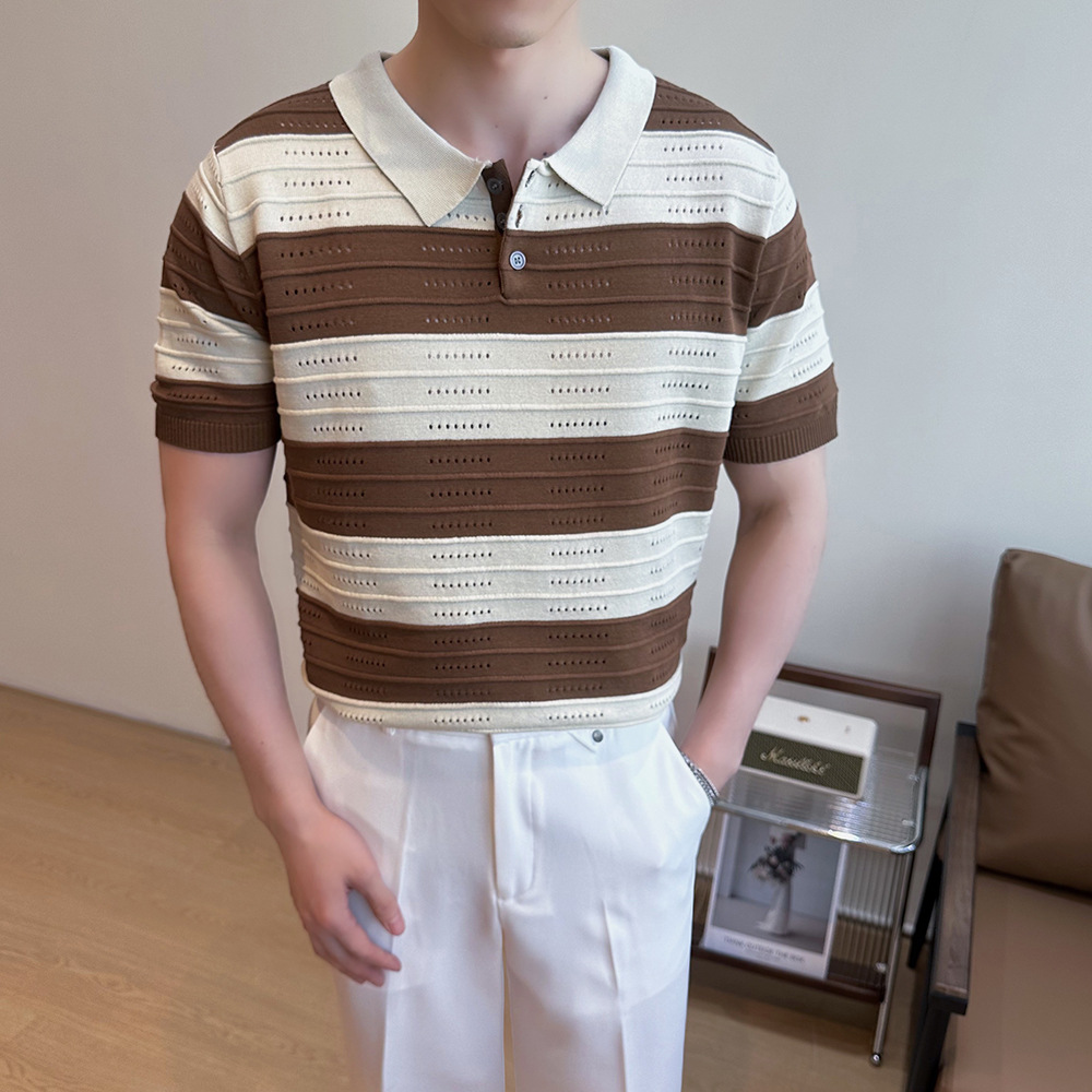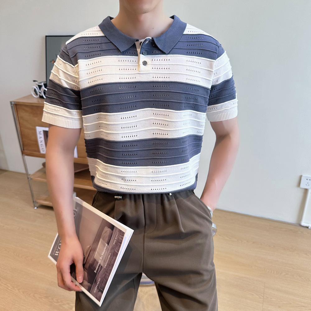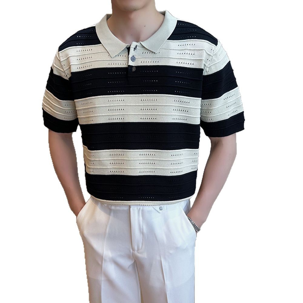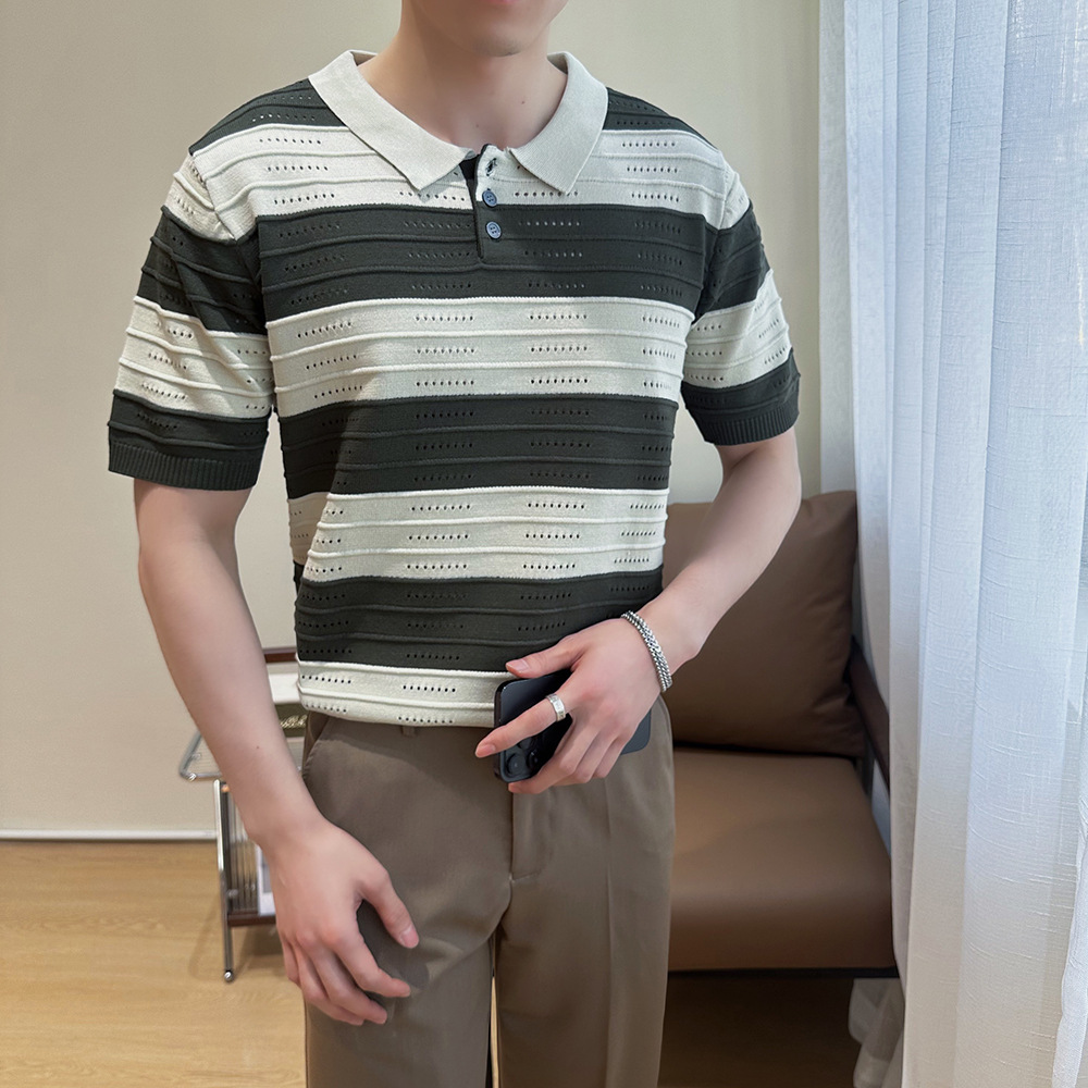 2025夏季男装翻领条纹针织POLO衫男士半袖镂空短袖设计感体恤冰丝