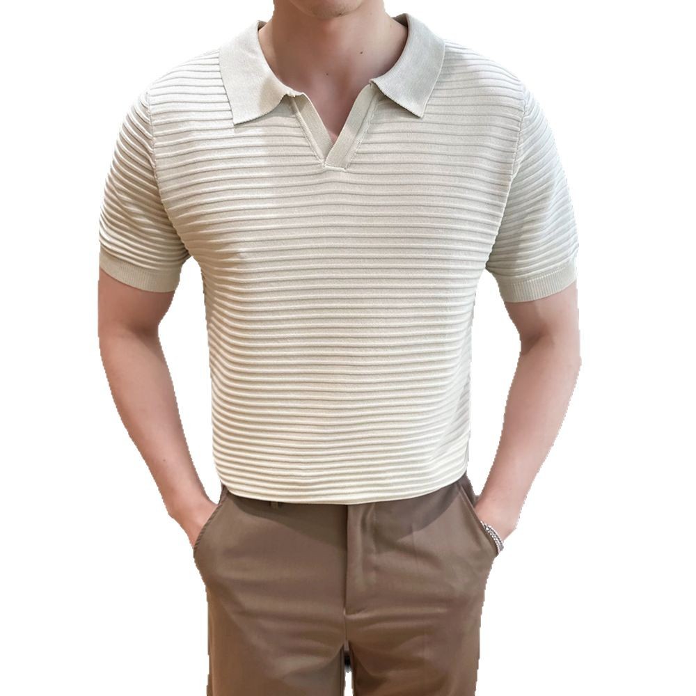 2025夏季男装宽松暗条纹V领针织衫男士冰丝面料休闲POLO衫翻领T恤