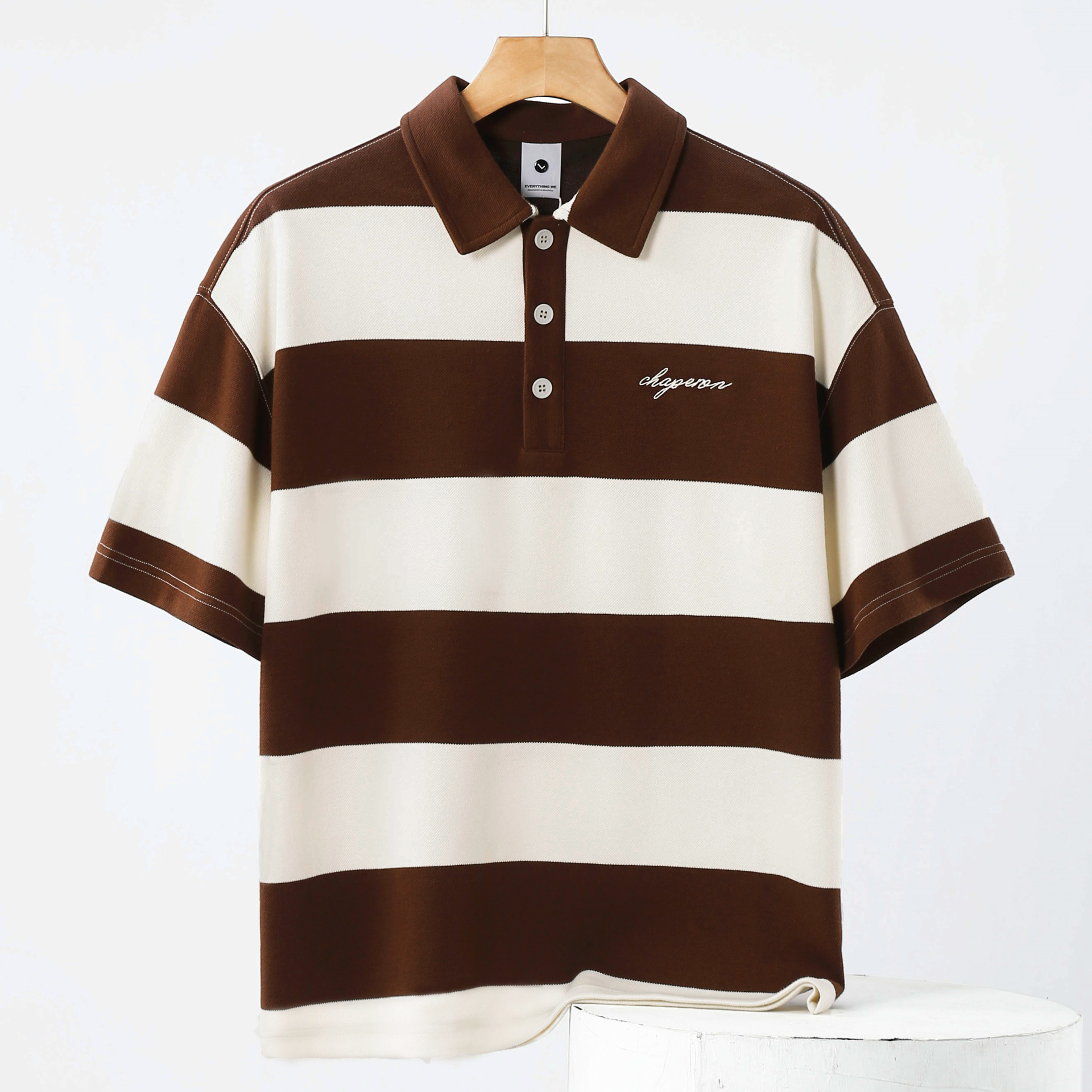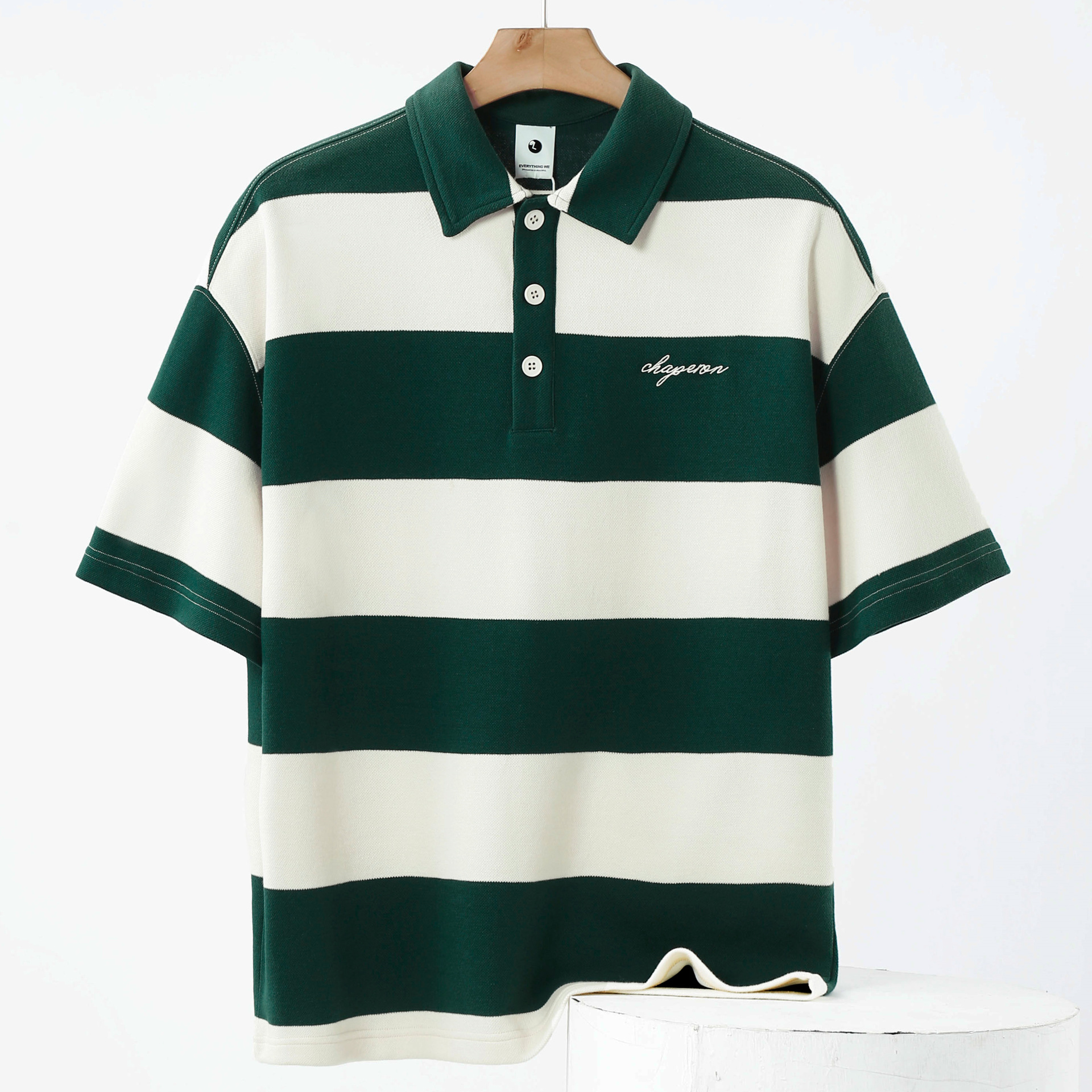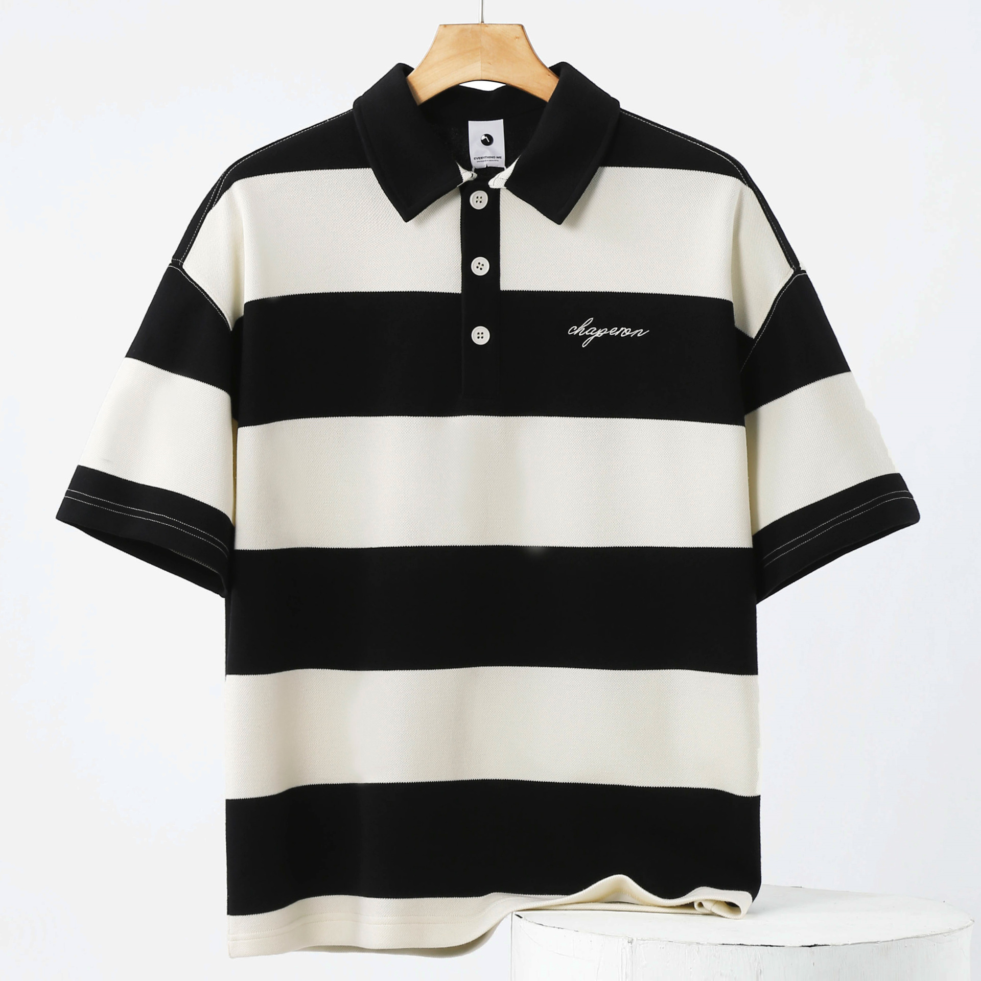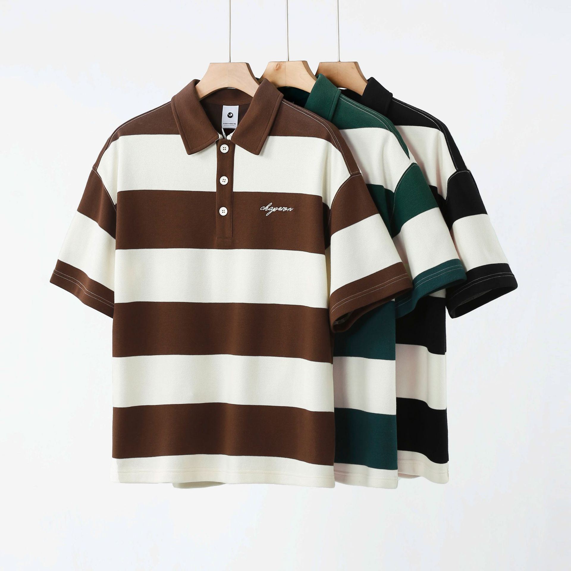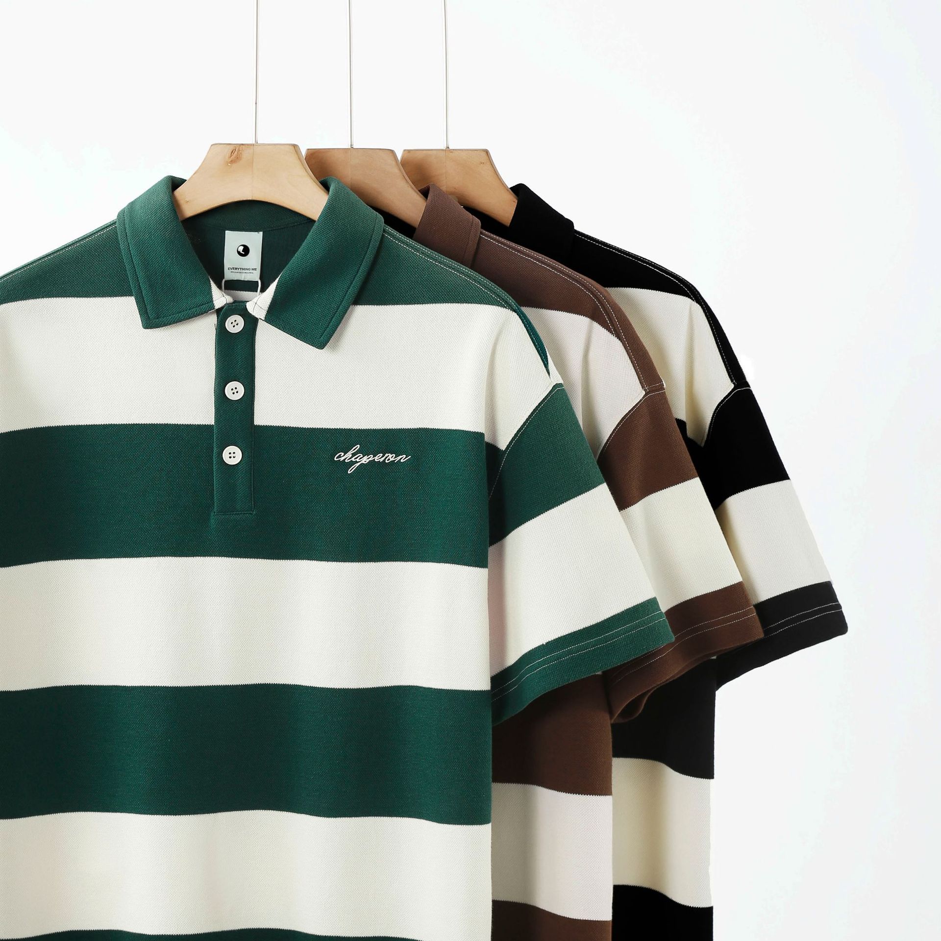 日系条纹刺绣polo衫男士夏季新款撞色宽松休闲翻领重磅潮牌打底衫