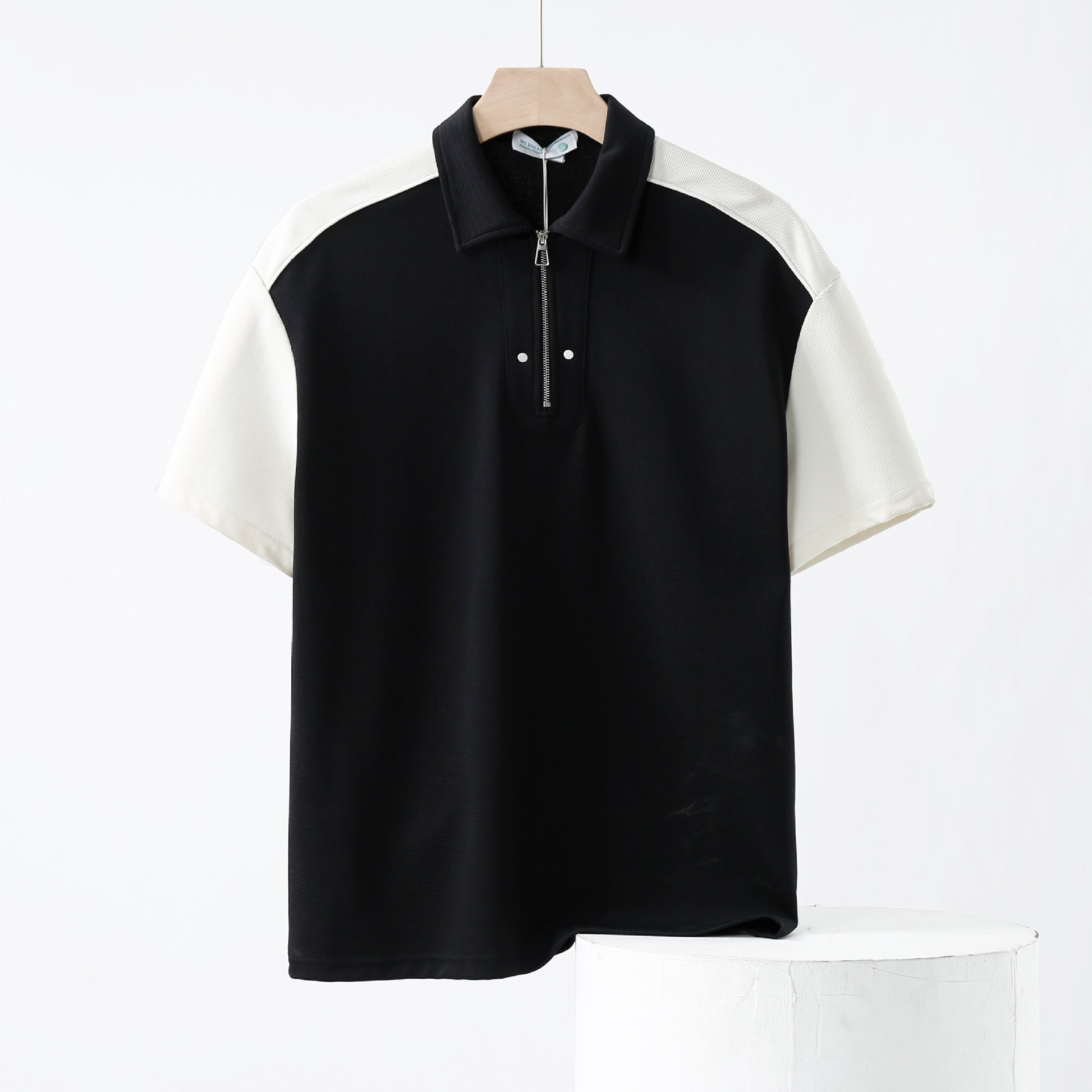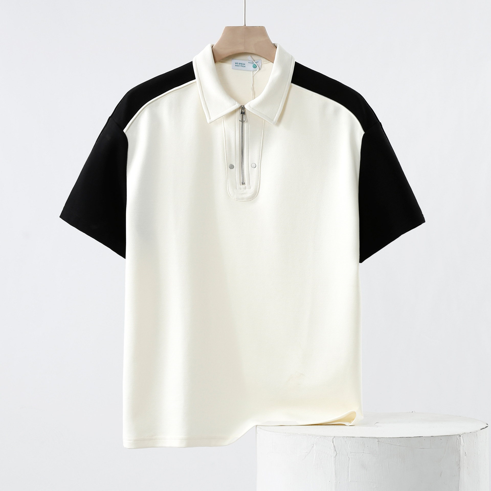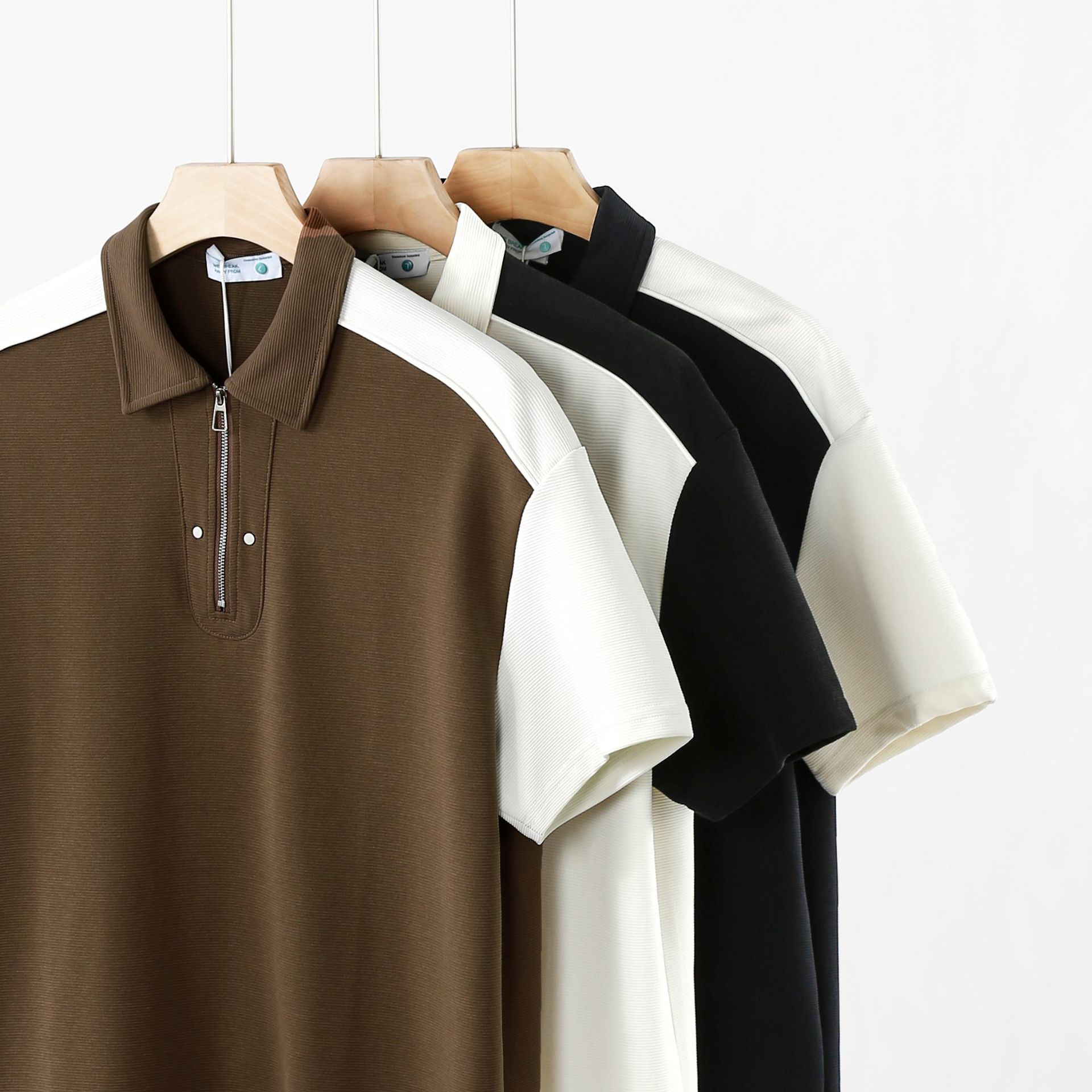 日系简约拼接半拉链polo衫男士夏季宽松翻领短袖T保罗衫百搭上衣