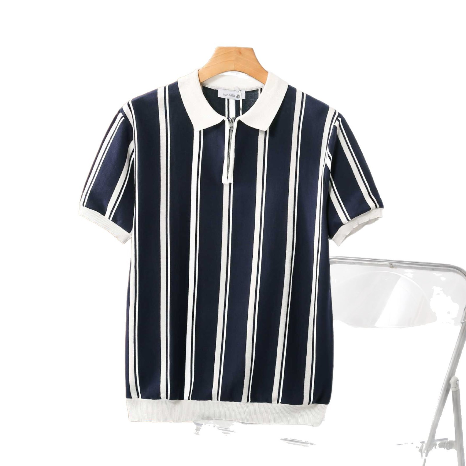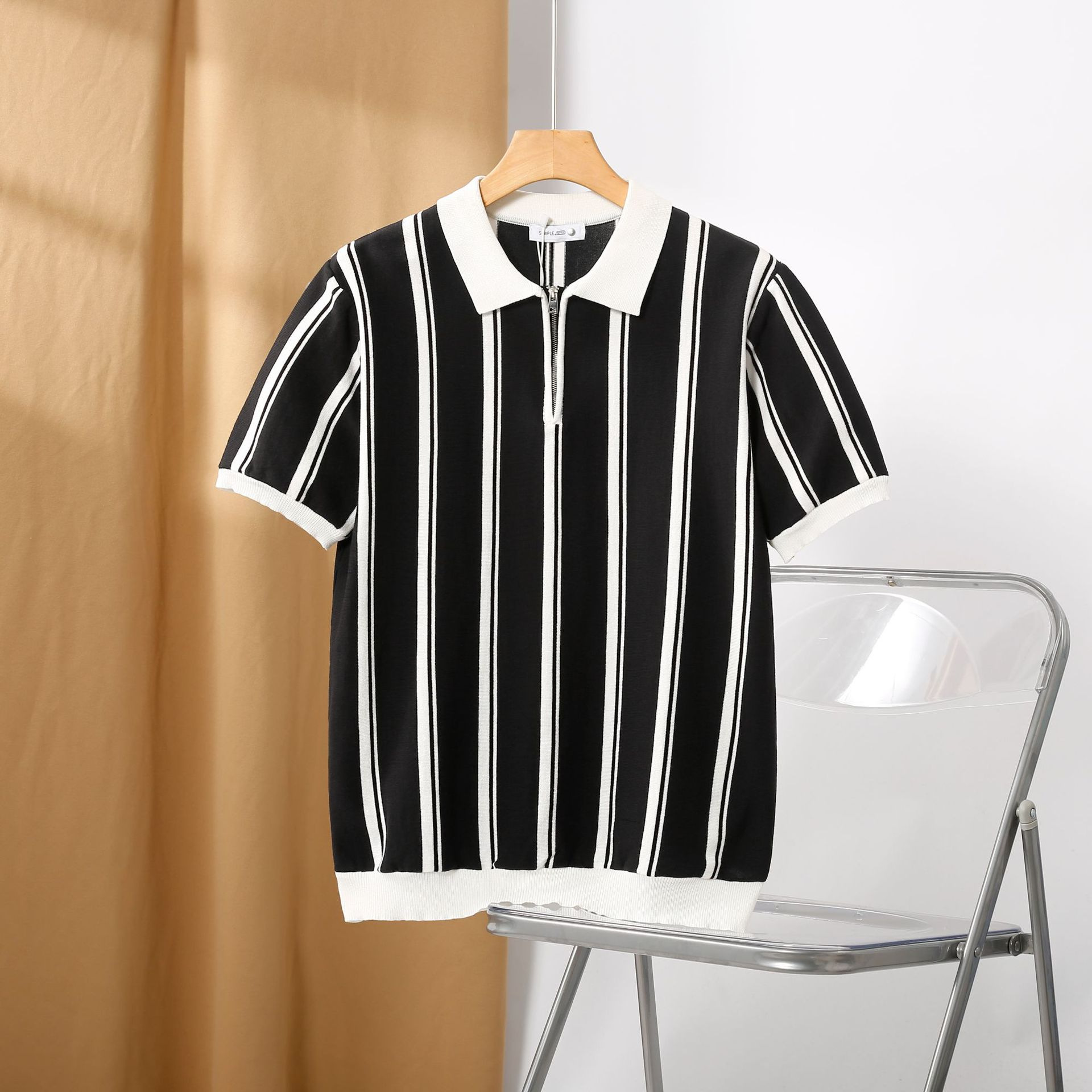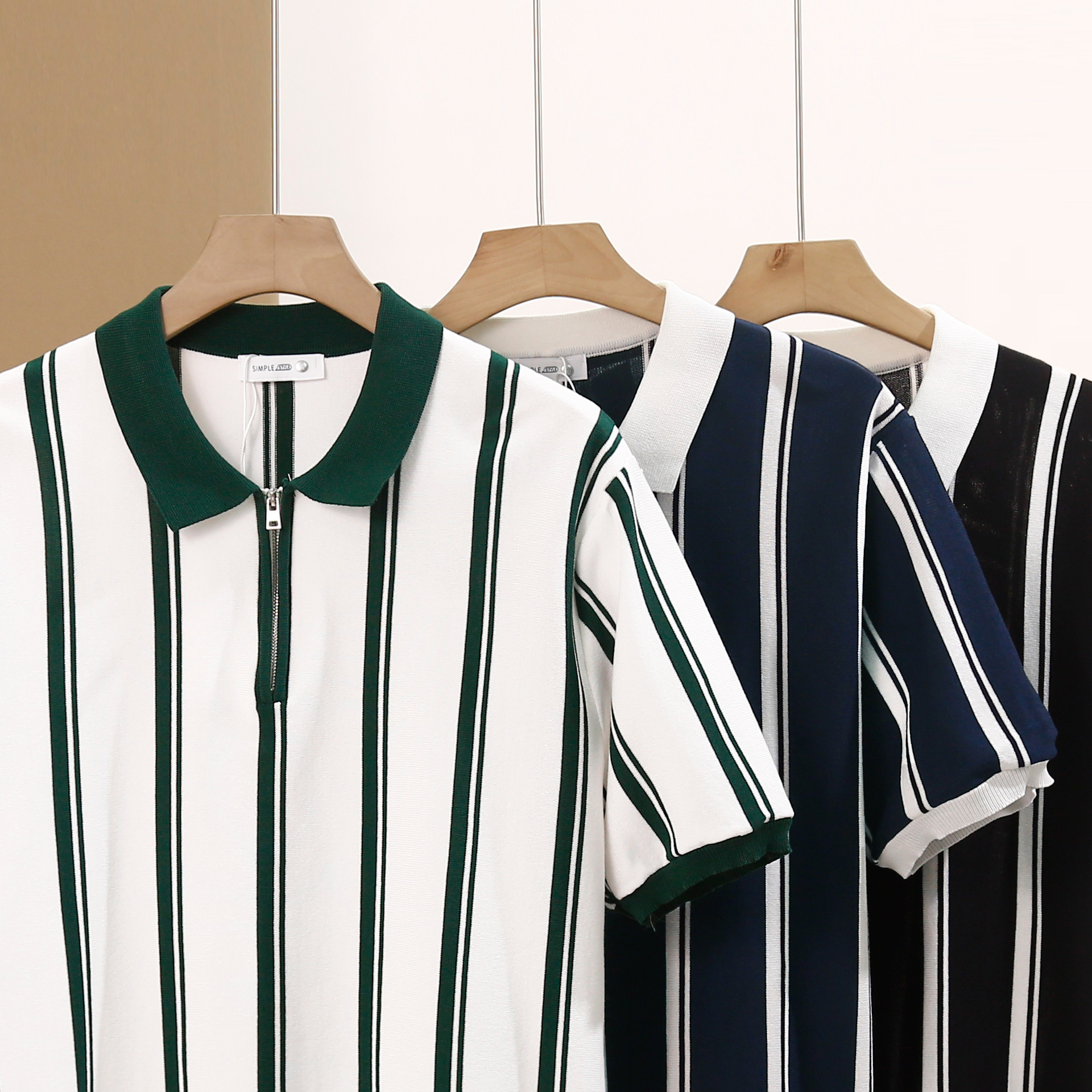 半拉链条纹冰丝针织短袖POLO衫男夏季轻熟风男装修身翻领半袖T恤
