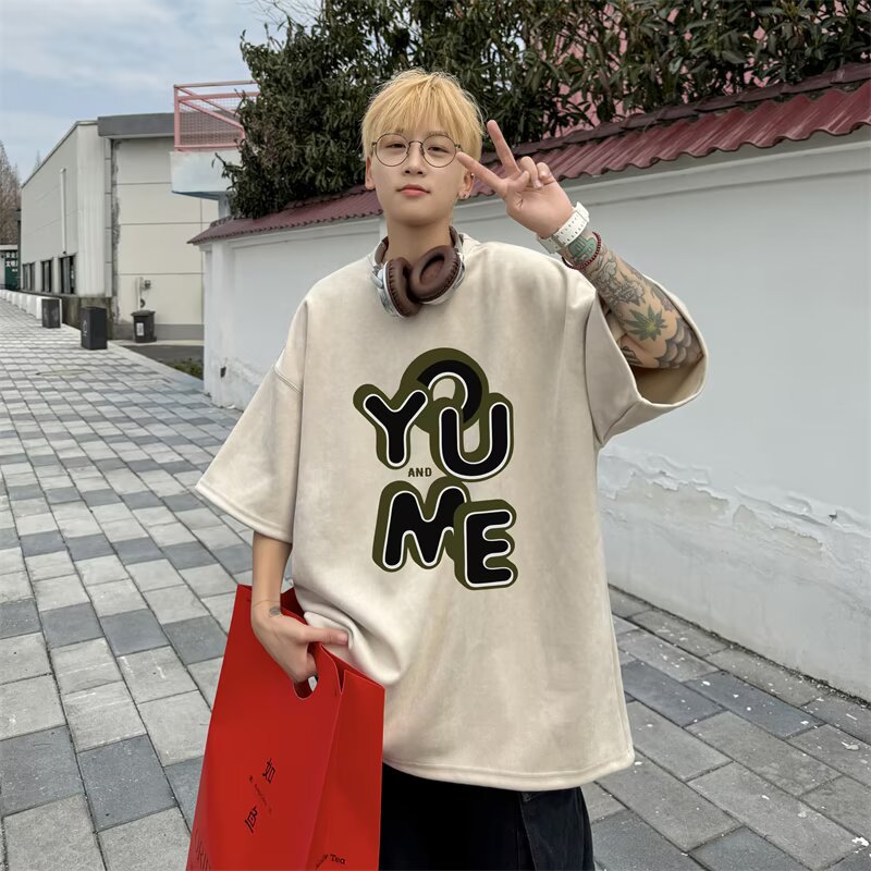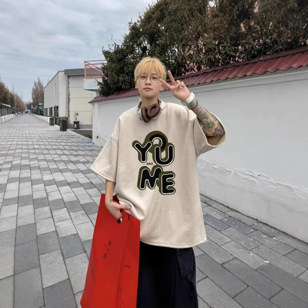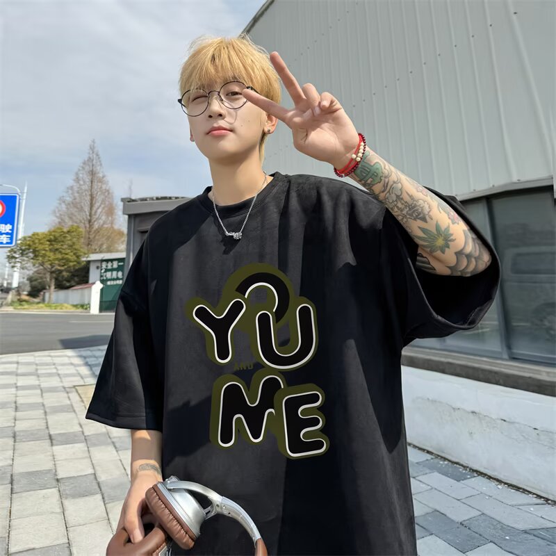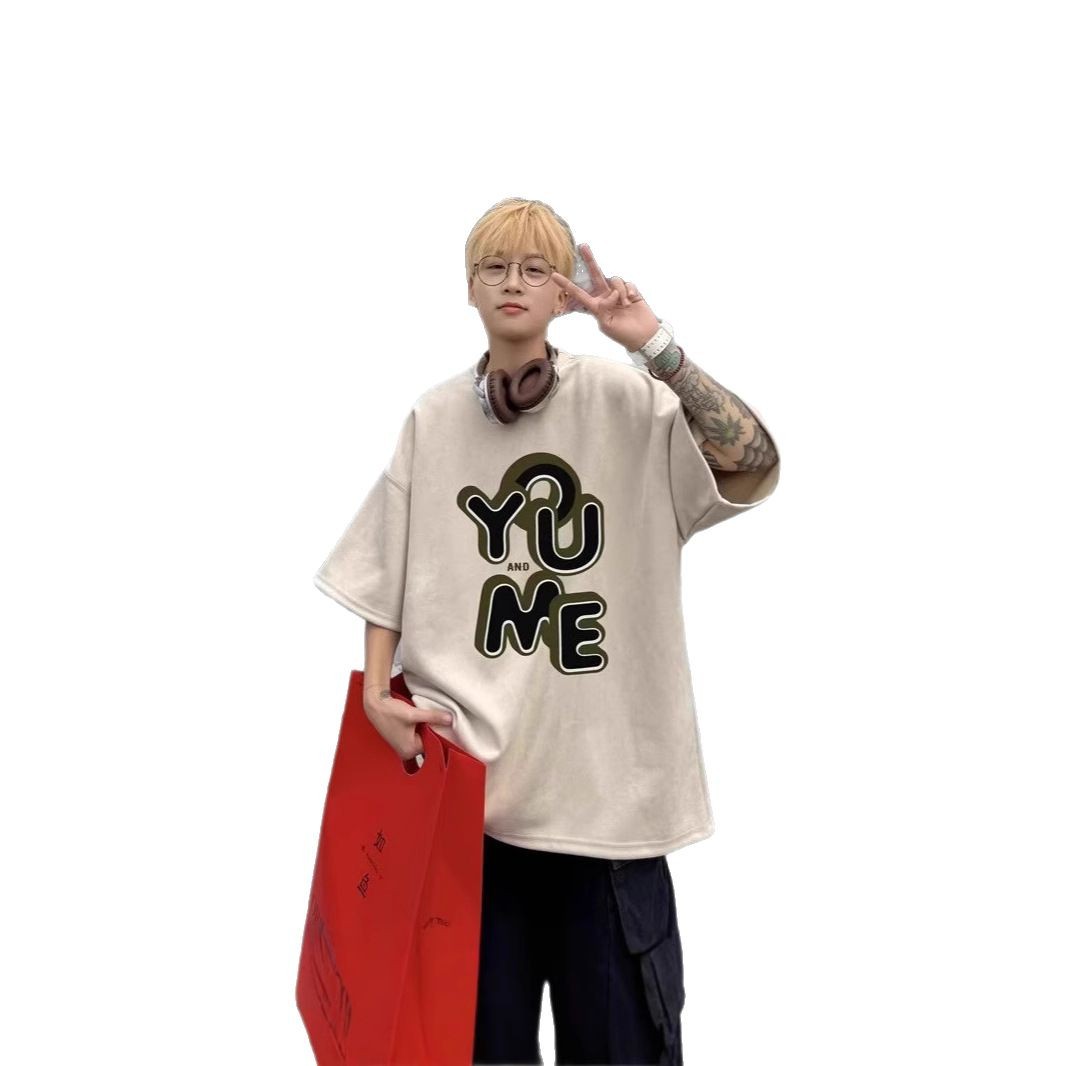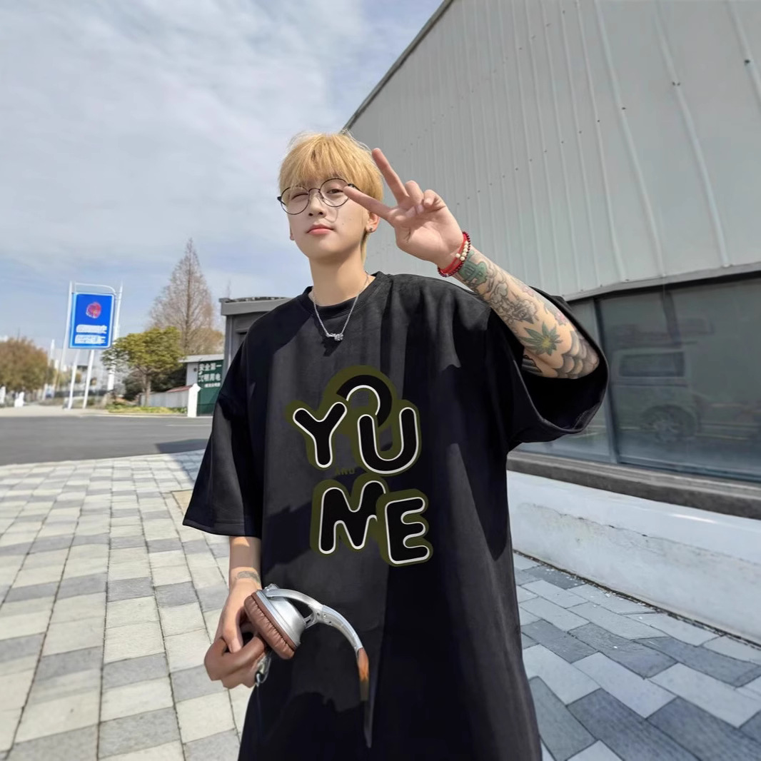 日系宽松字母印花T恤男短袖百搭2025夏季时尚中长款圆领半袖上衣