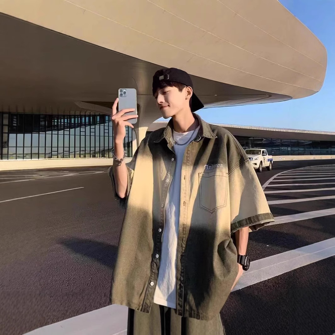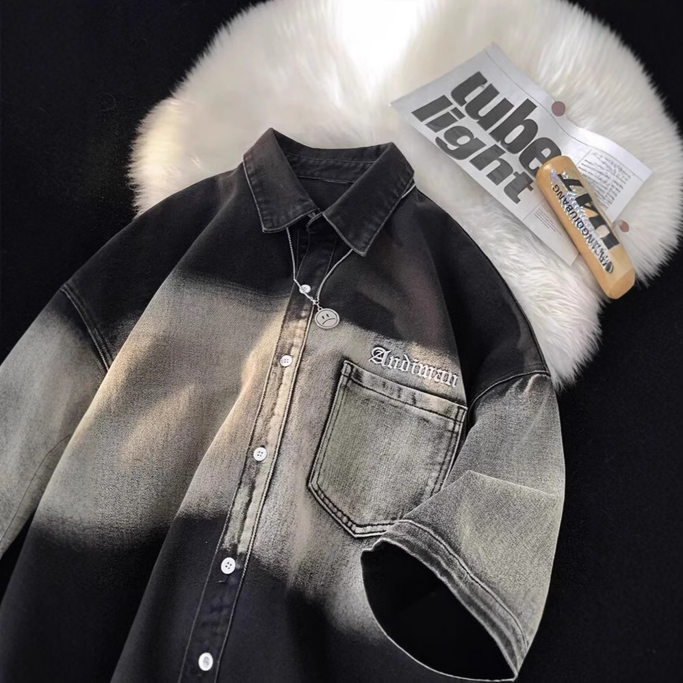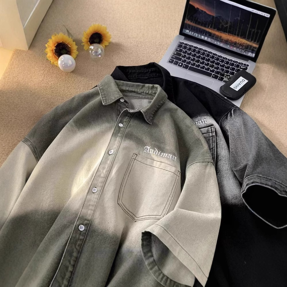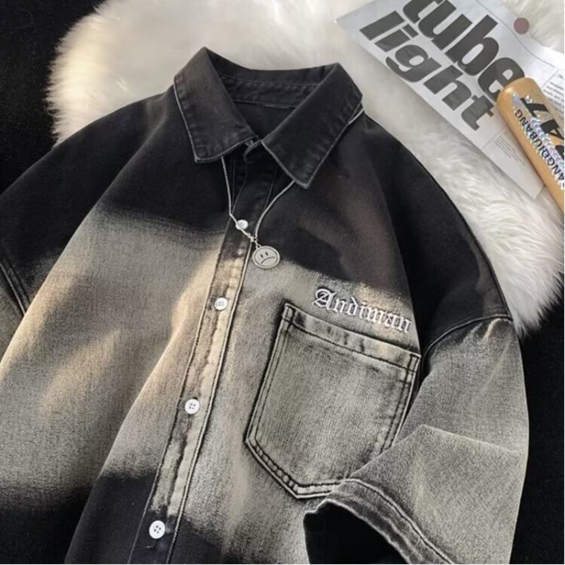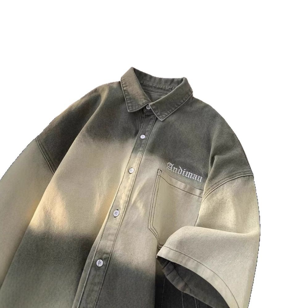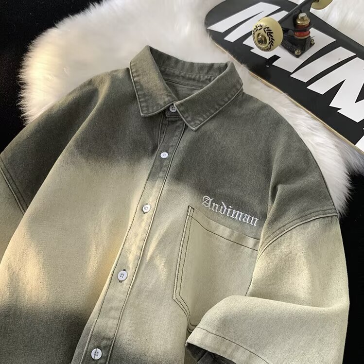 渐变色牛仔短袖衬衫男夏季港风外套高街痞帅五分袖衬衣潮牌半截袖
