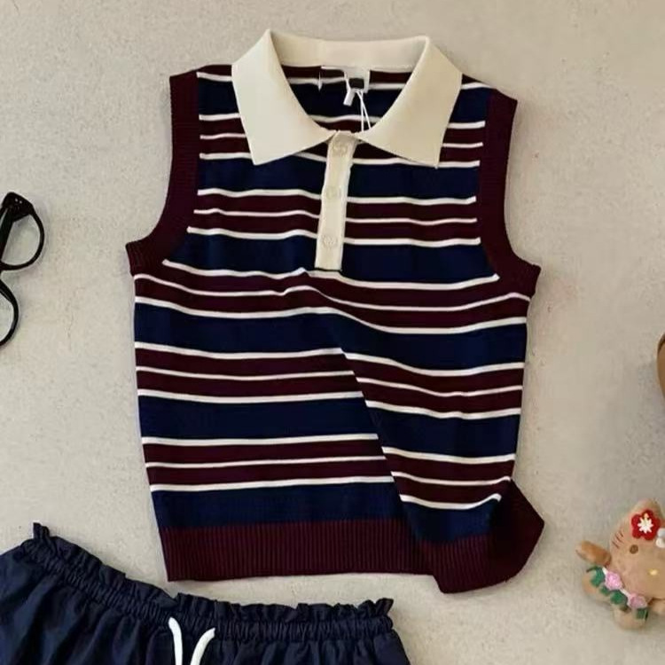 Chao推荐!polo领撞色条纹背心女夏季新款韩系百搭显瘦针织上衣