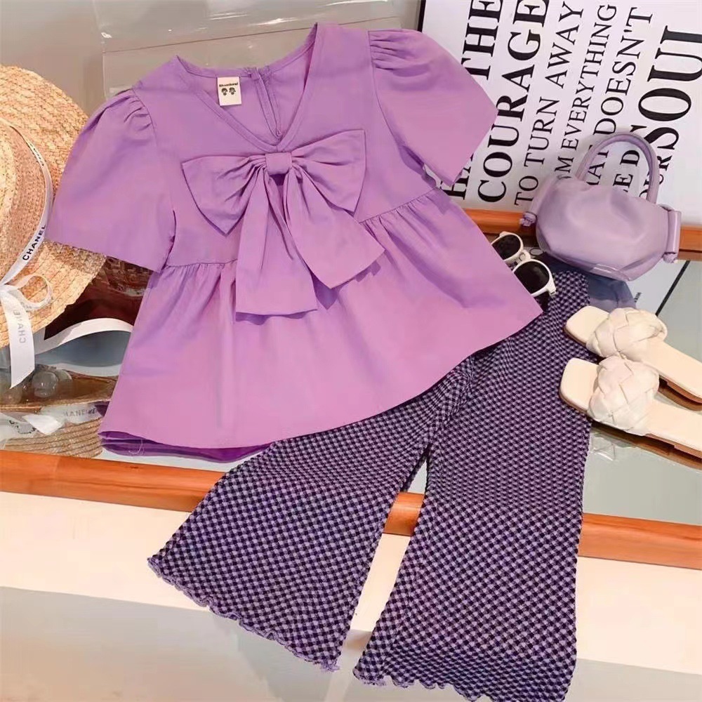 新品女童大蝴蝶结娃娃衫小格子微喇裤休闲两件套2025夏装套装