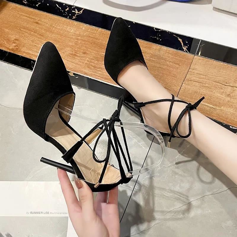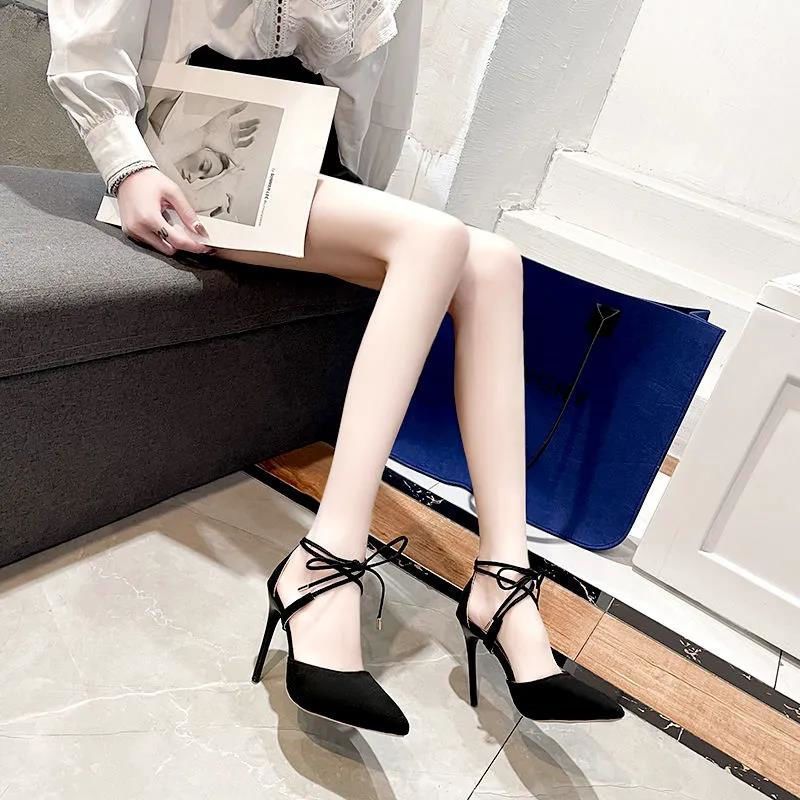 细跟高跟鞋春秋新款小清新法式少女尖头交叉绑带绒面时尚单鞋代发