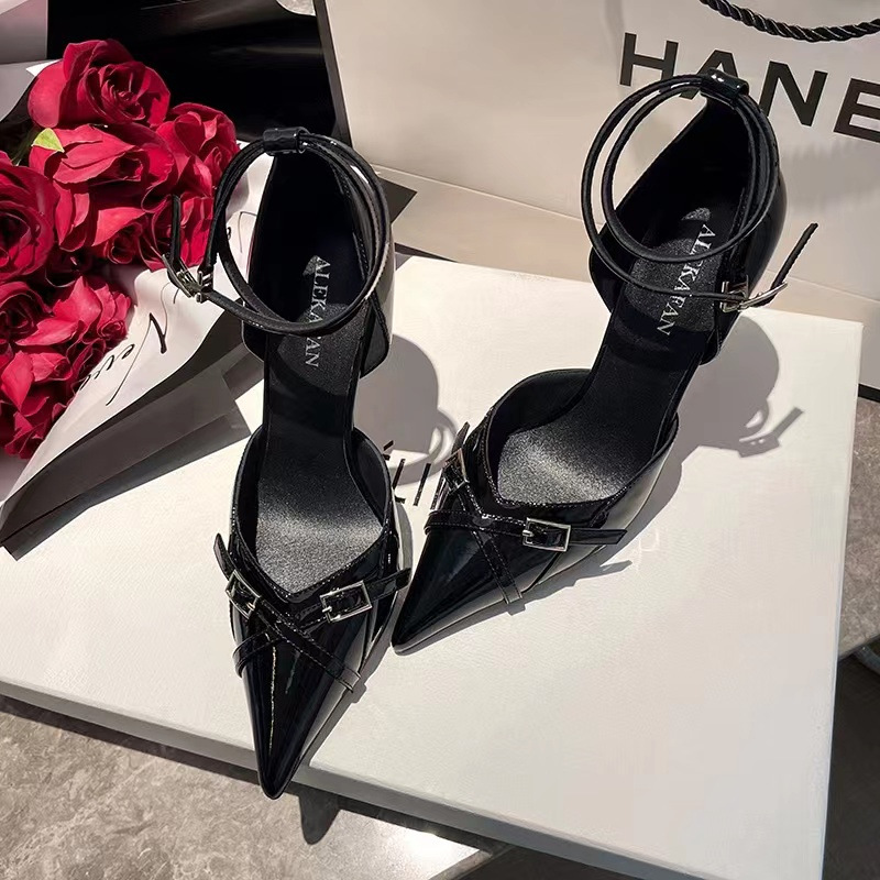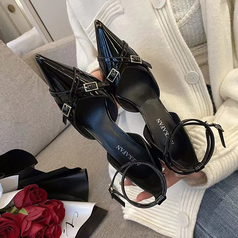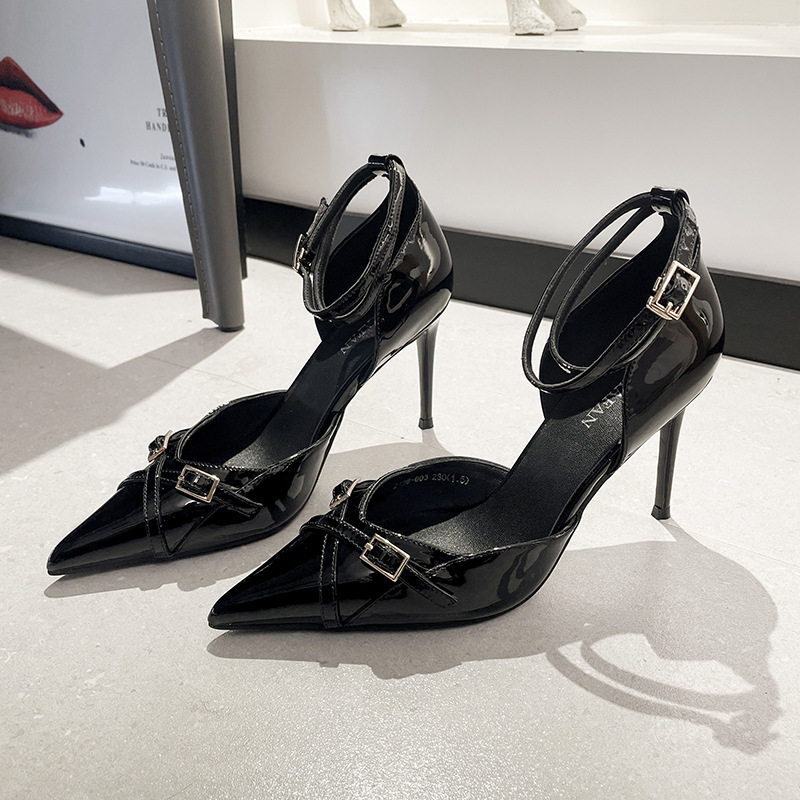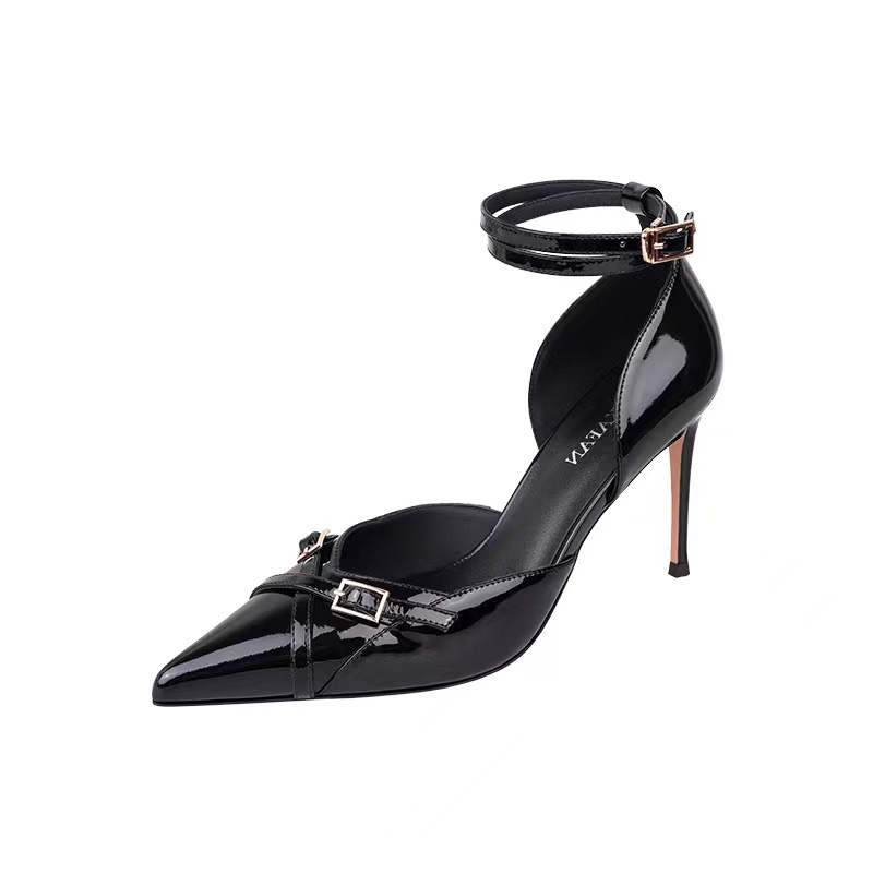 亮皮黑色性感时尚凉鞋女新款春夏款尖头细跟搭扣皮带扣高跟鞋