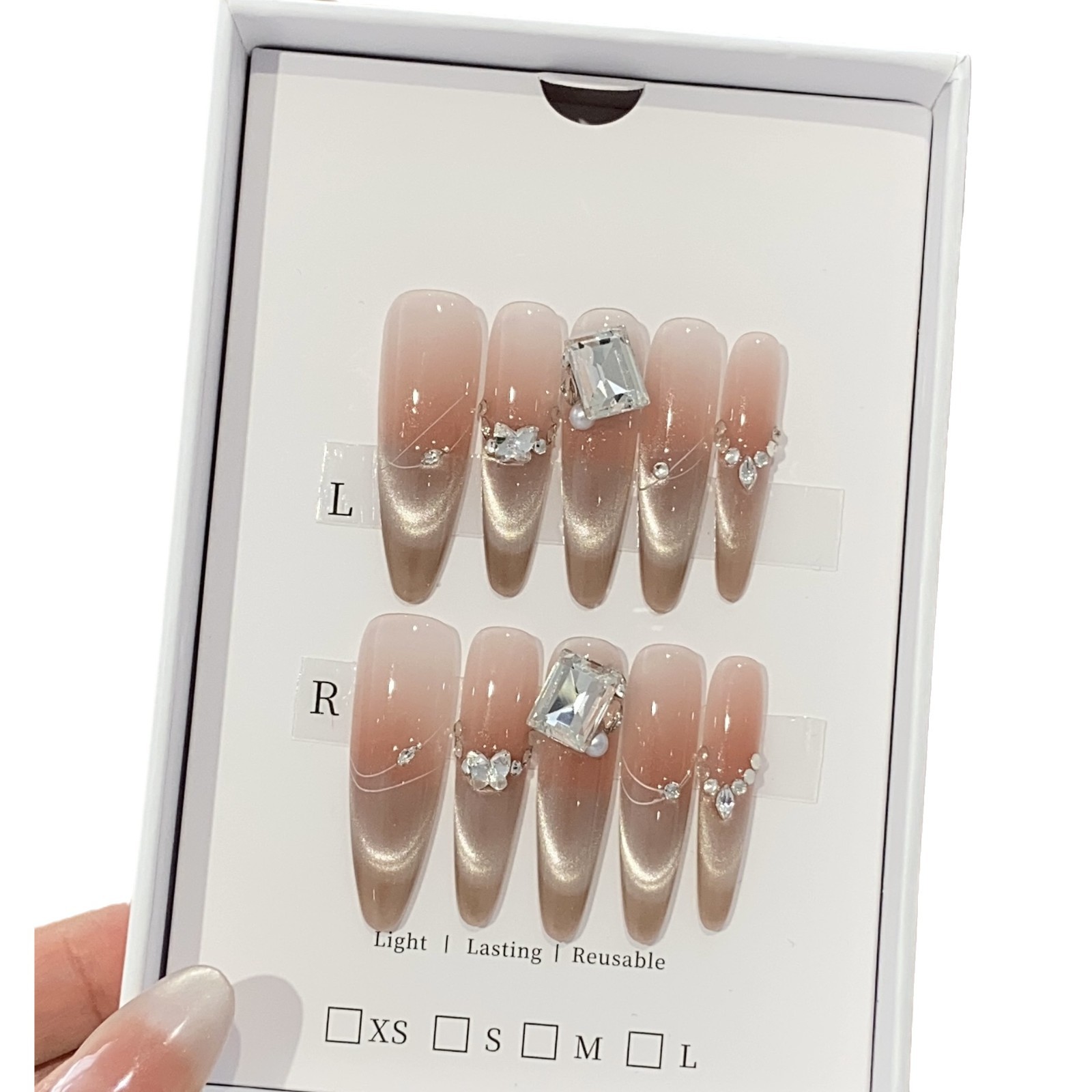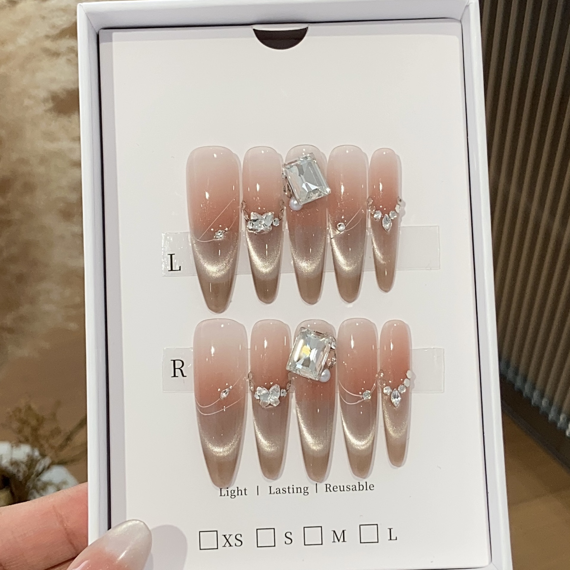 一只顾美甲 冰透渐变微笑猫眼长方钻珍珠小碎钻甜蜜狙击穿戴甲