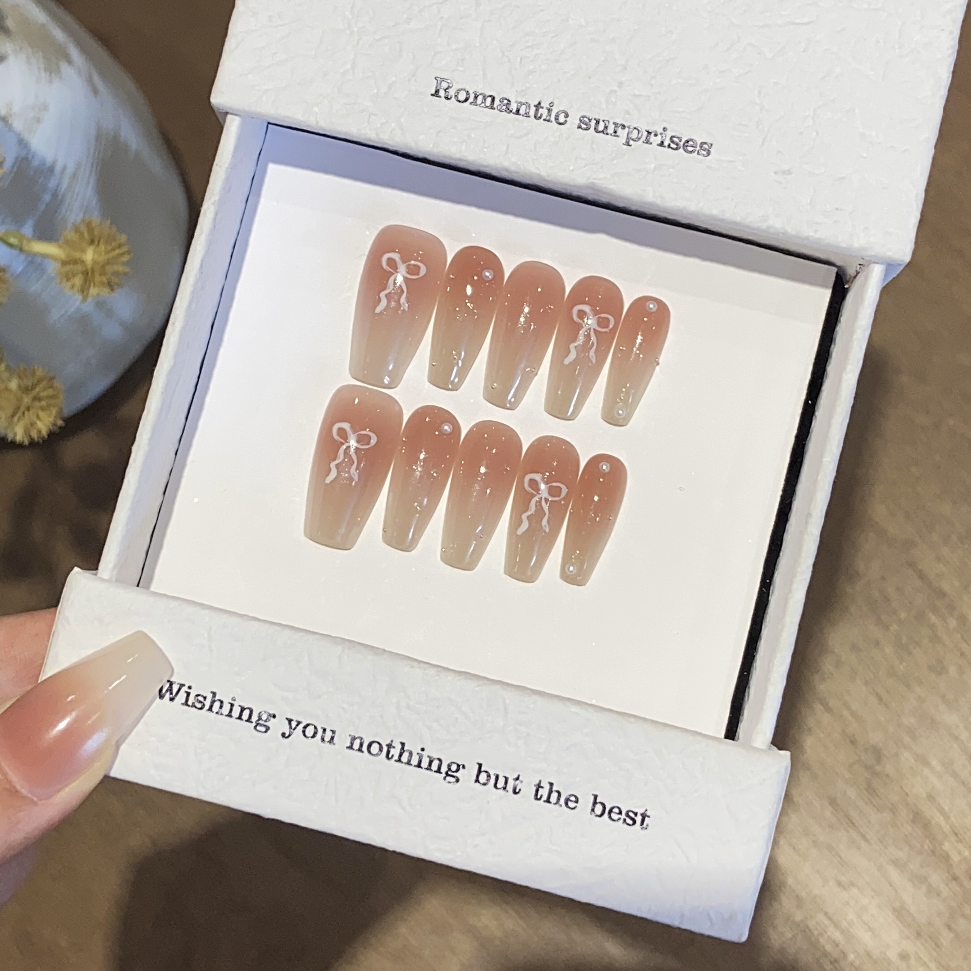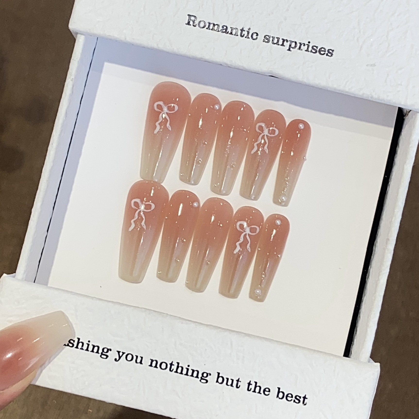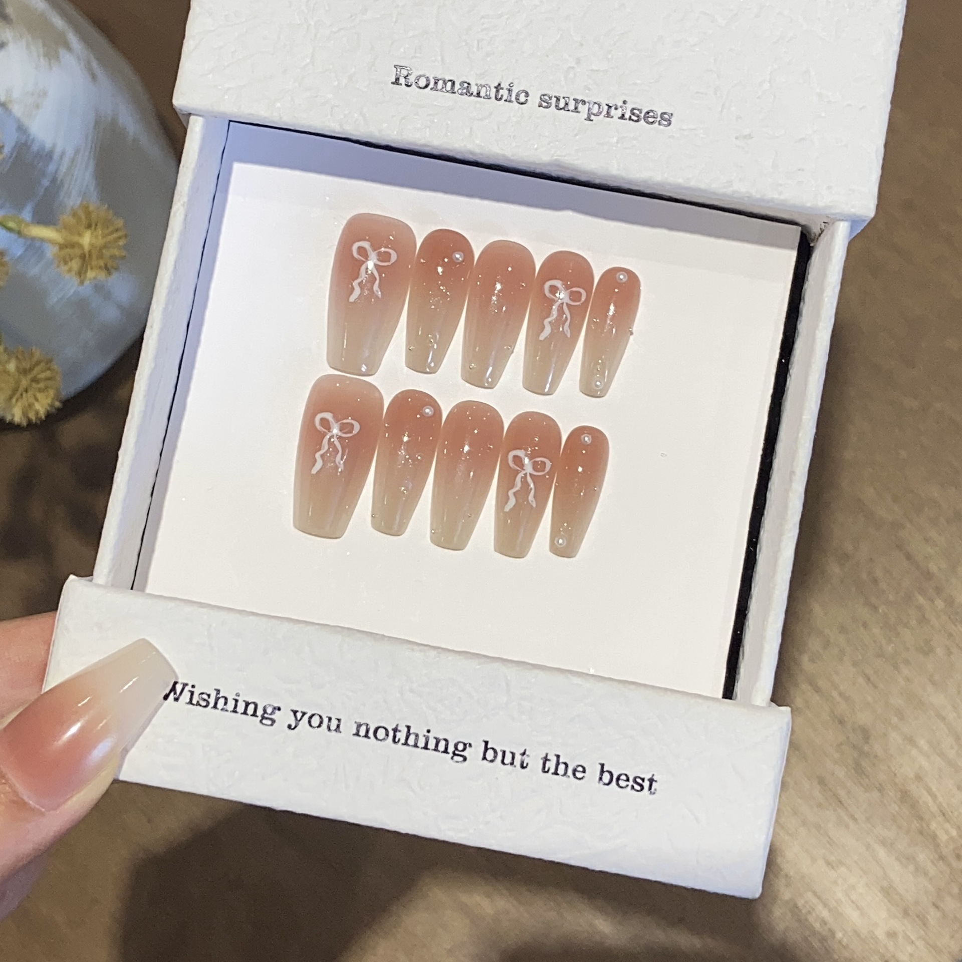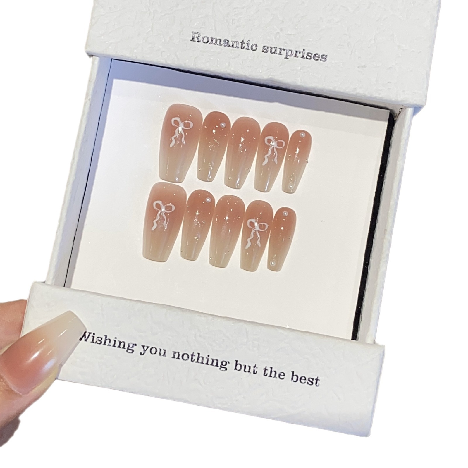 一只顾美甲 高级冰透奶茶色渐变蕾丝蝴蝶结浪漫主义贴片穿戴甲