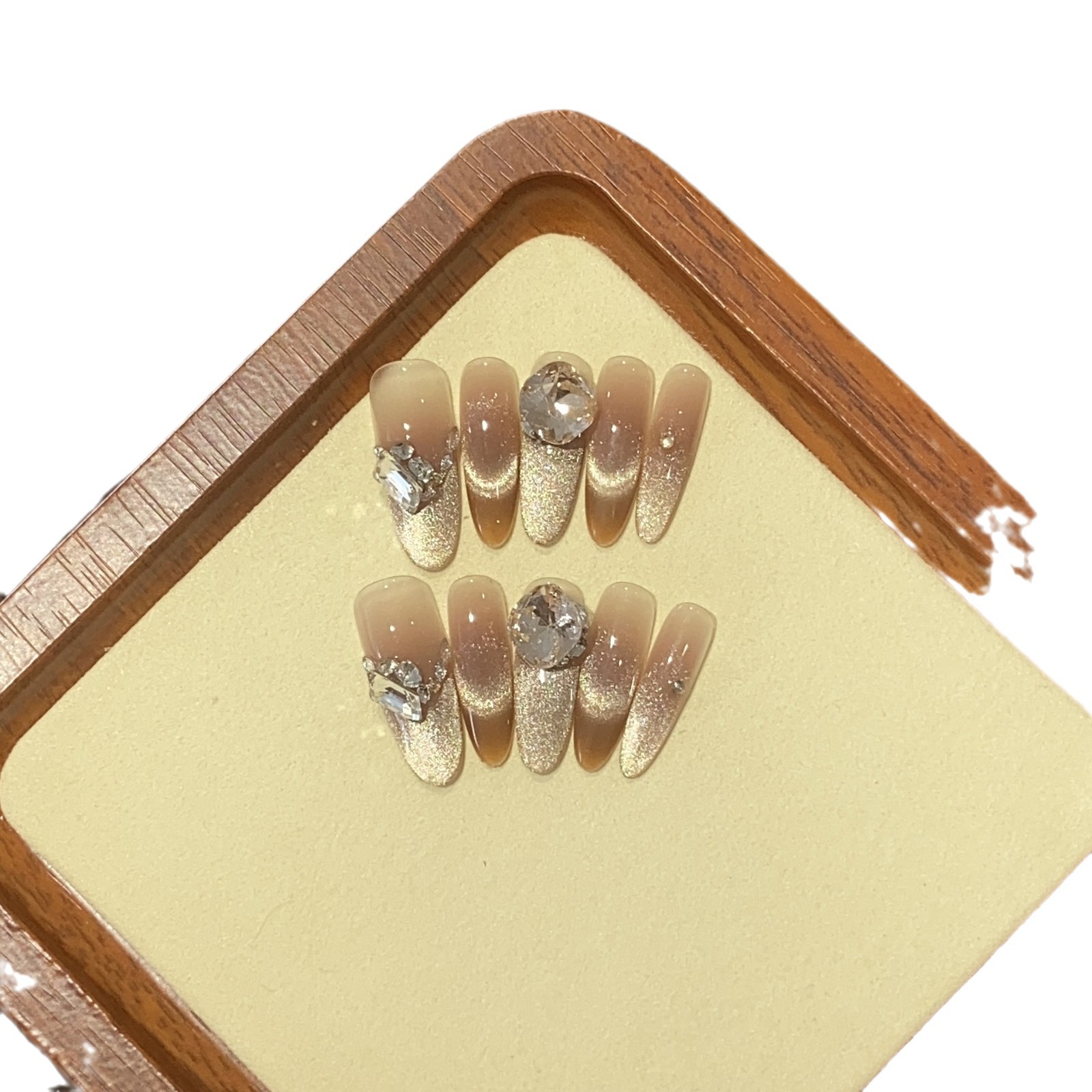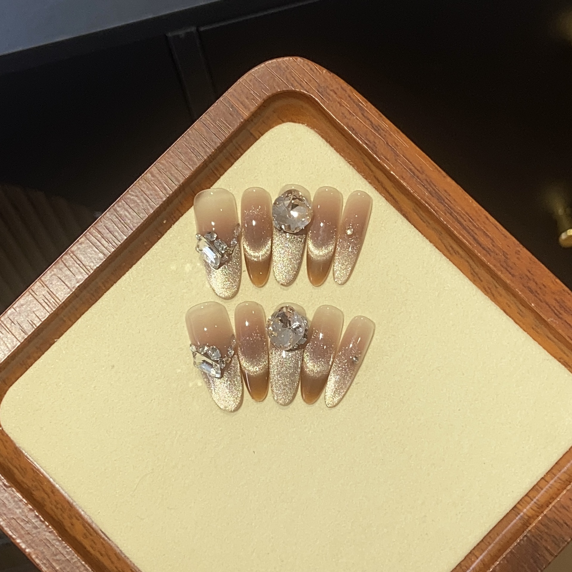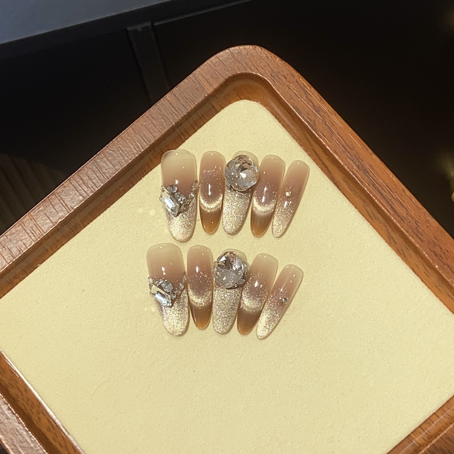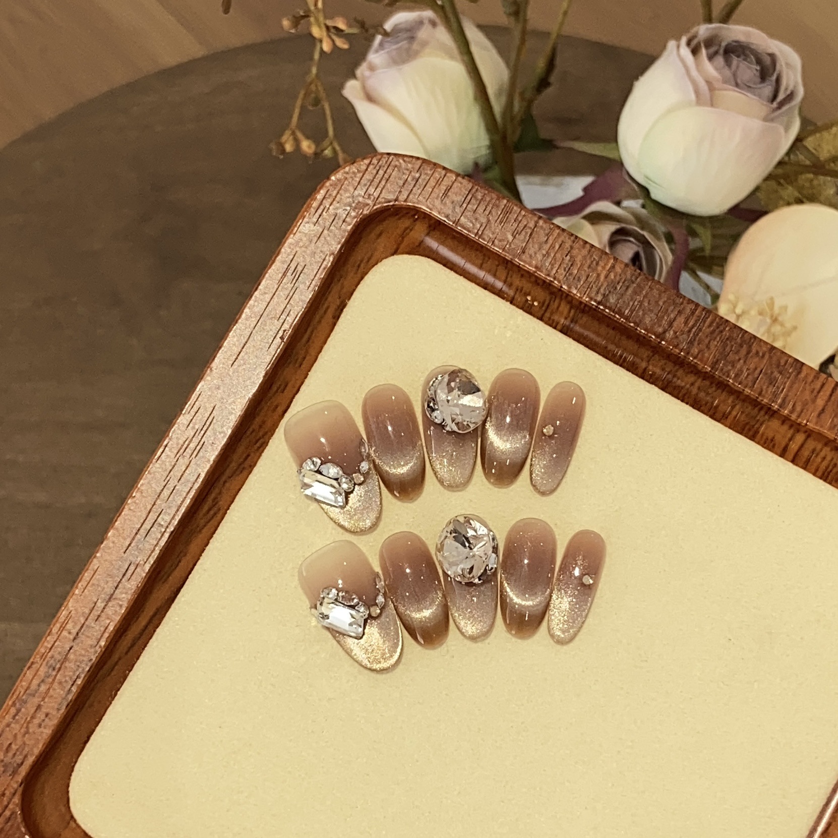 一只顾美甲 秋冬爆闪微笑法式猫眼堆堆钻方钻咖啡摩卡穿戴甲贴片