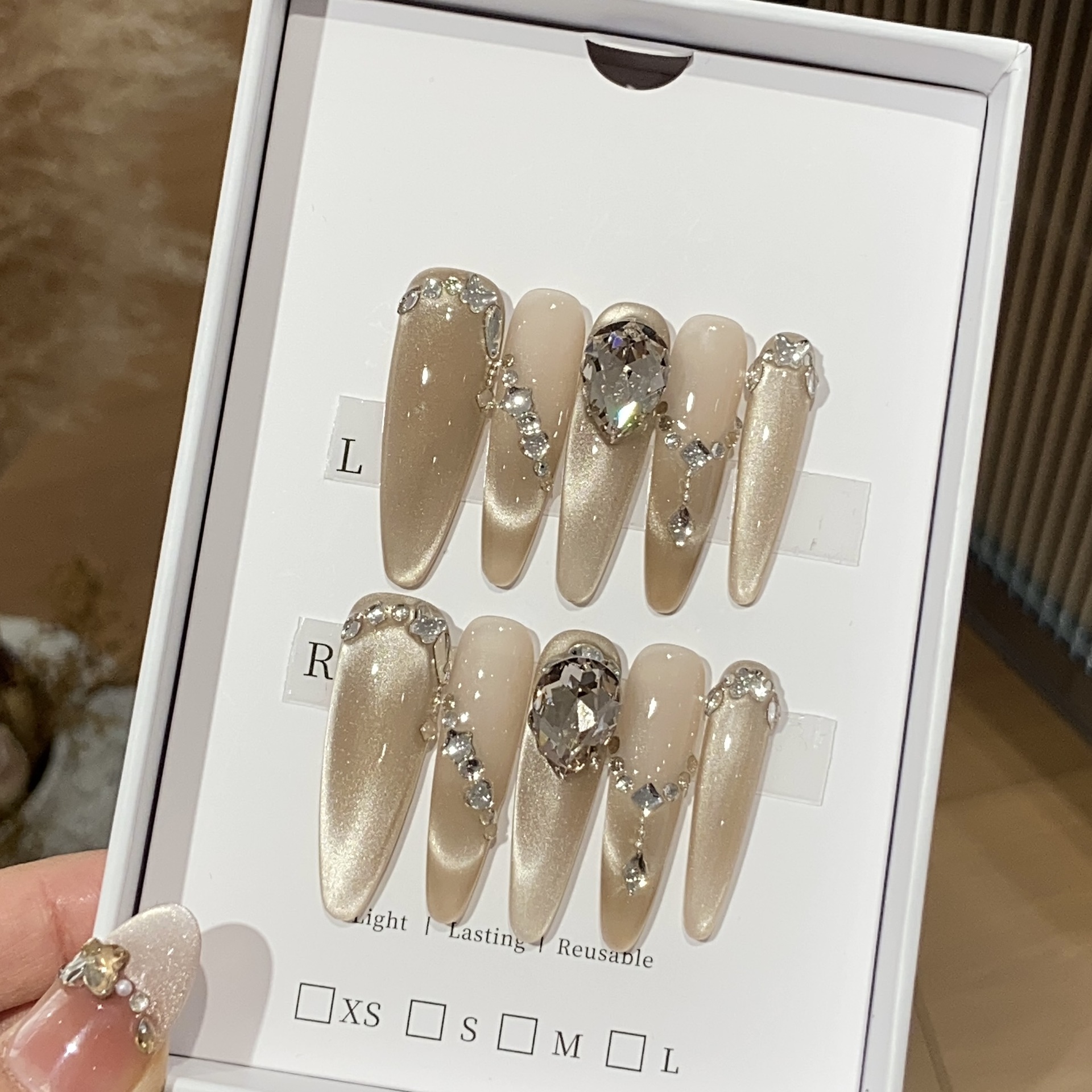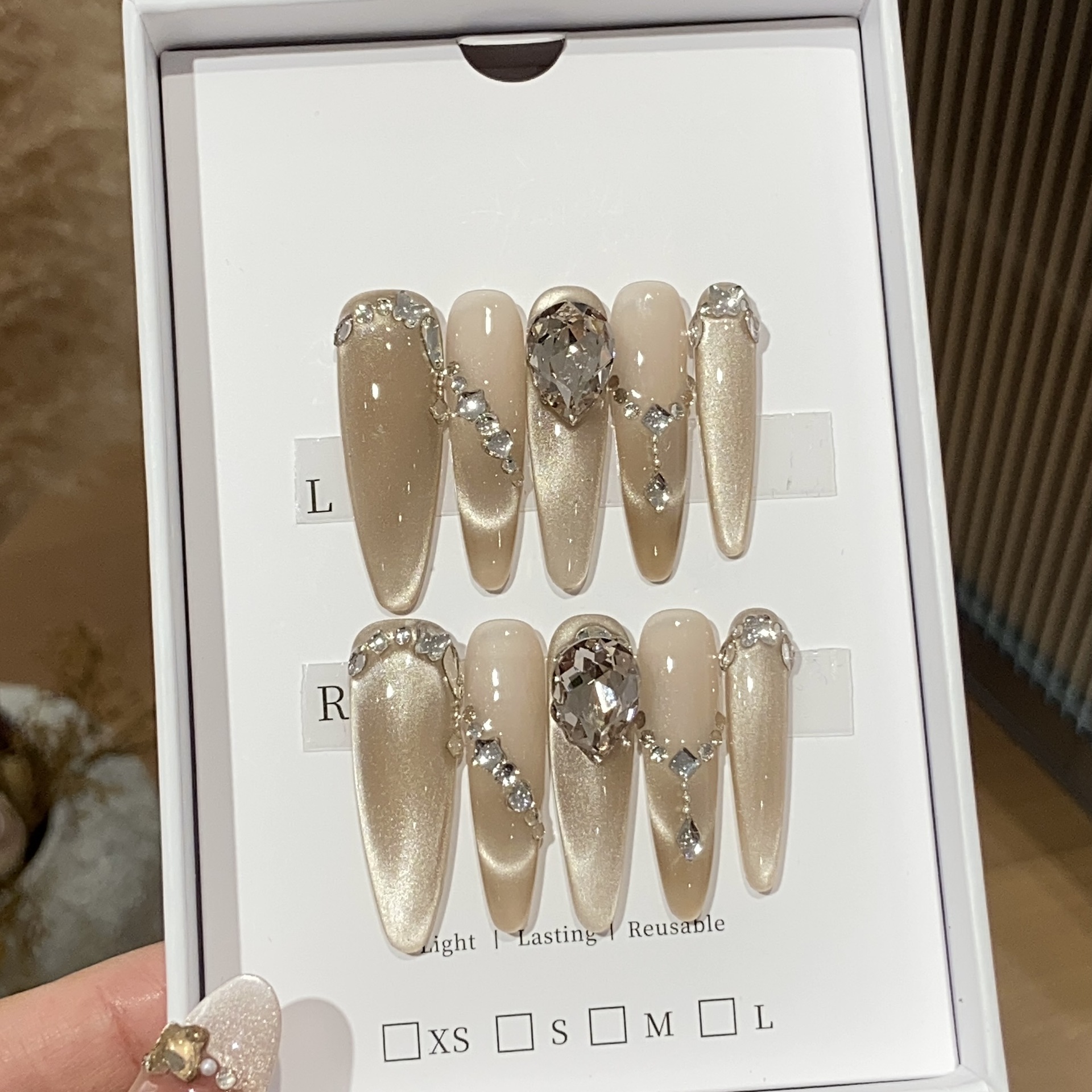 一只顾美甲 高级感香槟色渐变猫眼斜边碎钻精品香槟K9钻克罗约定