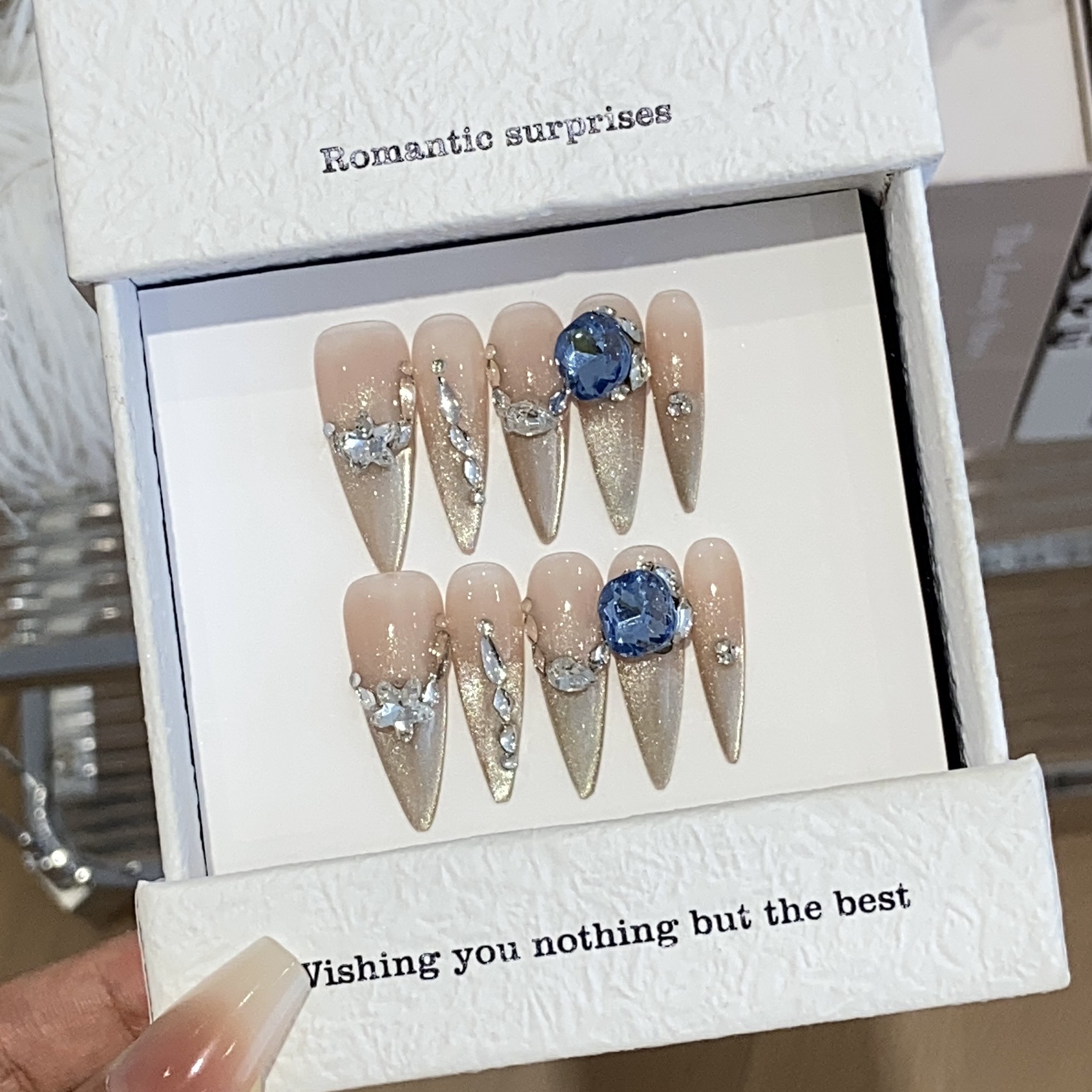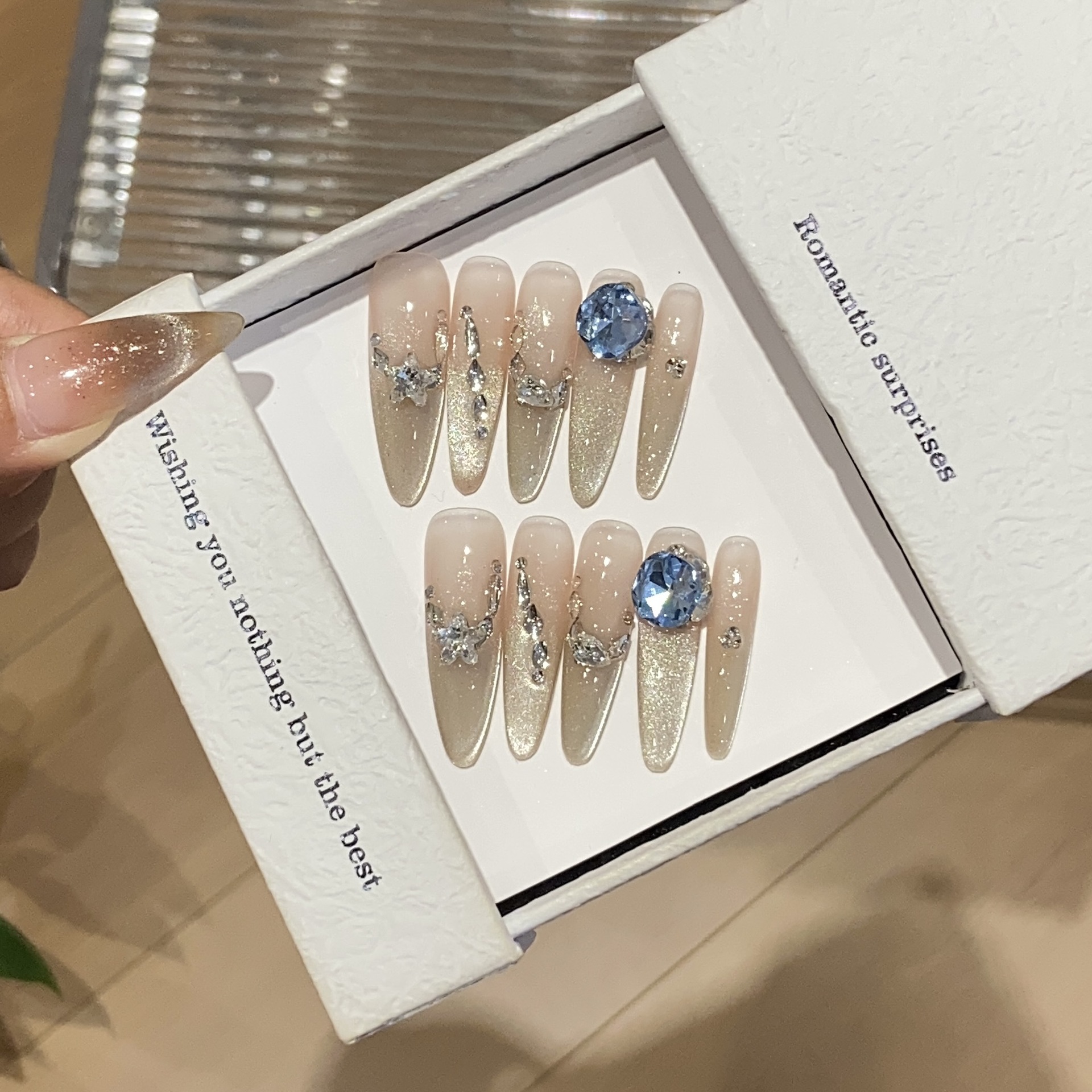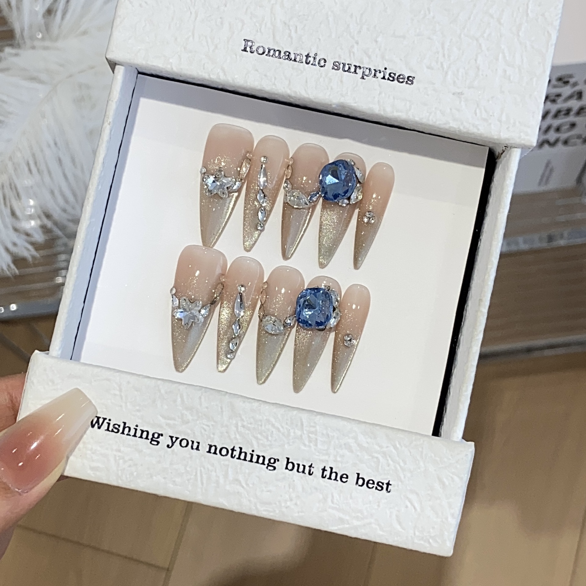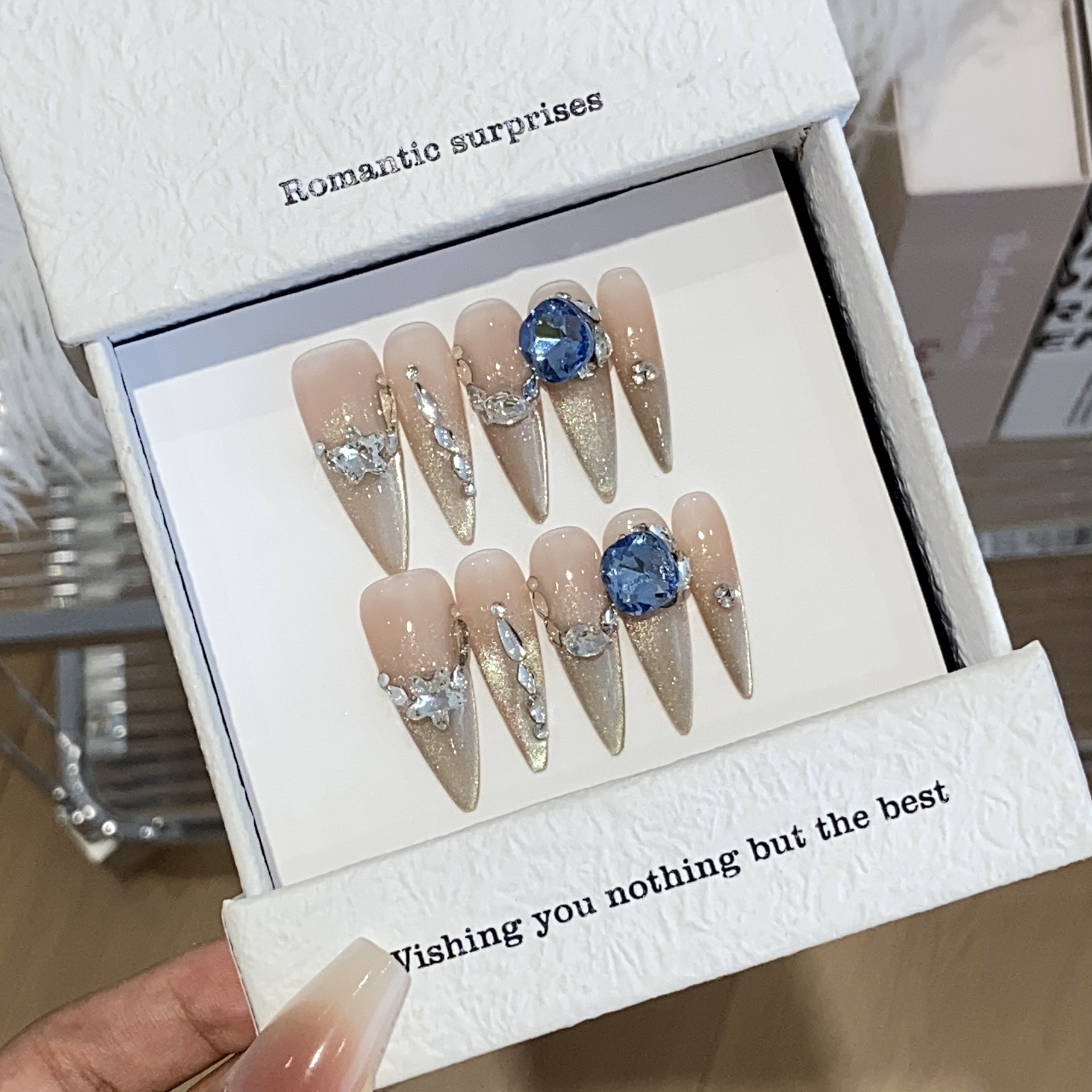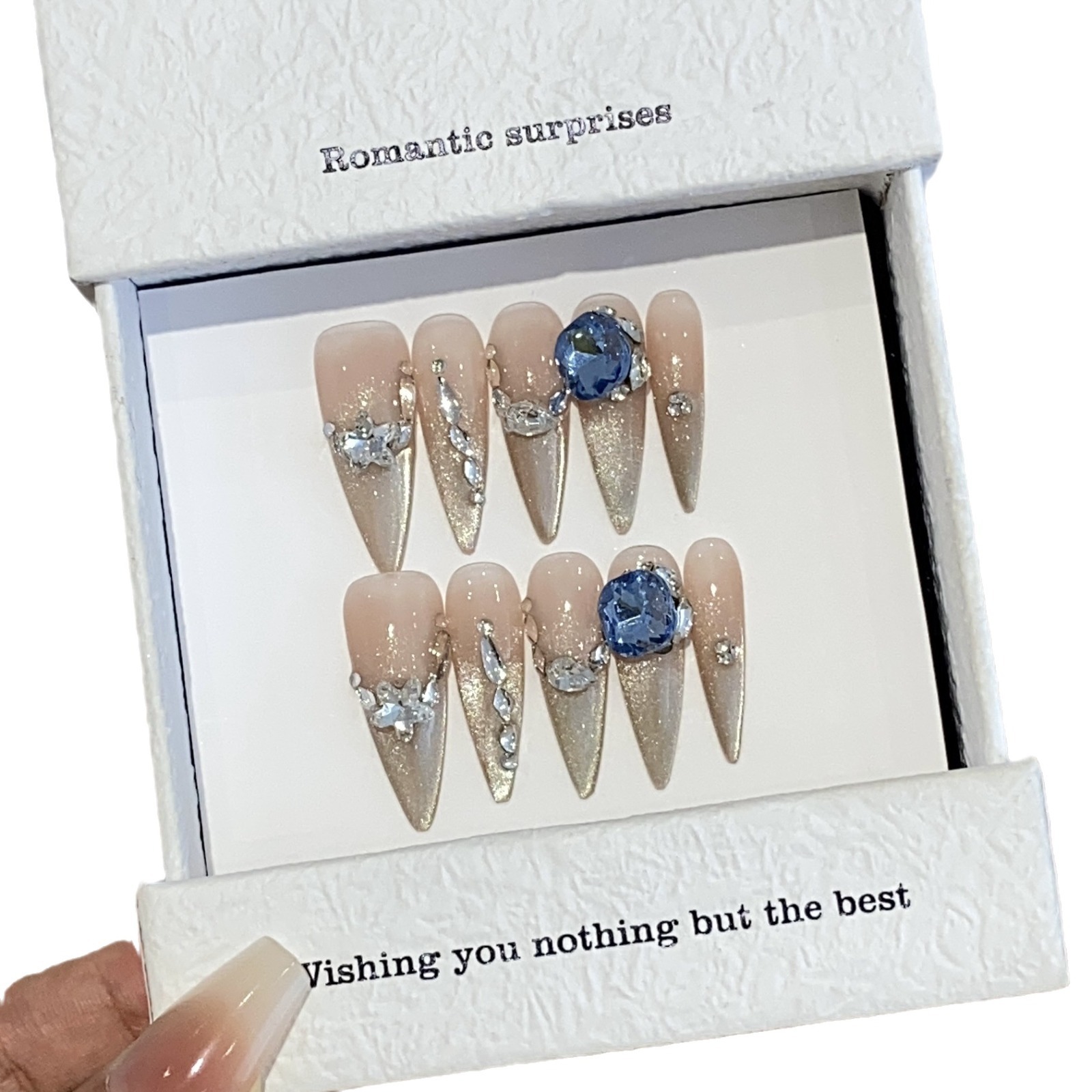 一只顾美甲 冰透渐变猫眼碎钻天鹅蓝宝石日暮岛屿可拆卸穿戴甲片