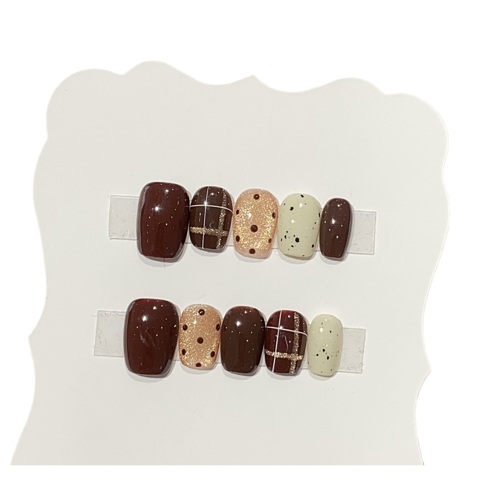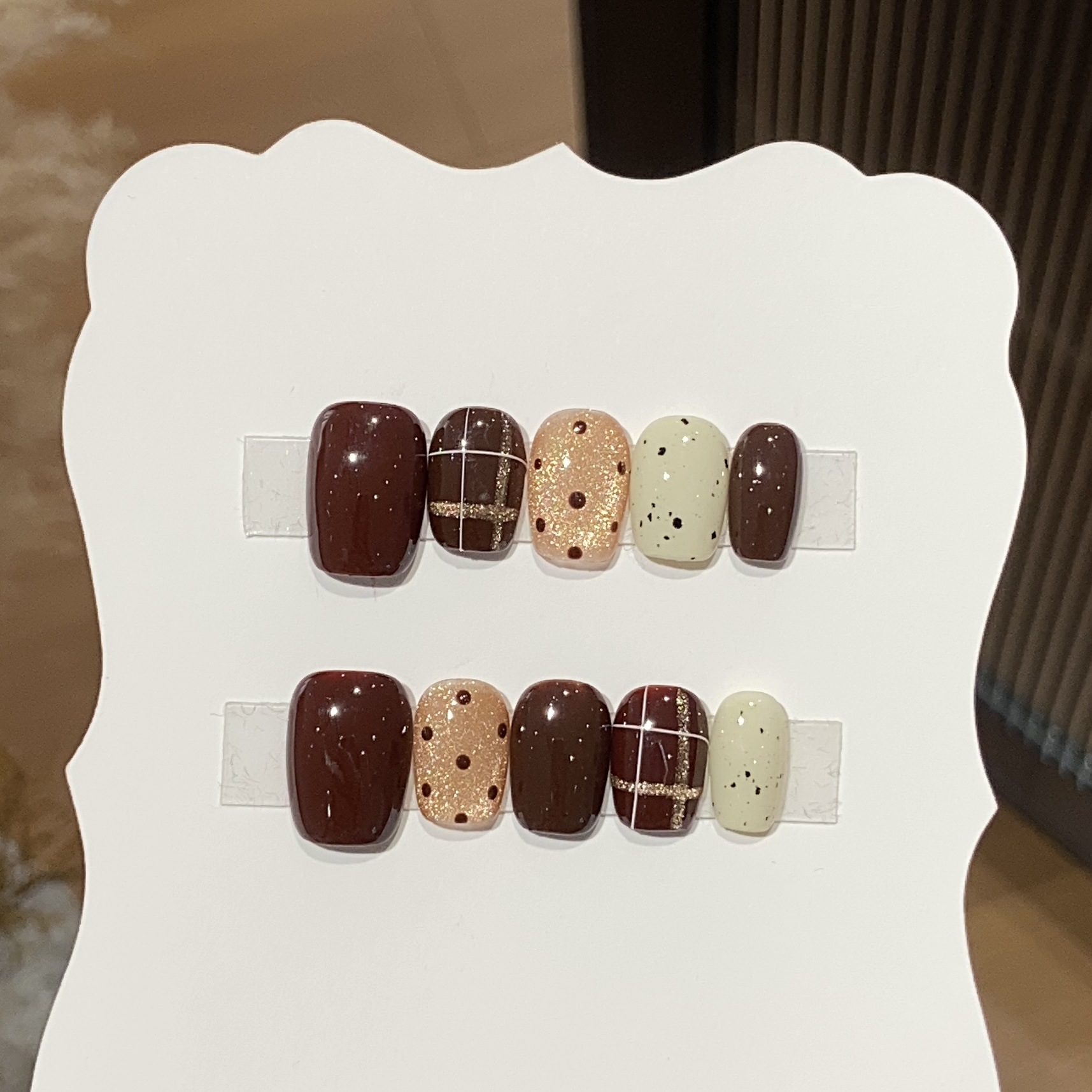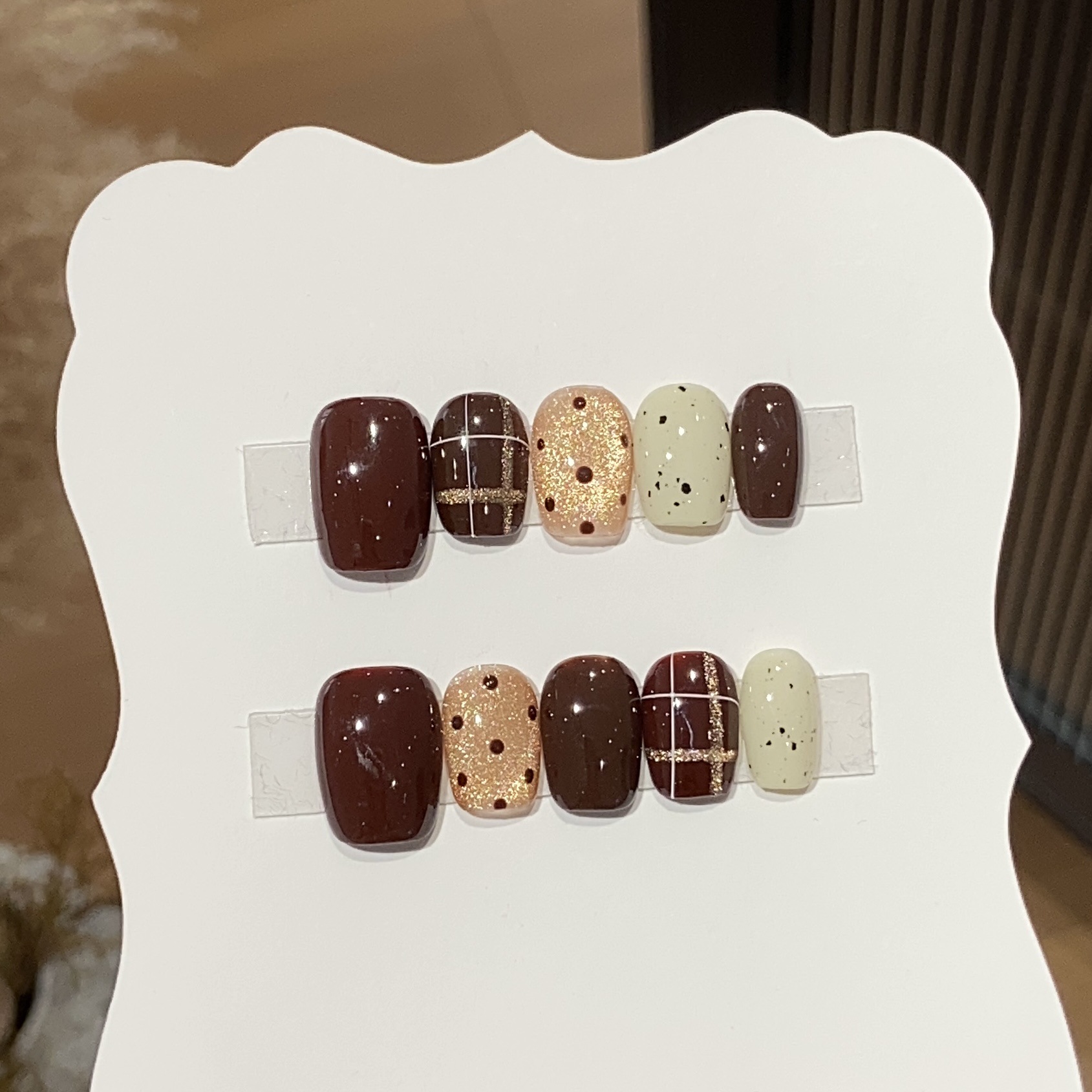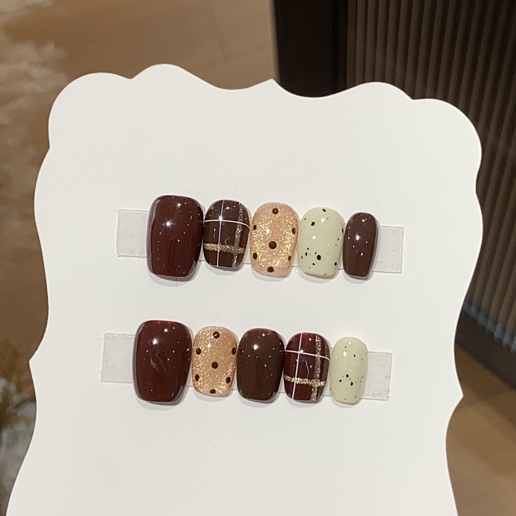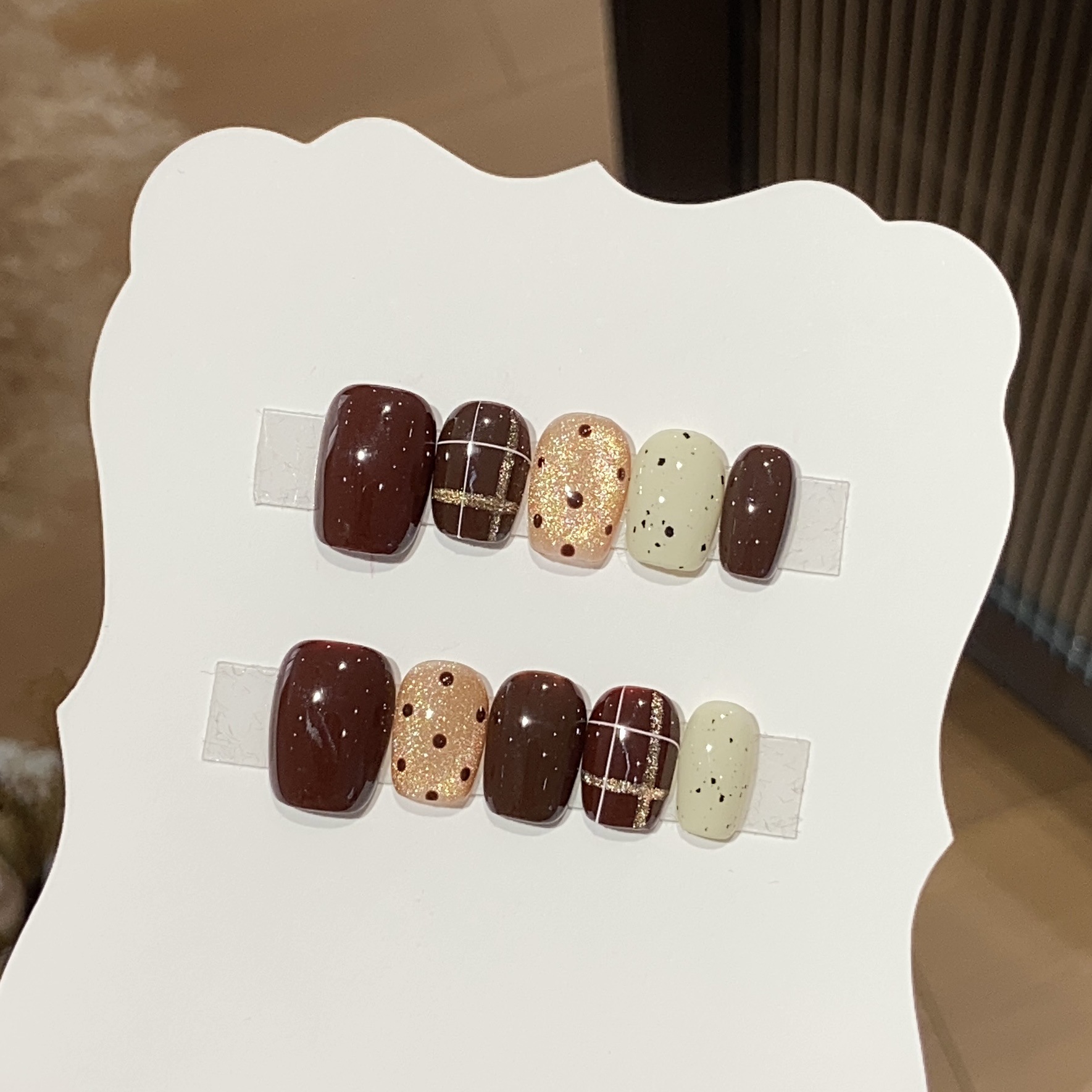 一只顾美甲 秋冬简约短甲金色细闪猫眼波点格子暮色可拆卸穿戴甲