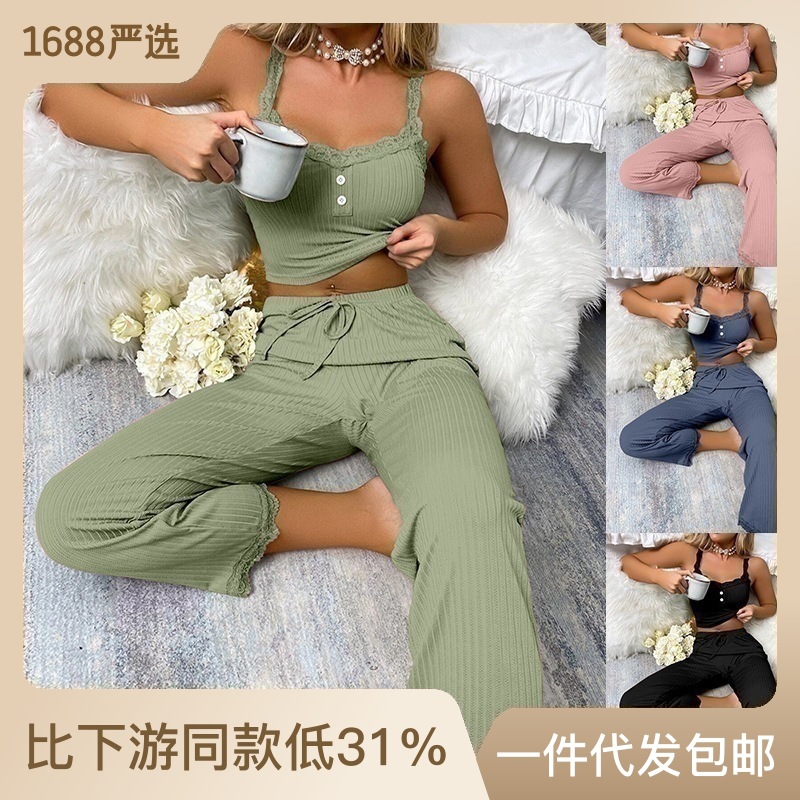 跨境休闲睡衣女夏蕾丝花边吊带长裤性感辣妹欧美女士家居服两件套
