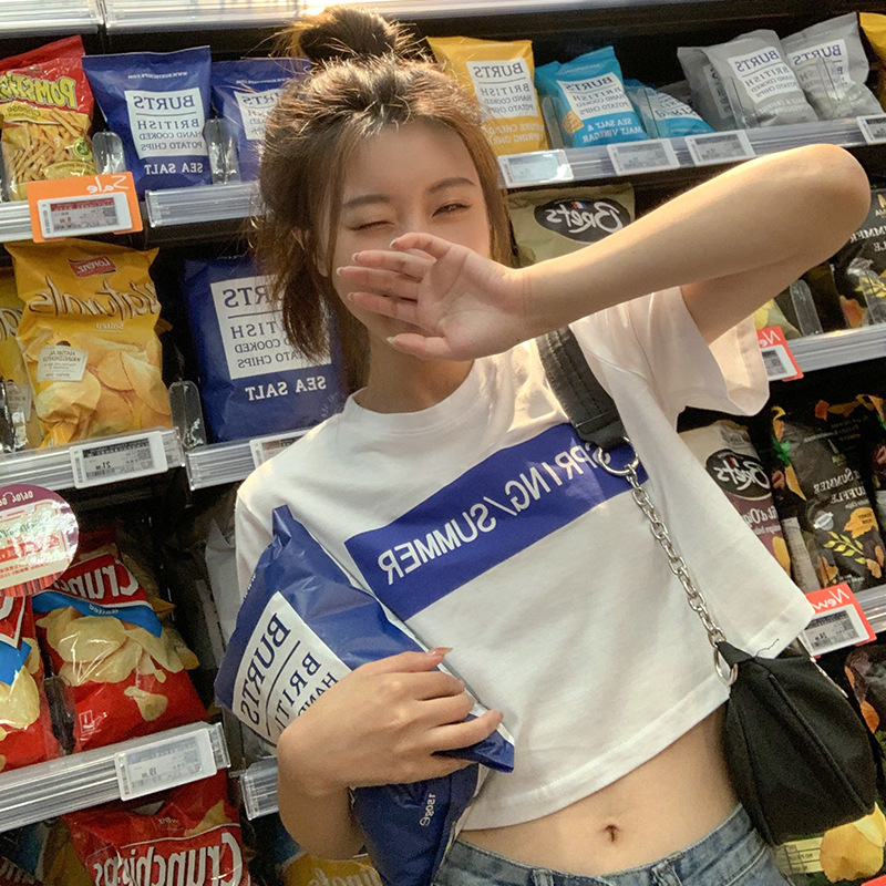 小众设计感撞色字母印花宽松短款上衣夏季新款遮肉显瘦短袖T