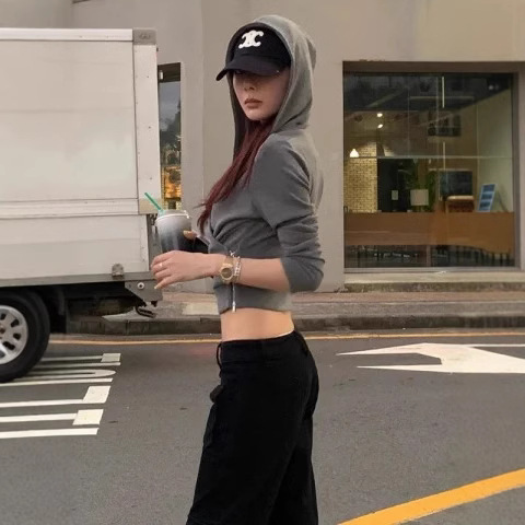 2025新款欧美辣妹交叉高腰打底连帽运动休闲开衫两穿上衣T恤女冬
