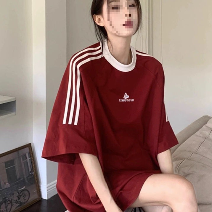 港味杠条短袖T恤女夏设计感字母印花宽松显瘦多巴胺穿搭上衣