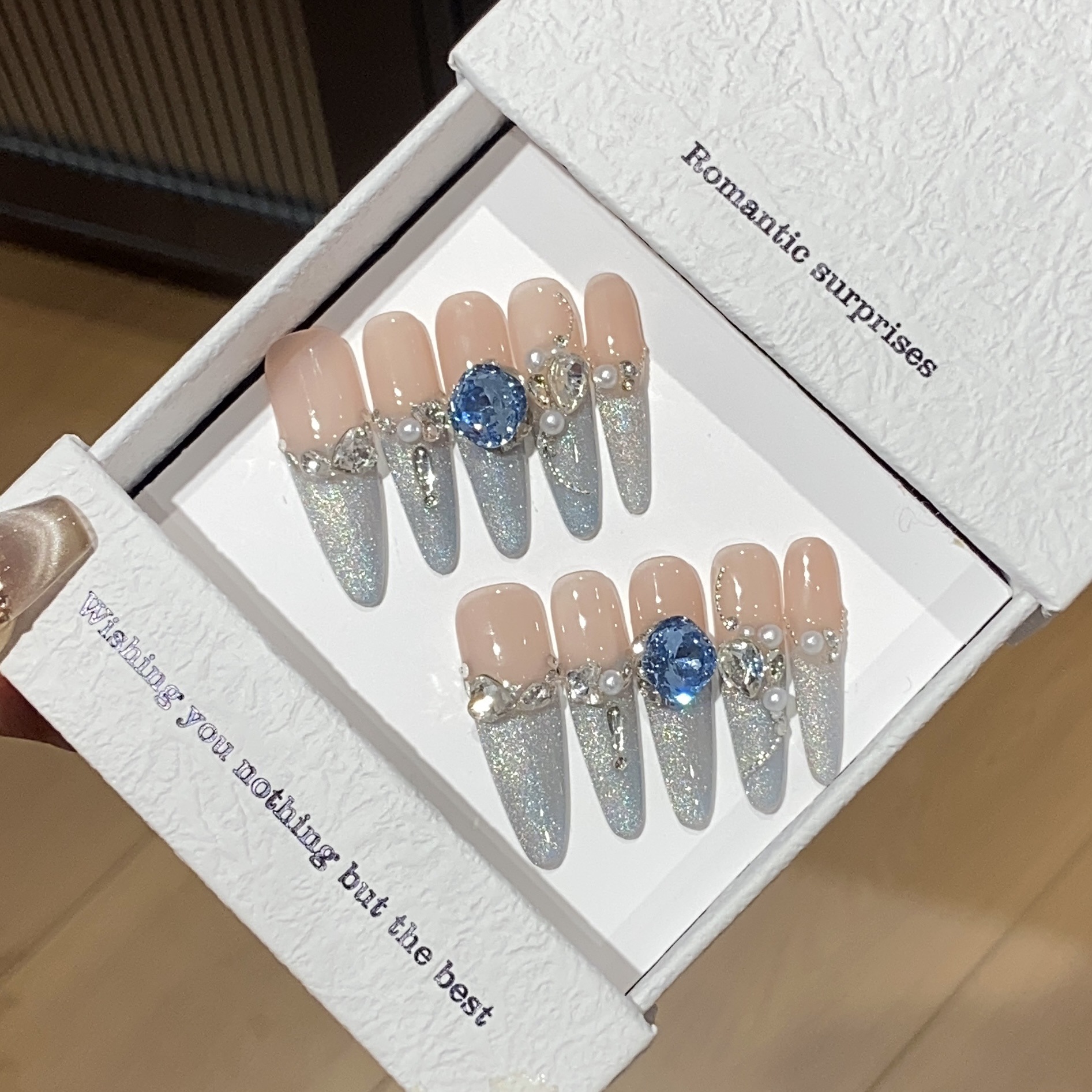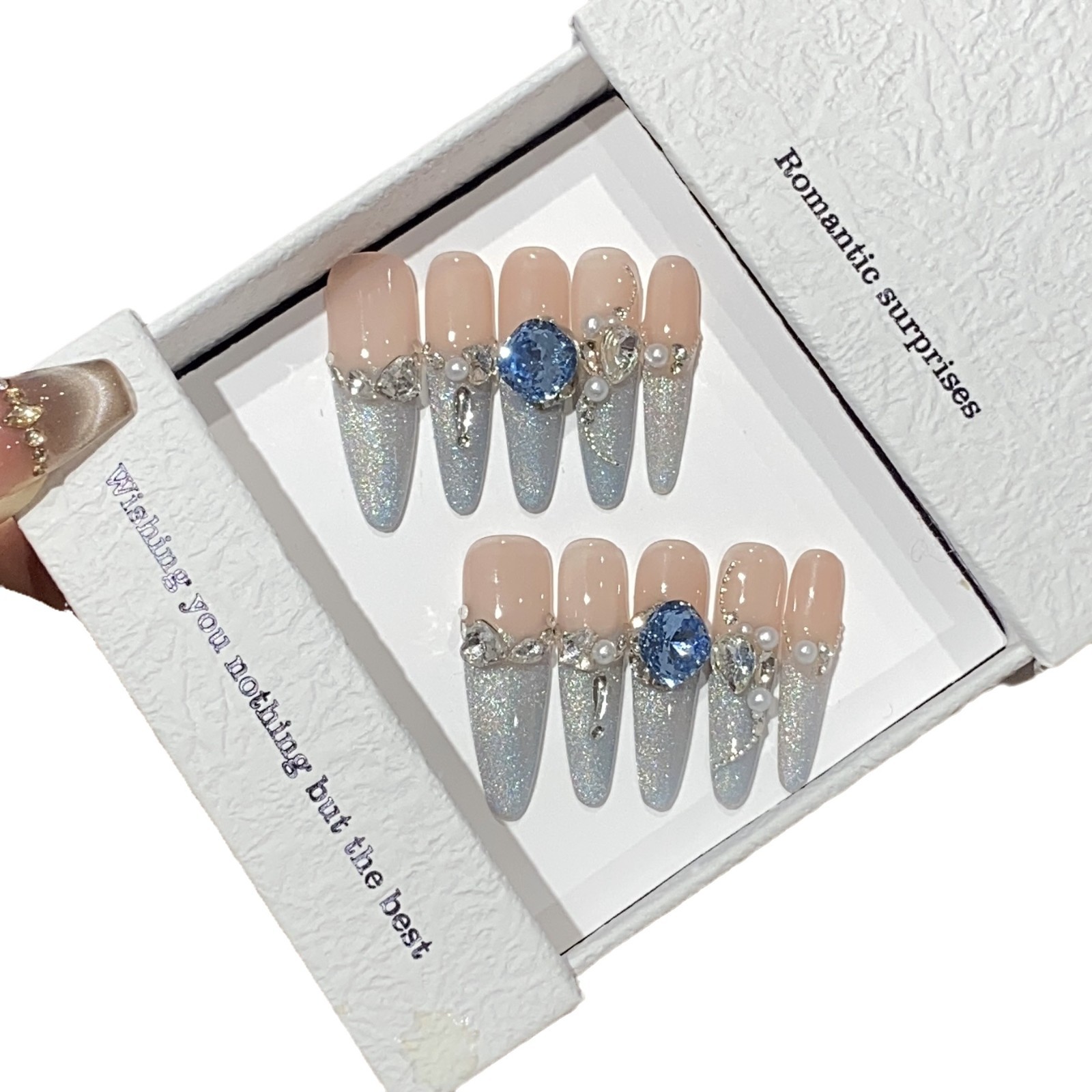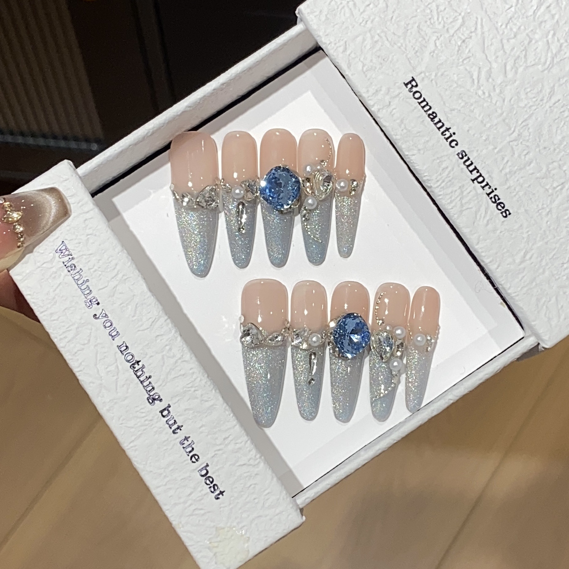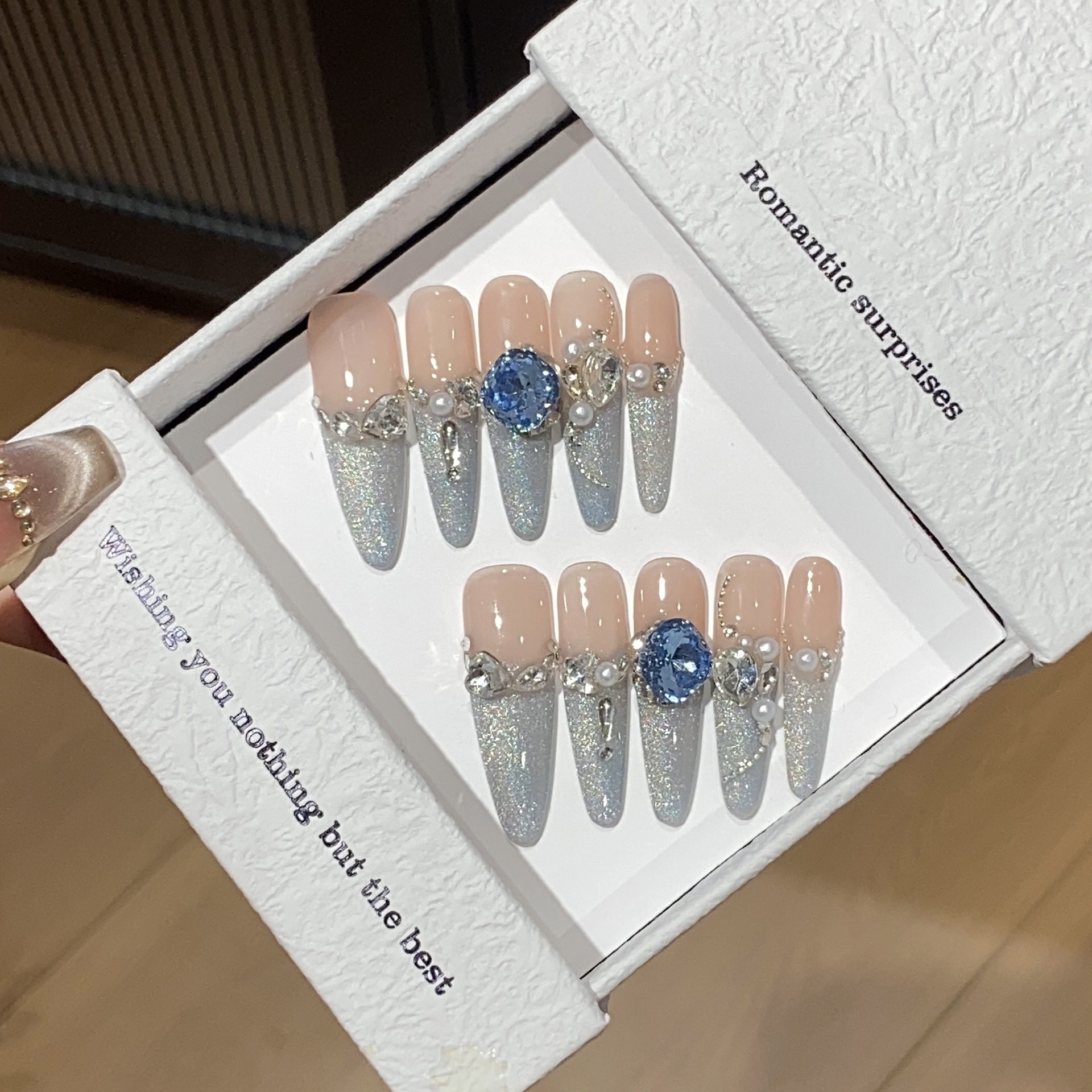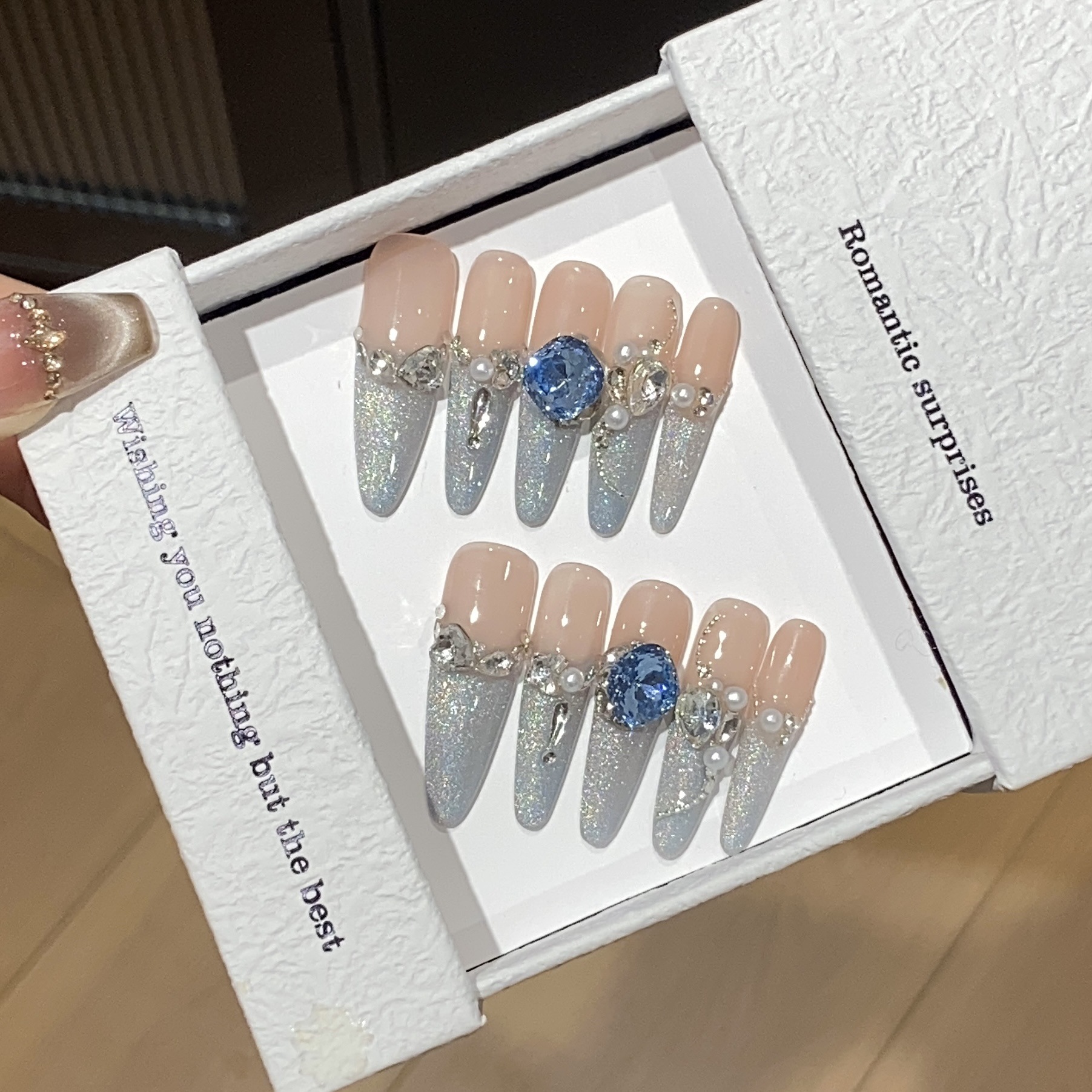 一只顾美甲 【Y】纯手工蓝色渐变细闪猫眼天鹅蓝钻海盐出逃贴片穿