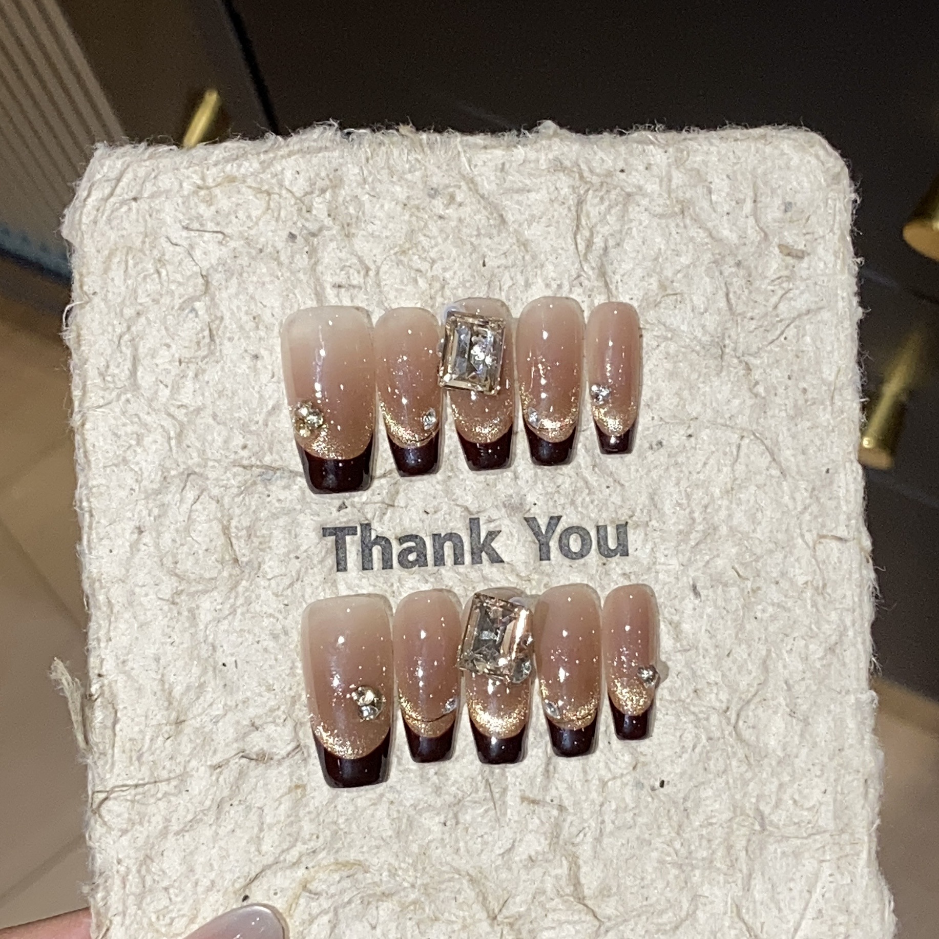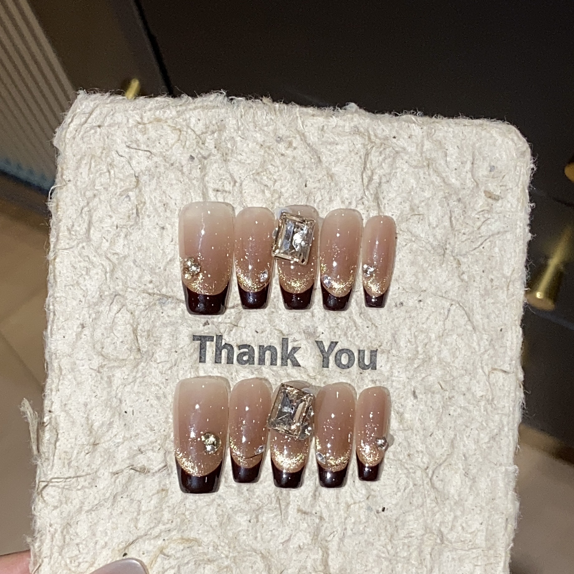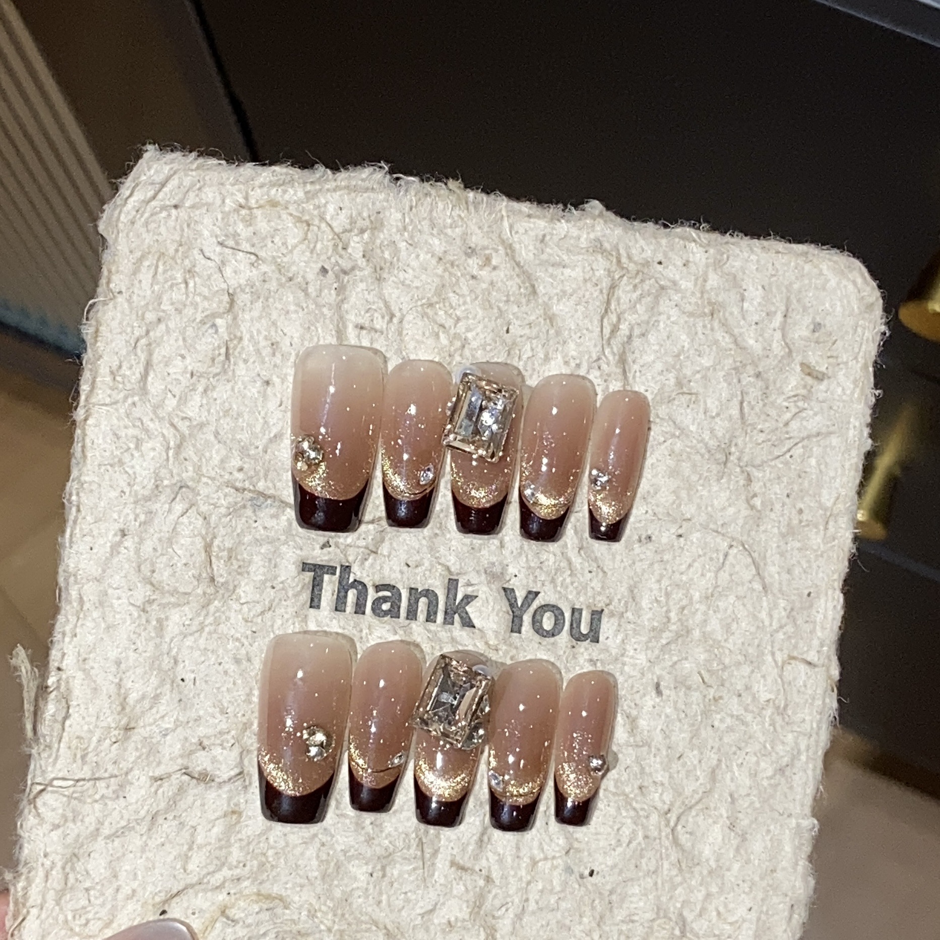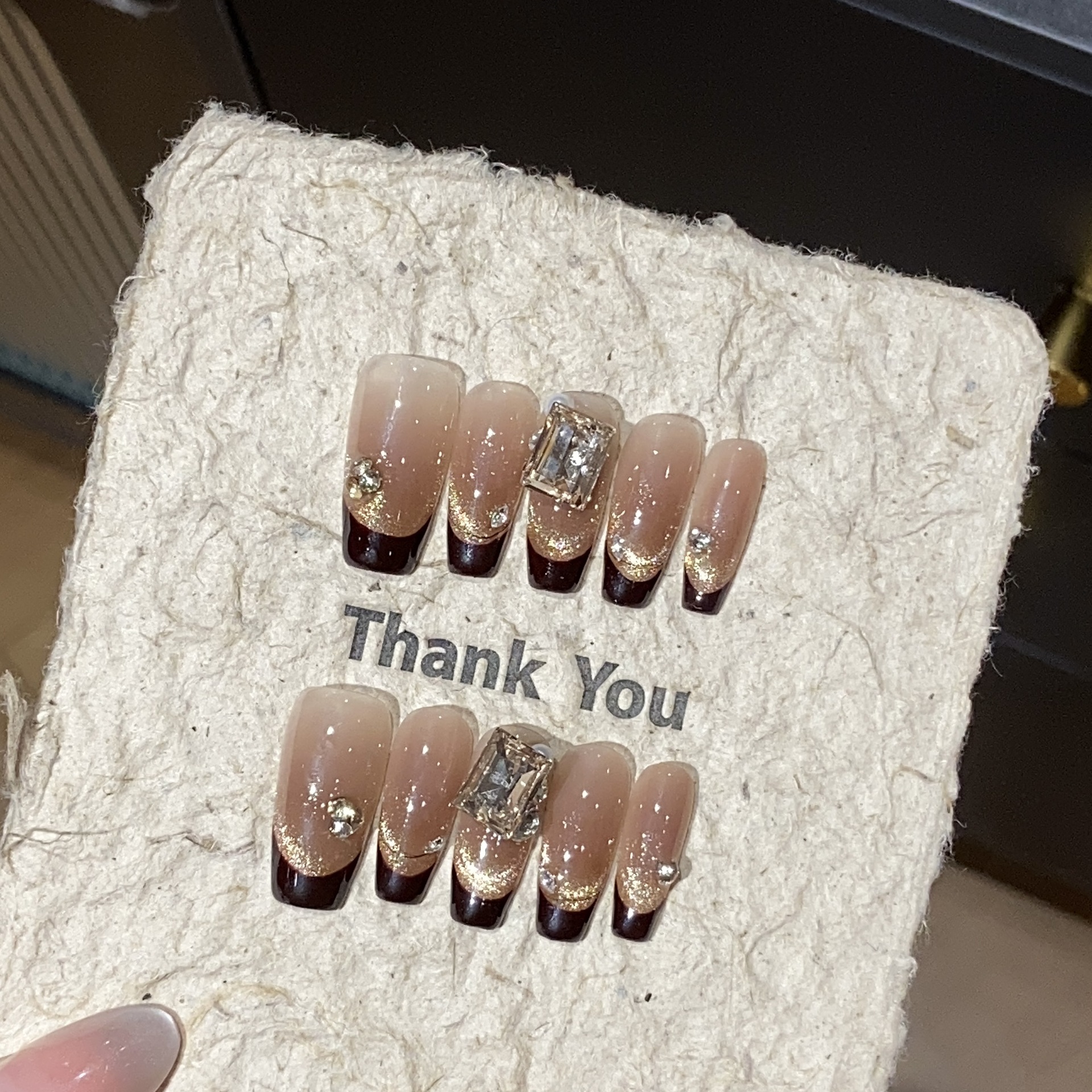 一只顾美甲 秋冬气质法式鎏金猫眼堆堆长方钻乌龙法式贴片穿戴甲