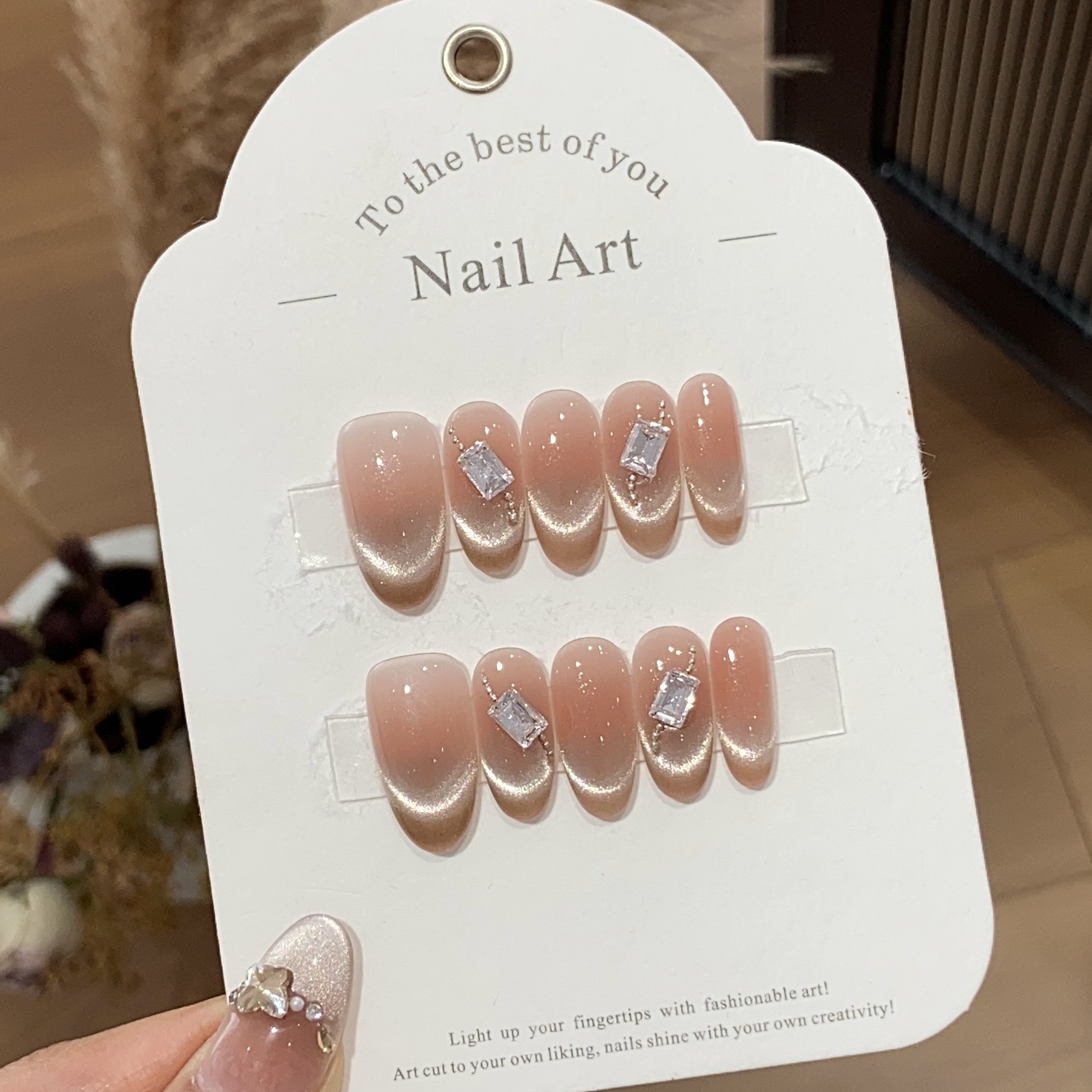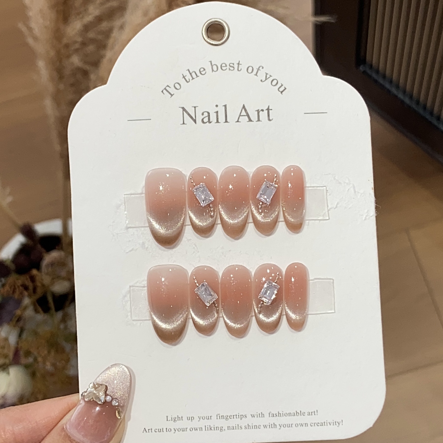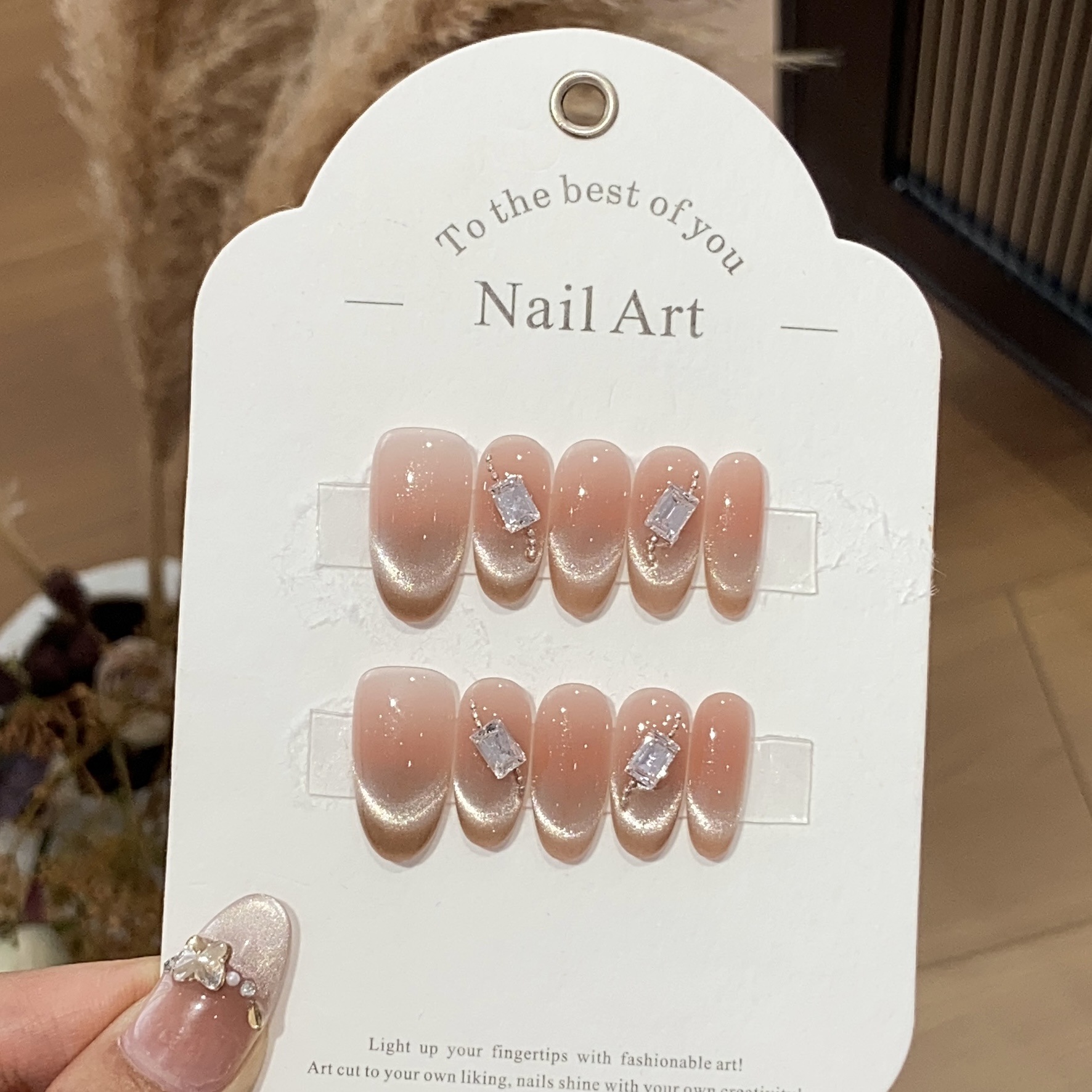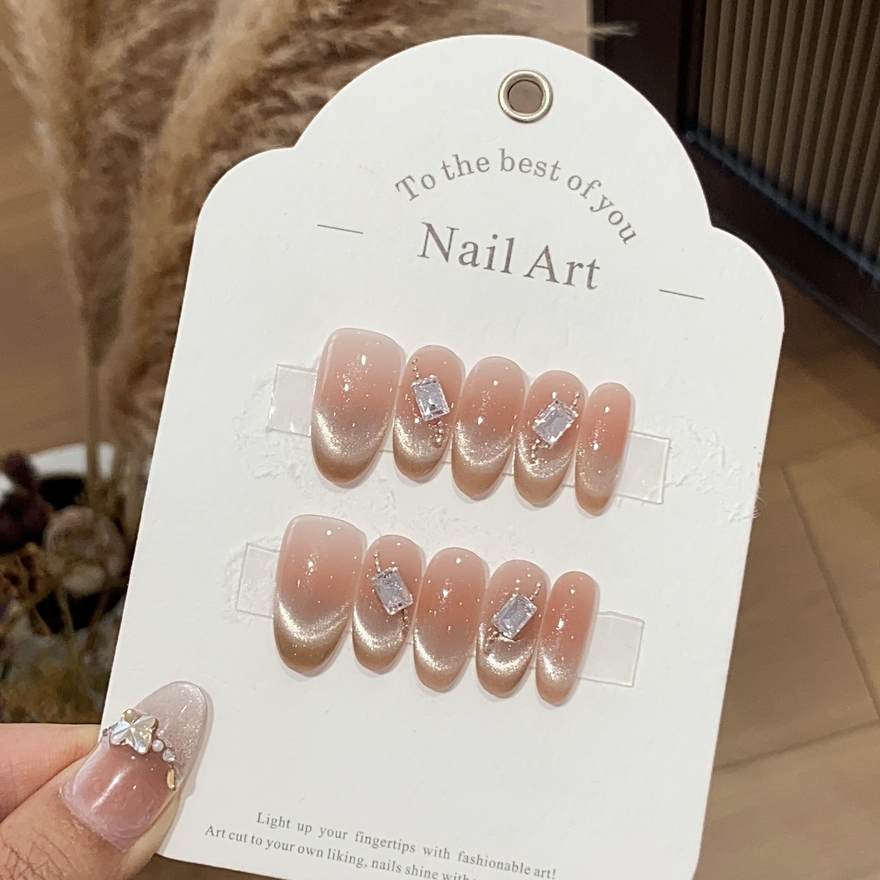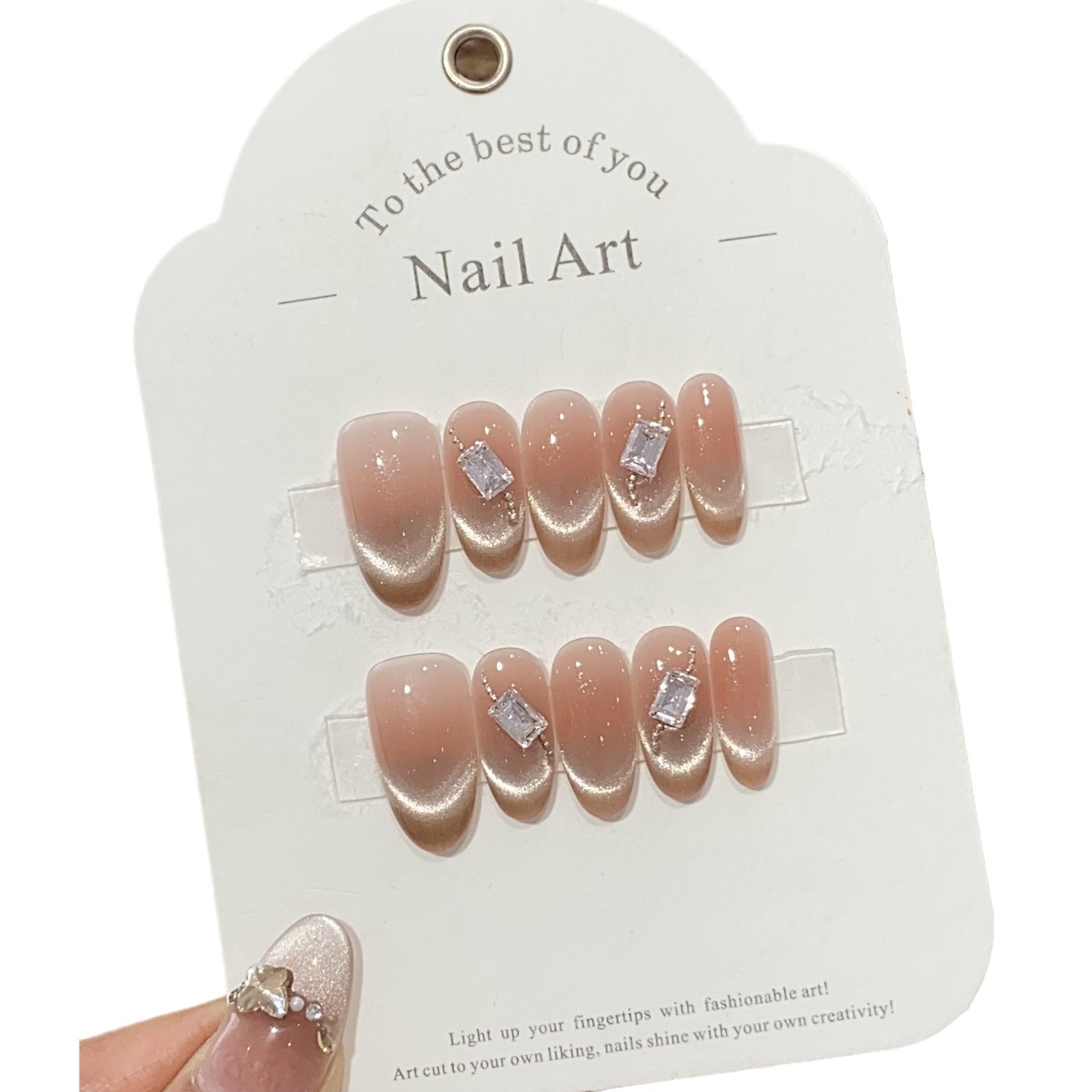 一只顾美甲 冰透水蜜桃粉法式猫眼长方钻链条豆沙奶酥可拆卸甲片