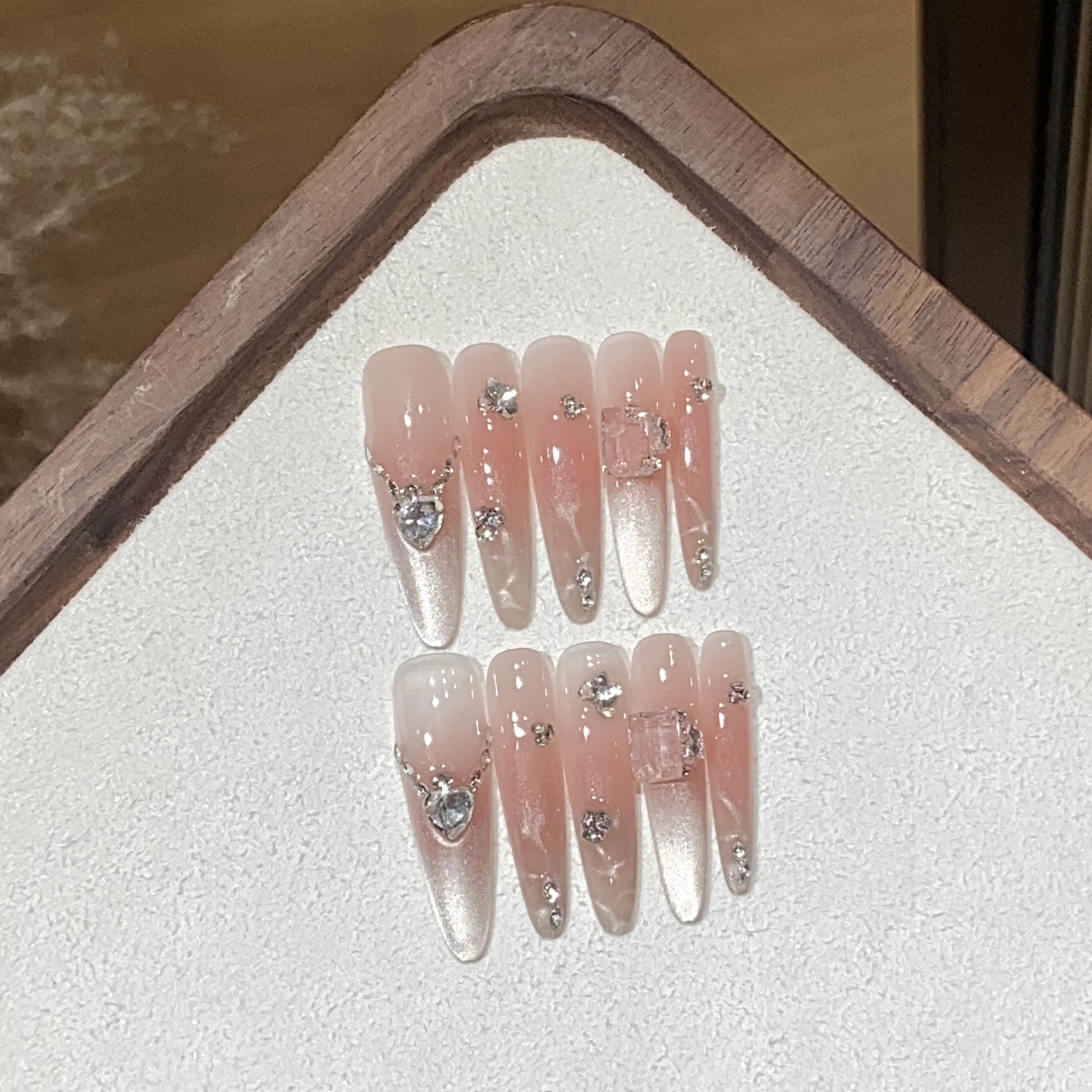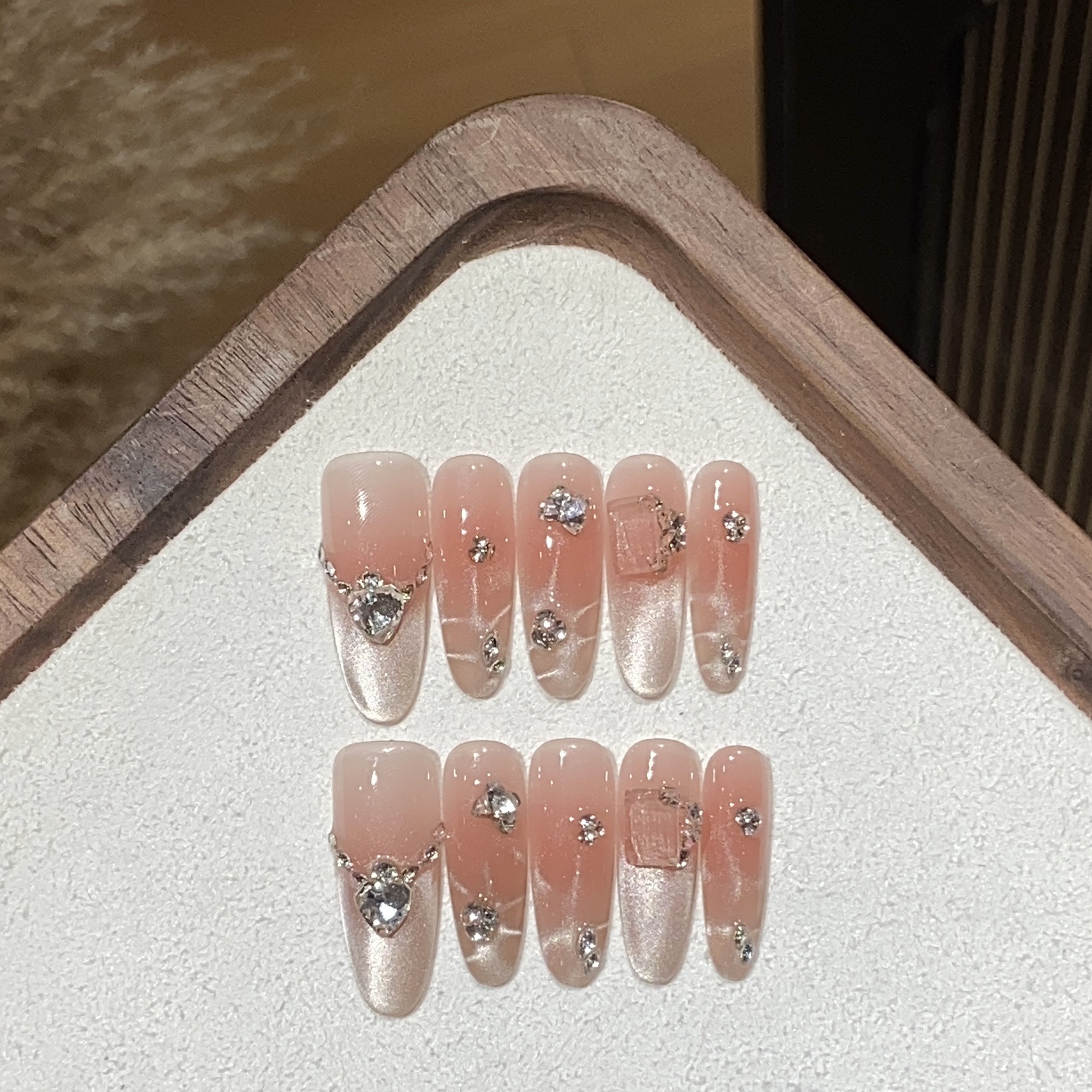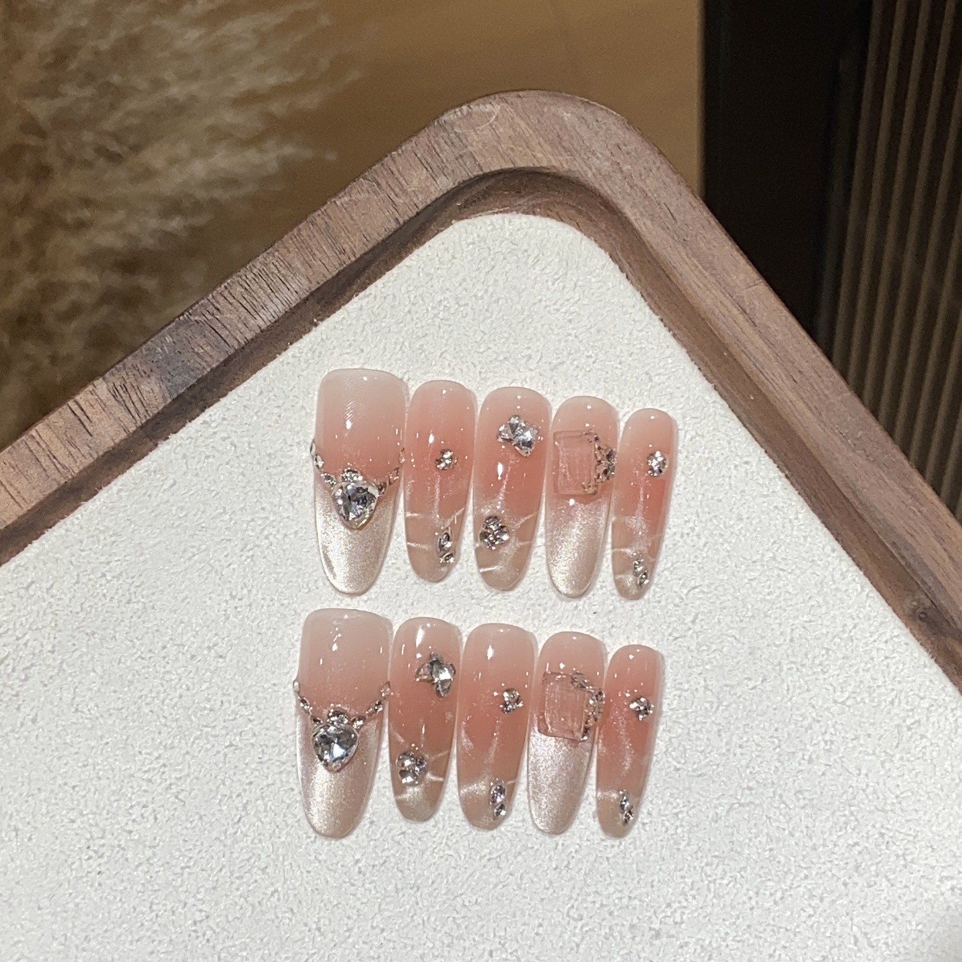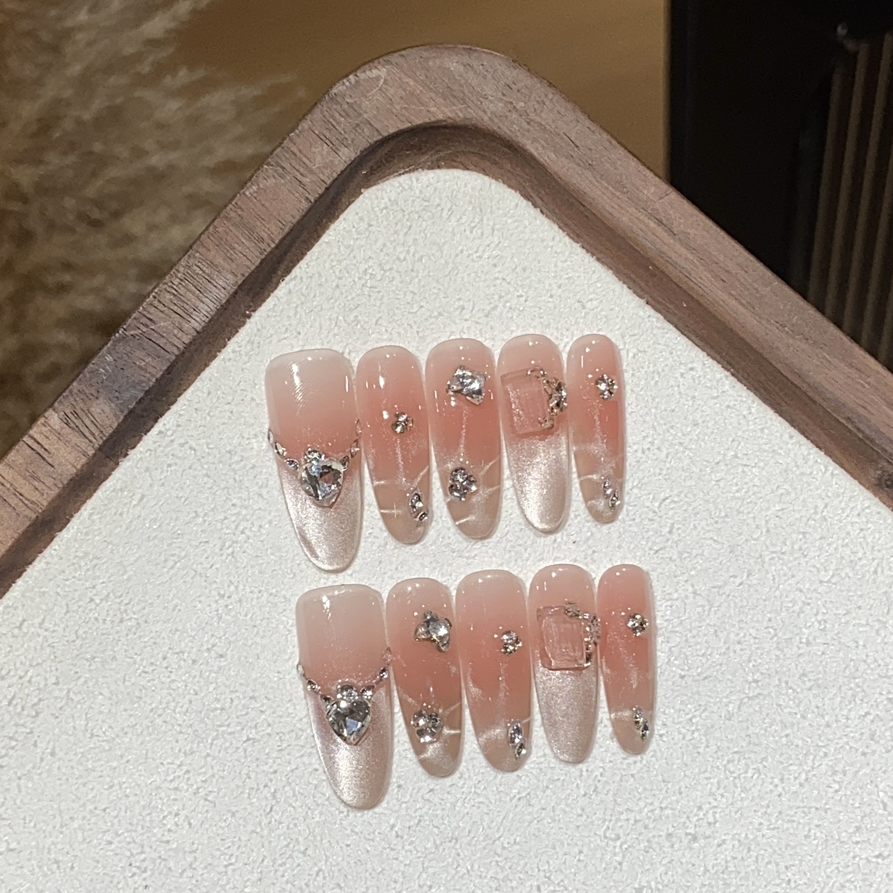 一只顾美甲 手工冰透猫眼渐变法式堆钻透明方钻浮光锦贴片穿戴甲