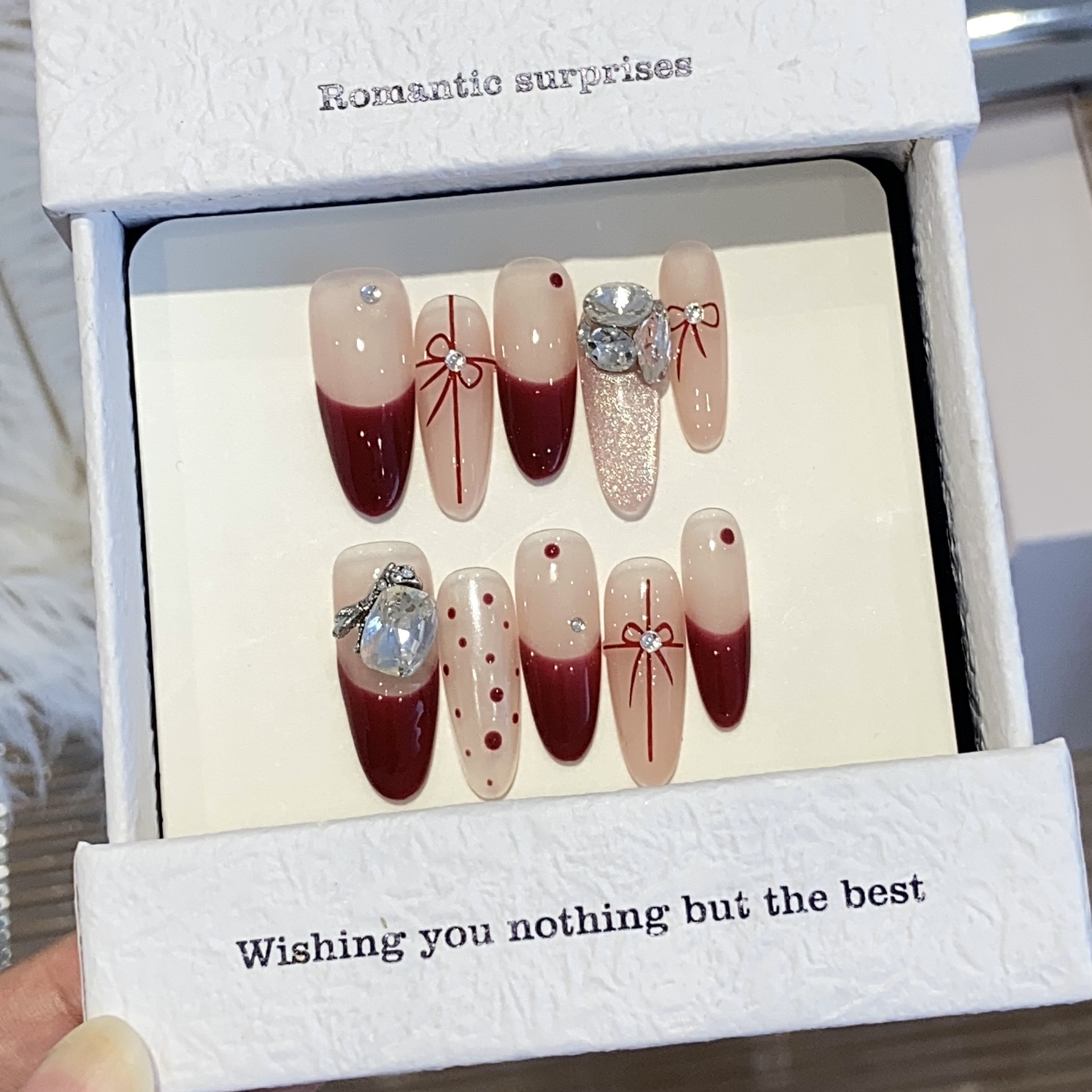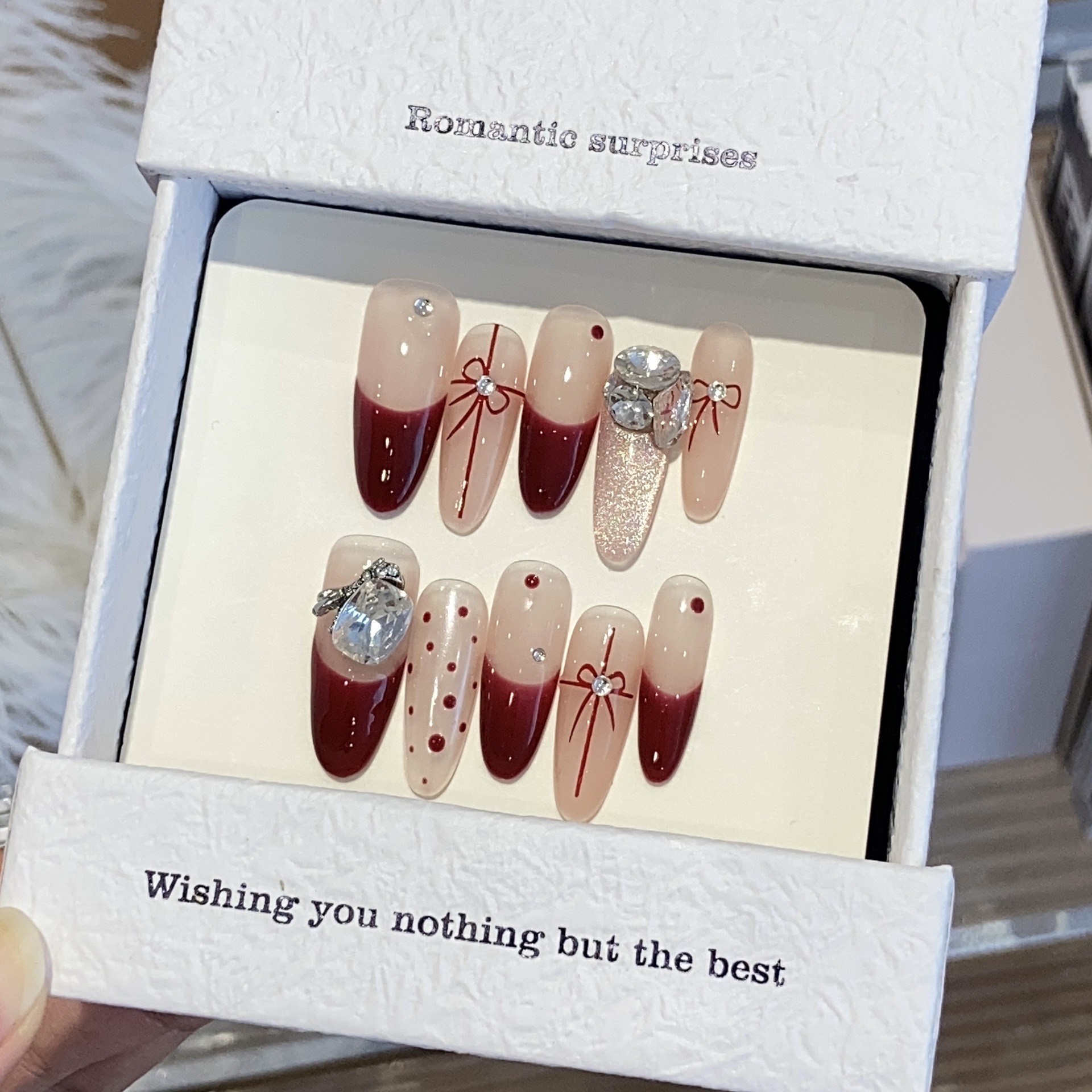 一只顾美甲 酒红纯色合金蝴蝶结法式丝带堆钻梦幻舞会高级穿戴甲