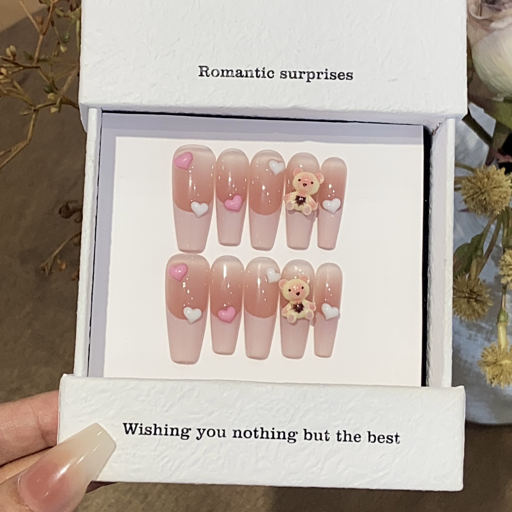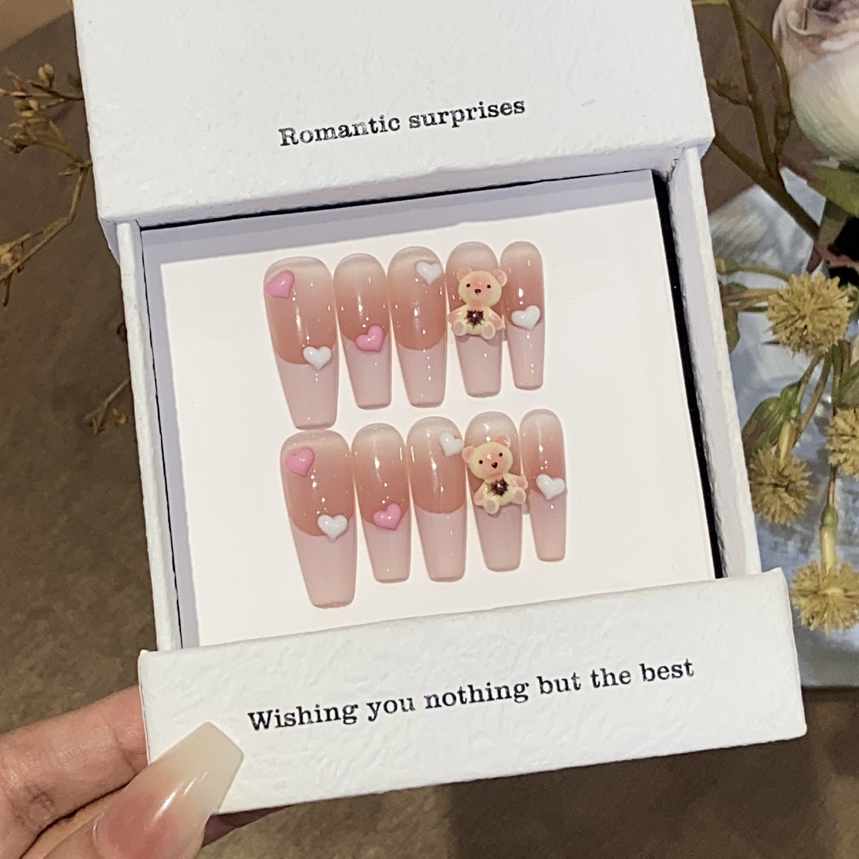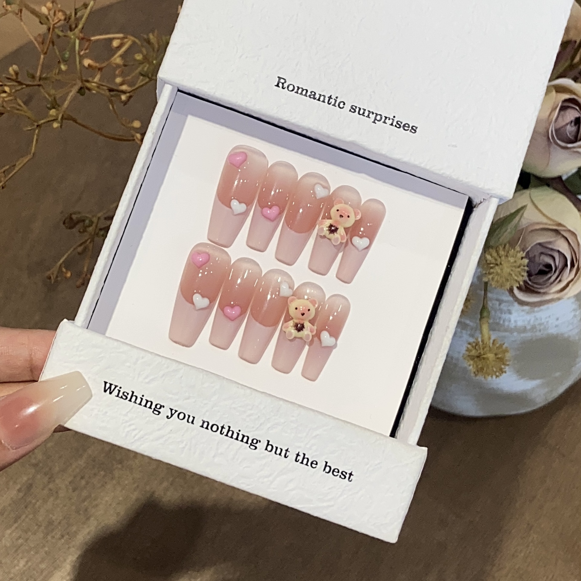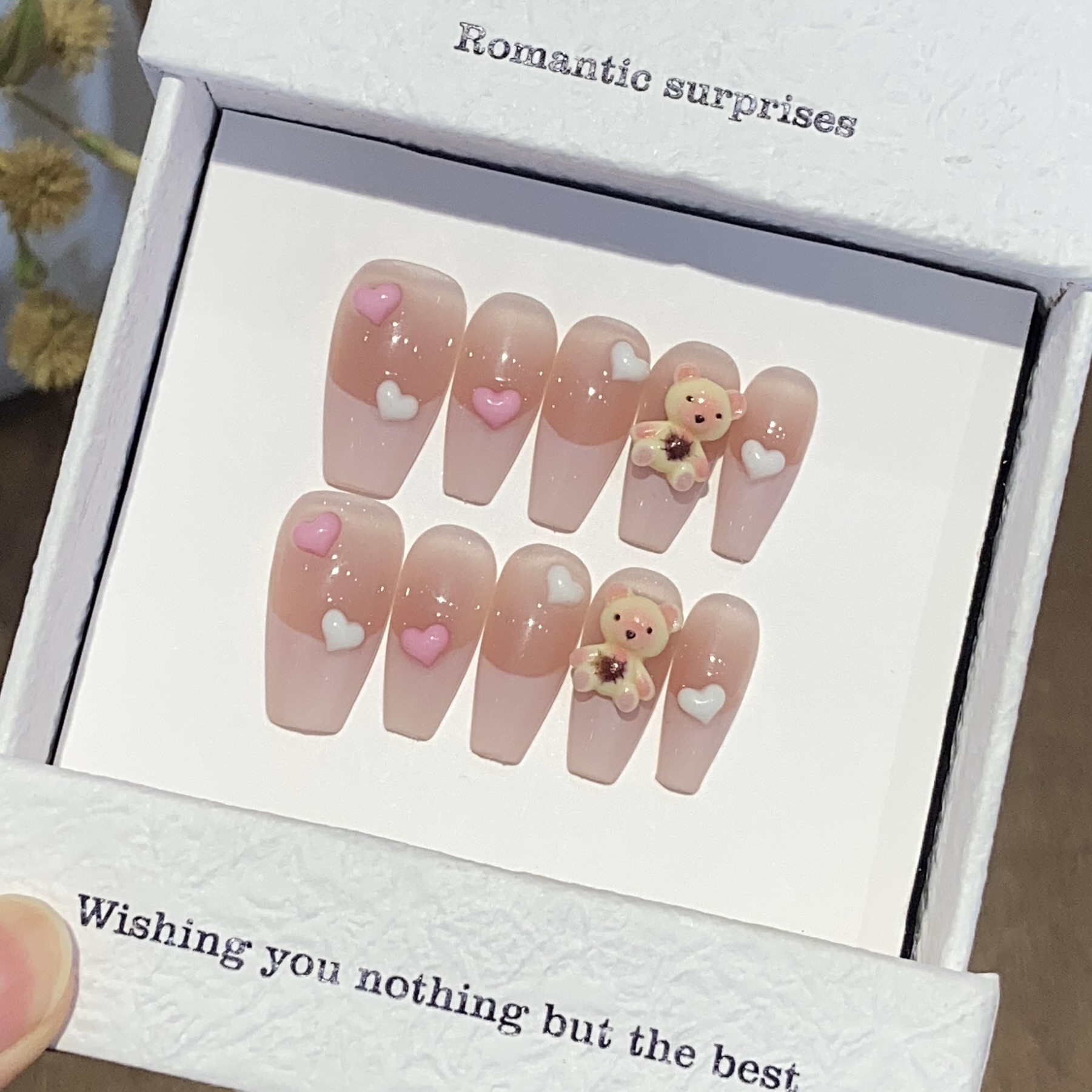 一只顾美甲 纯手工卡通可爱风腮红晕染法式小熊抱抱甜心美甲批发
