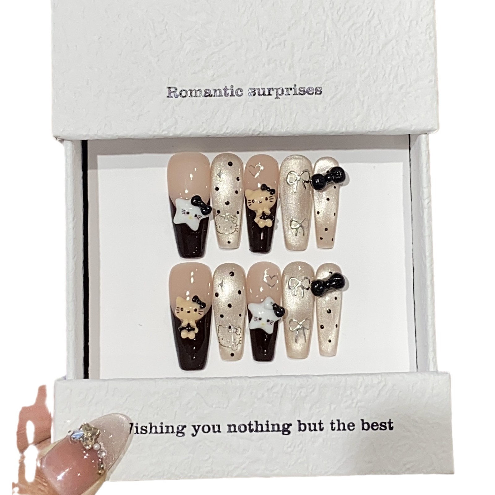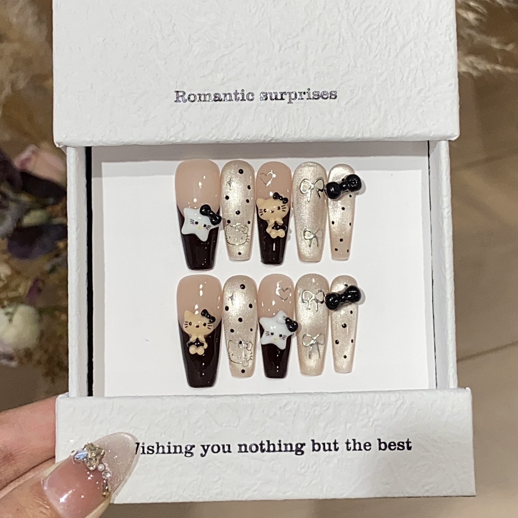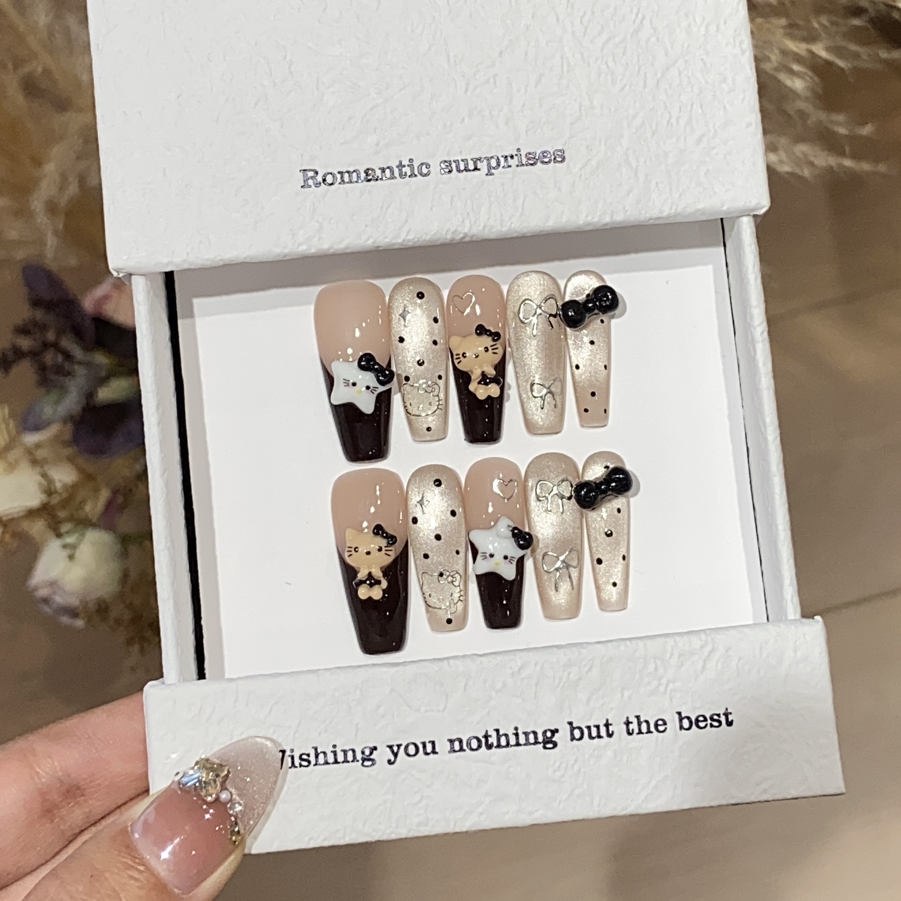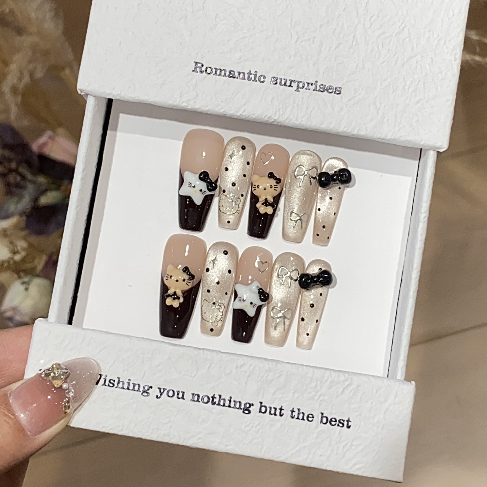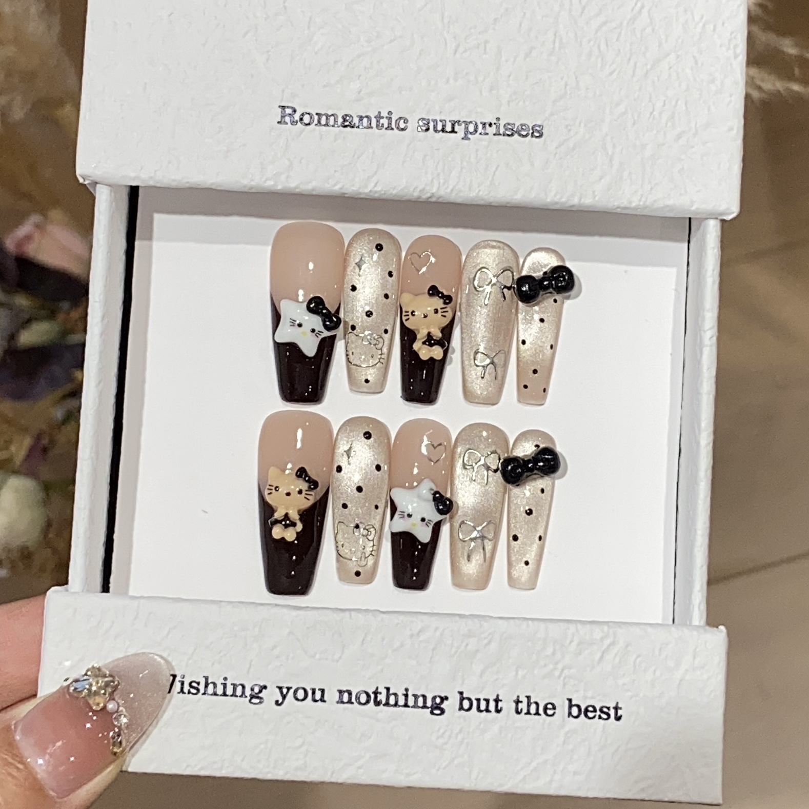 一只顾美甲【Y】 甜美少女感黑色法式宽光猫眼波点蝴蝶结甜心小猫