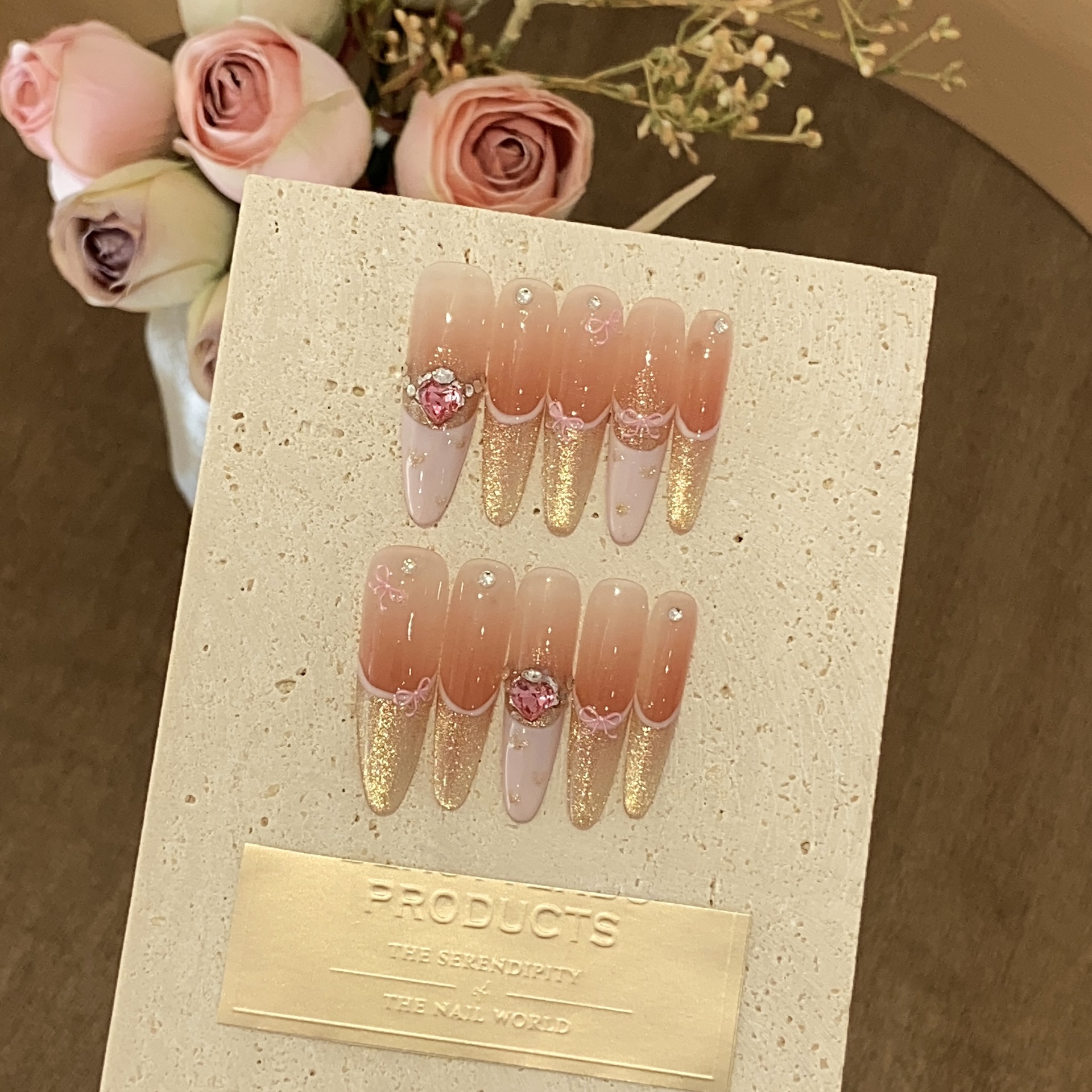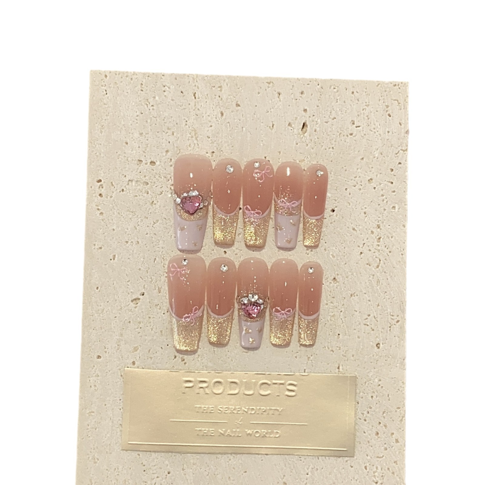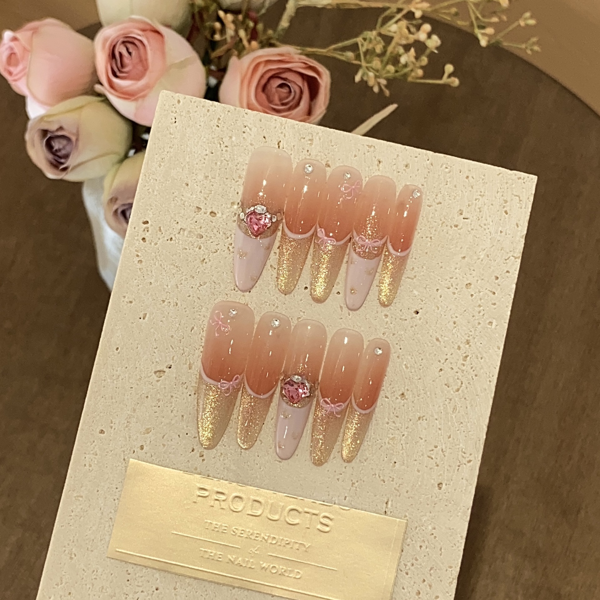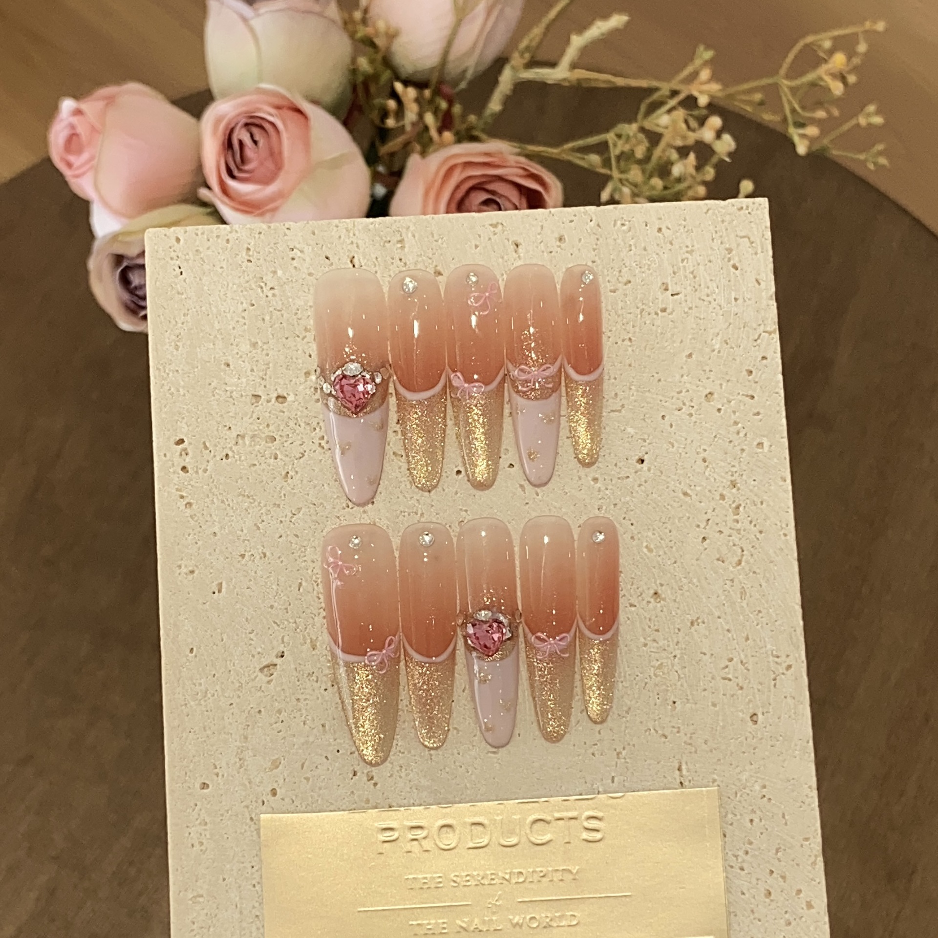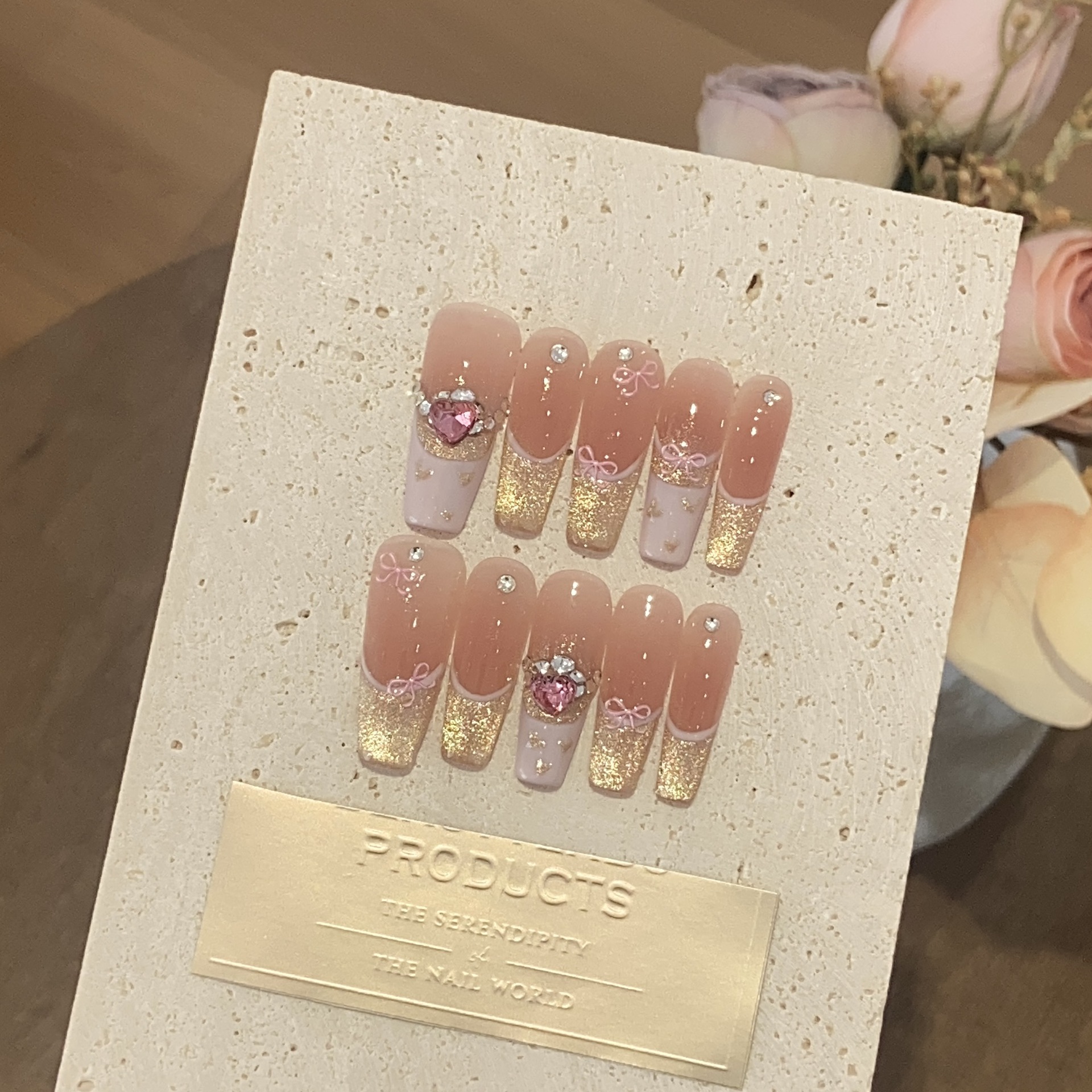 一只顾美甲 手工金色爆闪白色细边法式粉色爱心钻丘比特之心贴片