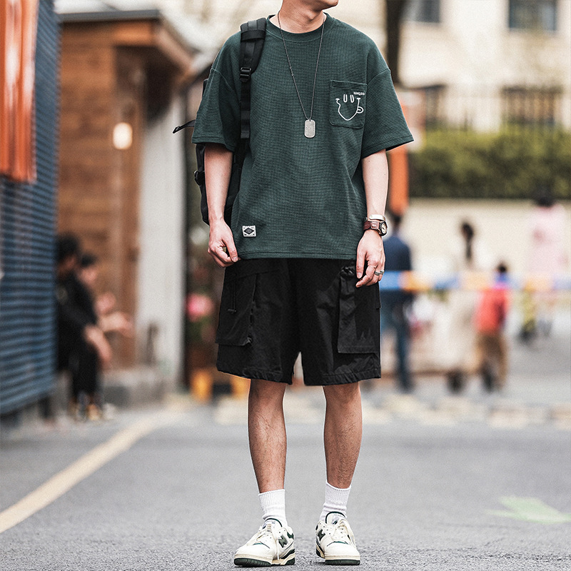 日系潮牌华夫格短袖T恤男夏季潮流胖子加肥加大码宽松半袖体恤衫