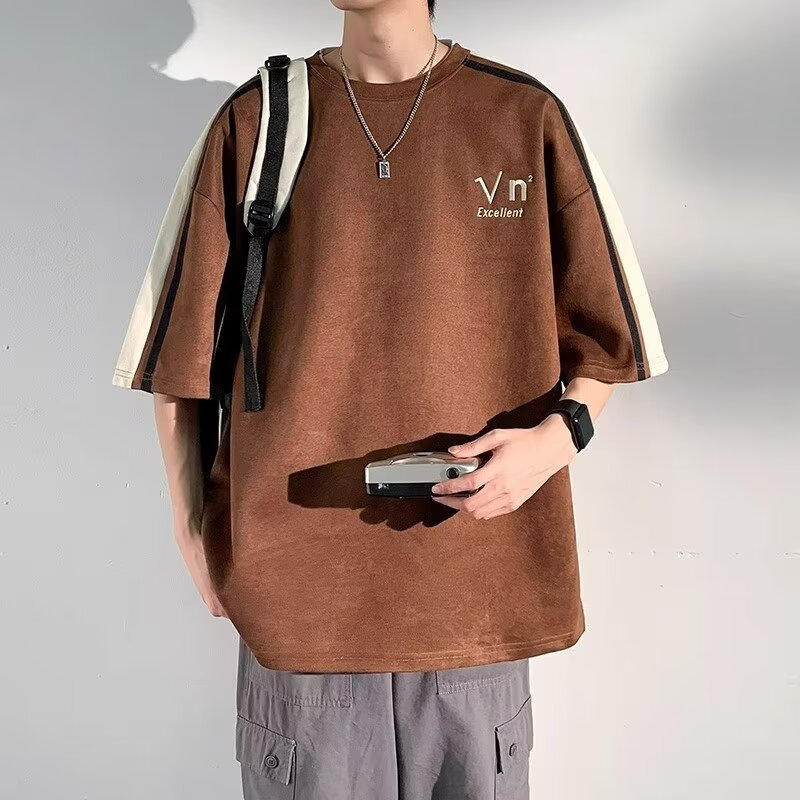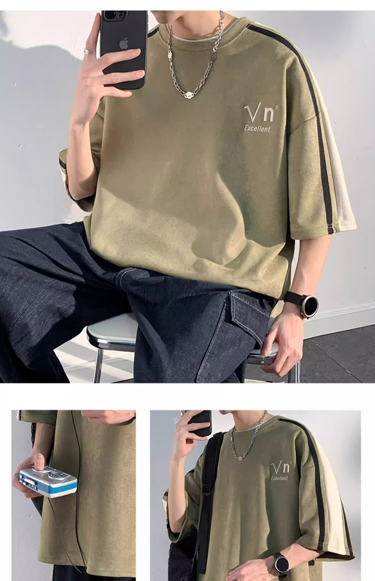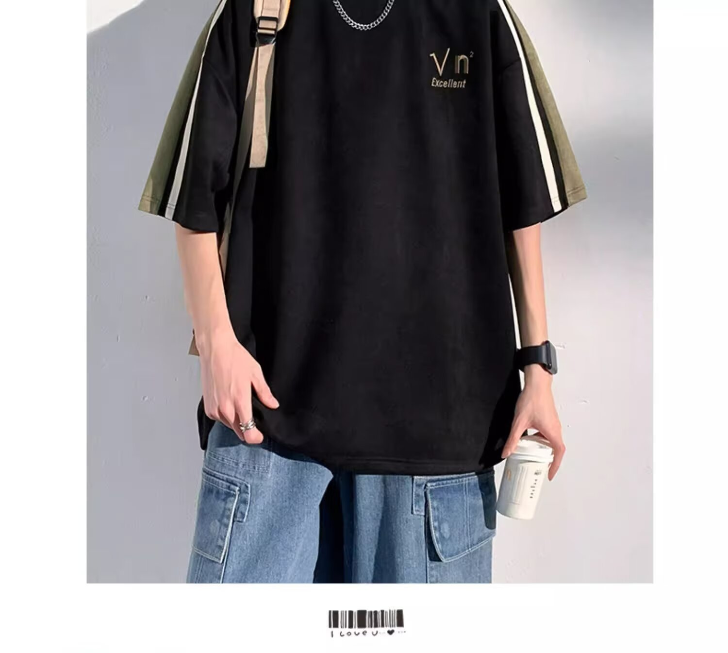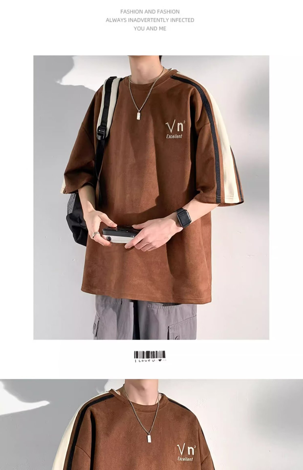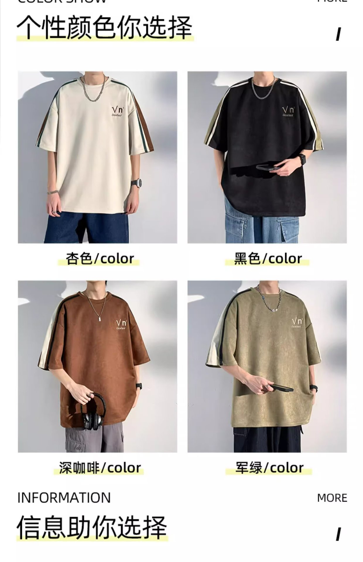 美式潮牌麂皮绒短袖t恤男士夏季刺绣上衣大码宽松港风ins休闲体恤