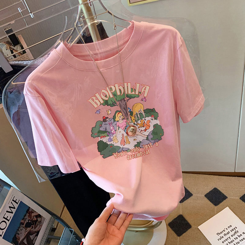 2025夏季新款设计感小众卡通图案纯棉粉色短袖t恤女宽松百搭上衣