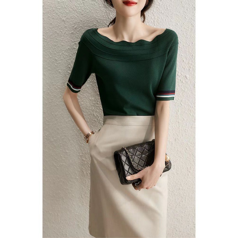 法式小众露锁骨短袖针织T恤女夏季新款感绿色一字肩短款上衣