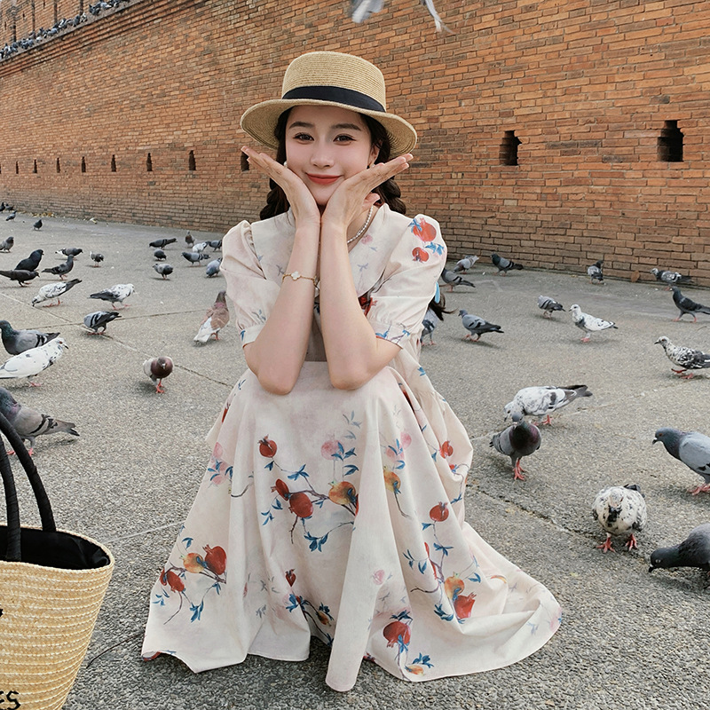 法式浪漫夏季国风石榴连衣裙复古翻领盘扣短袖气质休闲大摆裙