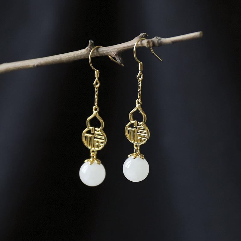 天然白玉s925银鎏金葫芦福字时尚潮流风女款耳环工艺耳坠中式耳饰