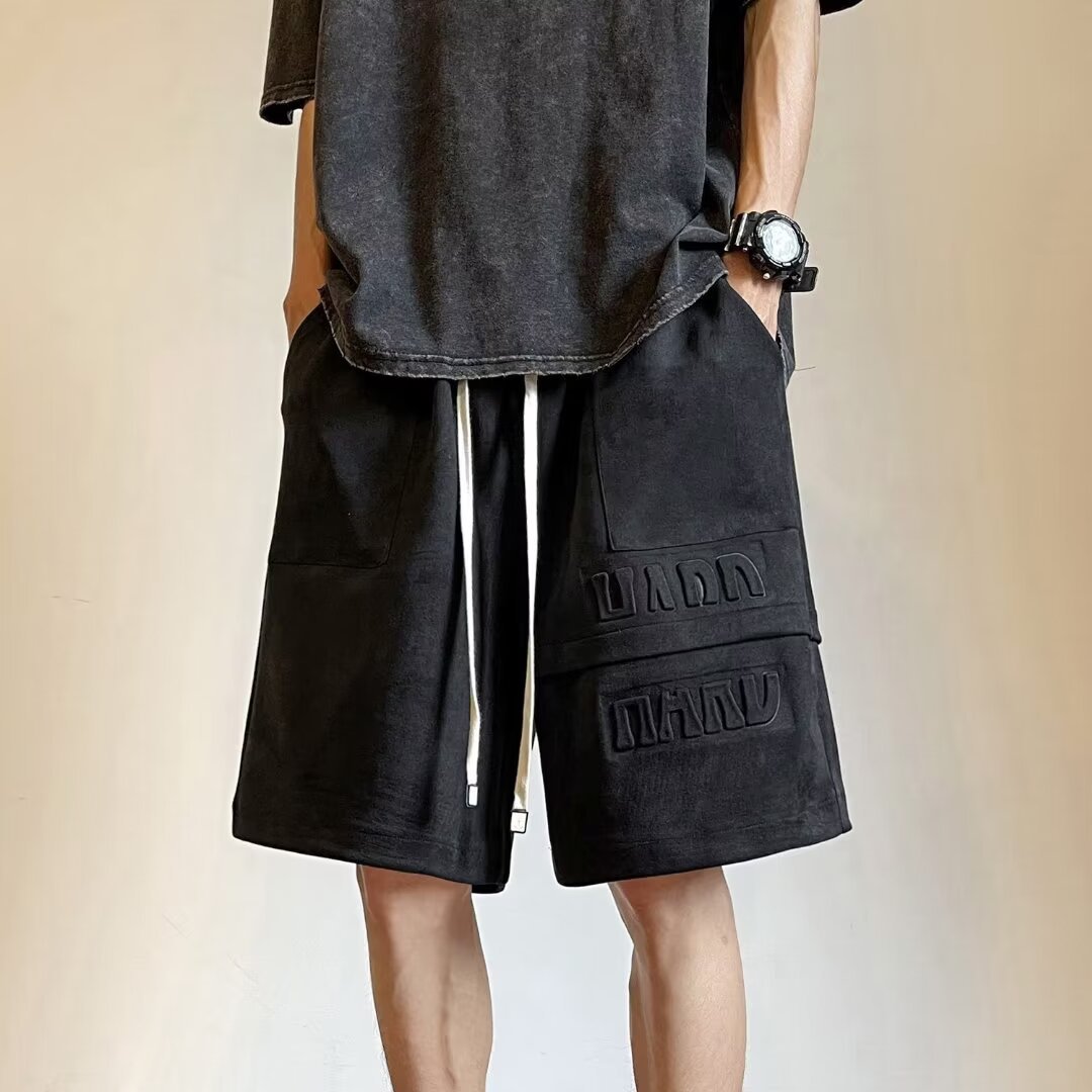 美式复古麂皮绒短裤男夏季潮牌宽松大码高街拼接运动休闲五分中裤
