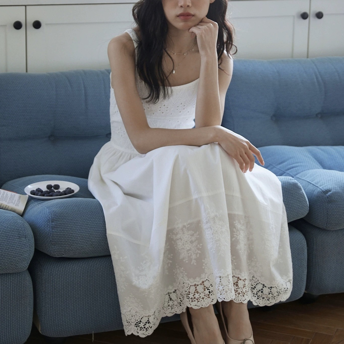 法式刺绣吊带连衣裙女春夏款收腰内搭a字长款白色裙子